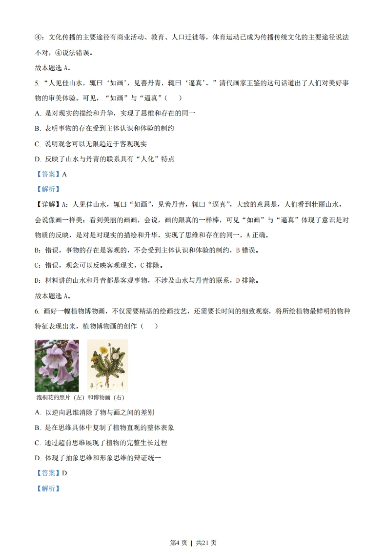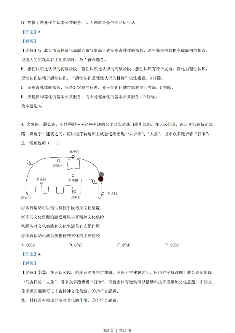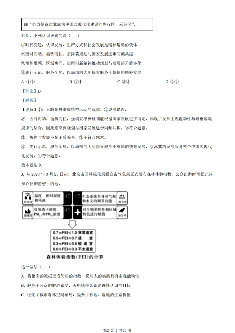 2023年北京市高考政治试卷一、第一部分,本部分共15题,每题3分,共45分。在每题列出的四个选项中,选出最符合题目要求的一项。1.红色文化主题游一一“进京赶考之路(北京段)”示意图重走“进京赶考之路”,是追忆也是洗礼,其意义在于()0中国共产香山革命党领导解放0毛泽东战争走向全纪念馆等中共中国胜利、新顺和园中共中央益寿堂清华园央领导人民主主义革香山驻地车站旧址从西柏坡命取得伟大旧址0中共中央领导抵京。胜利的总指人与民主人士代挥部。表在此畅谈,讨论新中国成立的相关事宜。①感受社会主义建设新征程的开启②感悟共产党人“赶考”的清醒与坚定③了解生产关系的根本性改变④不忘初心,汲取前行力量A.①②B.①③C.②④D.③④【答案】C【解析】【详解】①:2021年,我国全面开启建设社会主义现代化国家新征程,①不符合题意。②④:重走“进京赶考之路”,重温解放战争、新民主主义革命、新中国成立的历史,感悟共产党人“赶考“的清醒与坚定,有利于不忘初心,汲取前行力量,②④符合题意。③:“进京赶考之路”中,生产关系没有根本性改变,③不符合题意。故本题选C。2.在习近平新时代中国特色社会主义思想引领下,京津冀协同发展不断书写新篇章。三场京津冀协同发展座谈会,看中国的京津冀,看京津冀里的中国。◇2014年第一次座谈会召开之际,中国经济发展进入新常态。座谈会提出要把京津冀协同发展上升为国家战略。◇2019年第二次座谈会召开之际,我国社会主要矛盾己发生了事关全局的历史性变化,此次座谈会重点指向的正是解决发展不平衡不充分问题。◇2023年第三次座谈会召开之际,新时代进入新征程。此次座谈会明第1页」共21页
