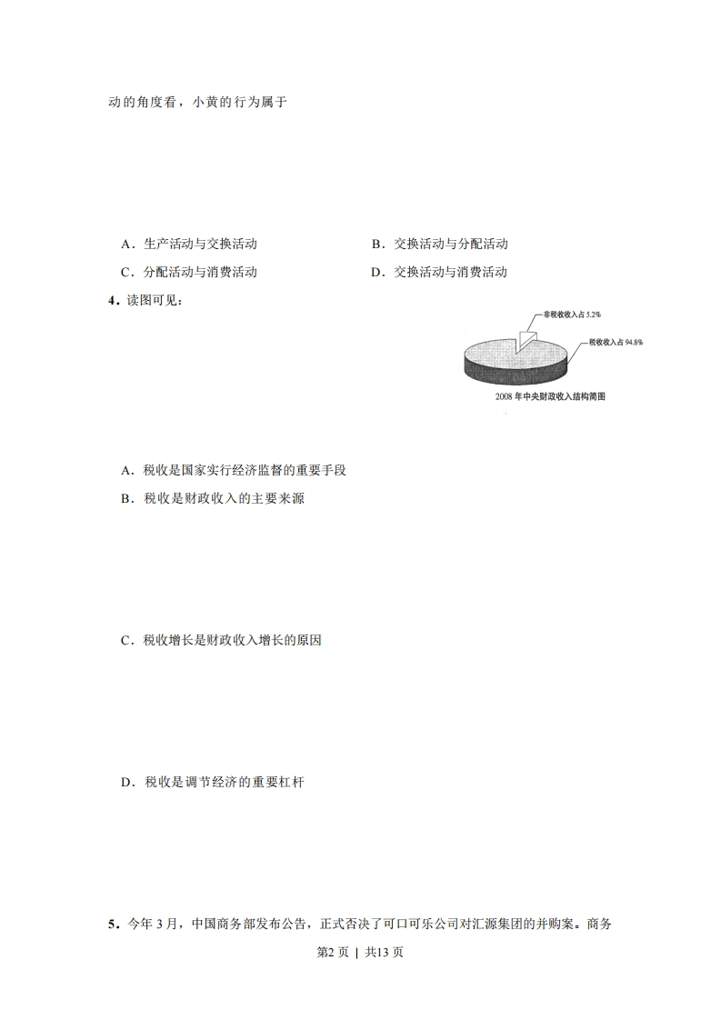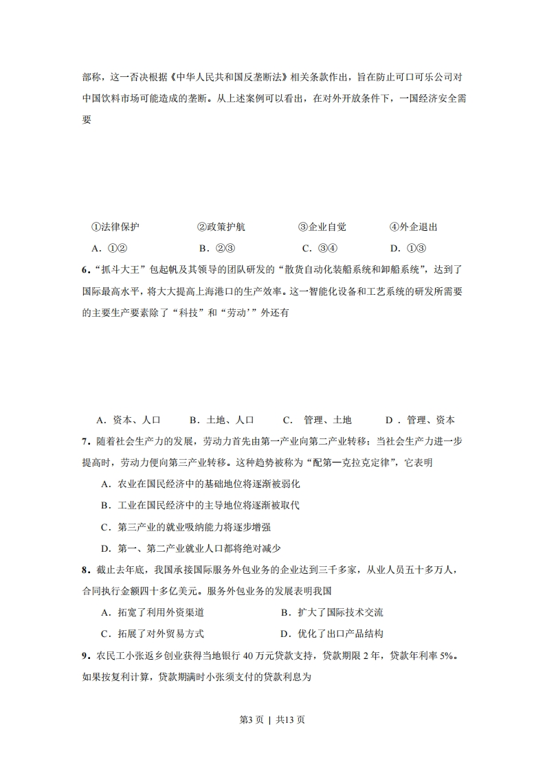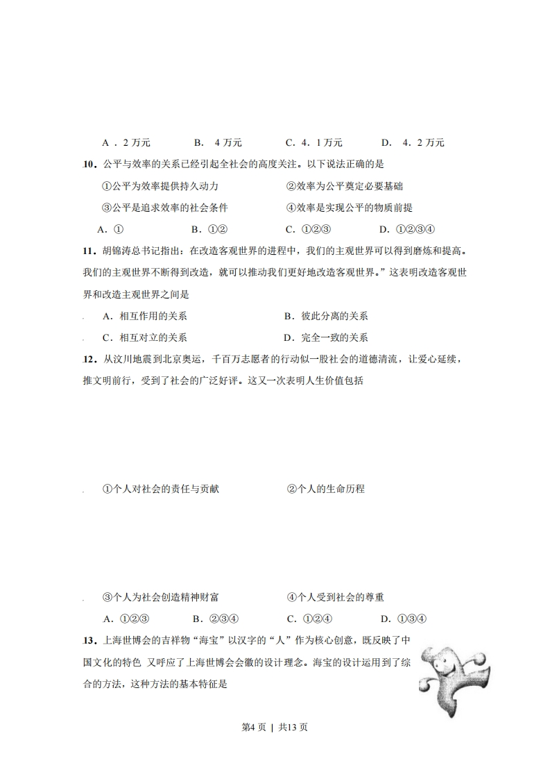 绝密★启封前2009年普通高等学校招生全国统一考试政治(上海卷)一、单项选择题(共30分,每题2分,每题只能选一个选项)1.1949年10月1日,毛泽东主席在天安门城楼上庄严宣告:中华人民共和国中央人民政府成立了。当时中央人民政府是指整个中央一级的国家机关,而现在我国的“中央人民政府”是指A.全国人民代表大会B.中国人民政治协商会议全国委员会C.国务院D.中国共产党中央委员会2,青年学生要增强政治参与意识,提高政治参与能力。我们的政治参与应当是有序的,所谓“有序”即指A.直接B.全面C.依法D.集体3。小黄在网上购得《高考1977》电影票,去电影院观赏了这部感人的影视作品,从经济活第1页|共13页