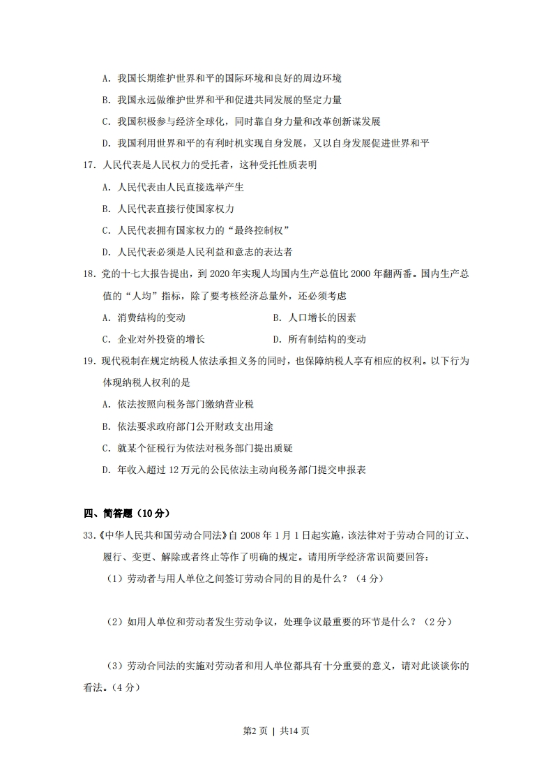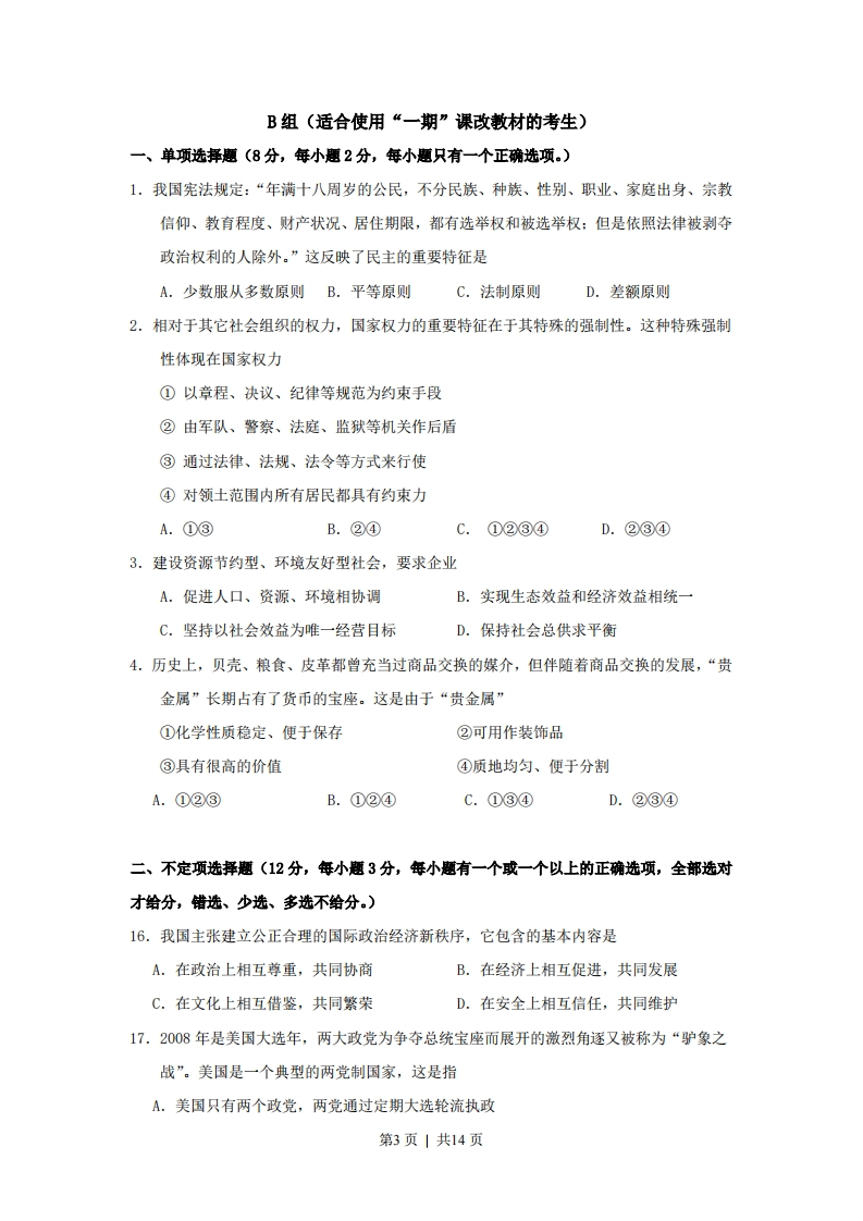 绝密★启封前2008年普通高等学校招生全国统一考试政治(上海卷)分叉部分A组(适合使用“二期”课改教材的考生)一、单项选择题(8分,每小题2分,每小题只有一个正确选项)1.2003年至2007年,最高人民法院共审结各类案件20451件。这体现了人民法院代表国家依法行使A.检察权B.立法权C.审判权D.行政权2.今年“两会”召开前,多名农民工建议全国人大代表向“两会”提交一份关于农民工医疗、养老等问题的提案。农民工的行为是A.依法直接参与民主决策B.依法间接参与民主决策C.依法直接参与民主管理D.依法间接参与民主管理3.2008年4月,国务院扶贫办草拟的扶贫标准调整办法把贫困标准从2007年的1067元提高到1300元,首次达到国际标准。这一标准不仅关注贫困人口维持基本生存所需要的收入,还考虑他们在教育医疗方面的支付能力。上述材料可以看出A.贫困线标准的提高不利于我国减贫事业的发展B.与国际标准接轨是减贫工作的根本出发点和落脚点C.贫困线标准的提高标志着我国已经全面建成小康社会D.新标准在保障基本生存的基础上加入了促进发展的理念4.在一些银行理财产品宣传单上常出现“包赚不赔”、“高收益”等字眼,而必要的风险提示很不明显。按照《中华人民共和国消费者权益保护法》,此举侵犯了消费者的A.结社权B.知情权C.受尊重权D.获得赔偿权二、不定项选择题(12分,每小题3分,年小题有一个或一个以上的正确选项,全部选对才给分,错选、少选、多选不给分。)16.“始终不渝走和平发展道路”,这是中国政府与中国人民根据时代发展潮流和自身根本利益作出的战略选择。走和平发展道路意味着第1页|共14页