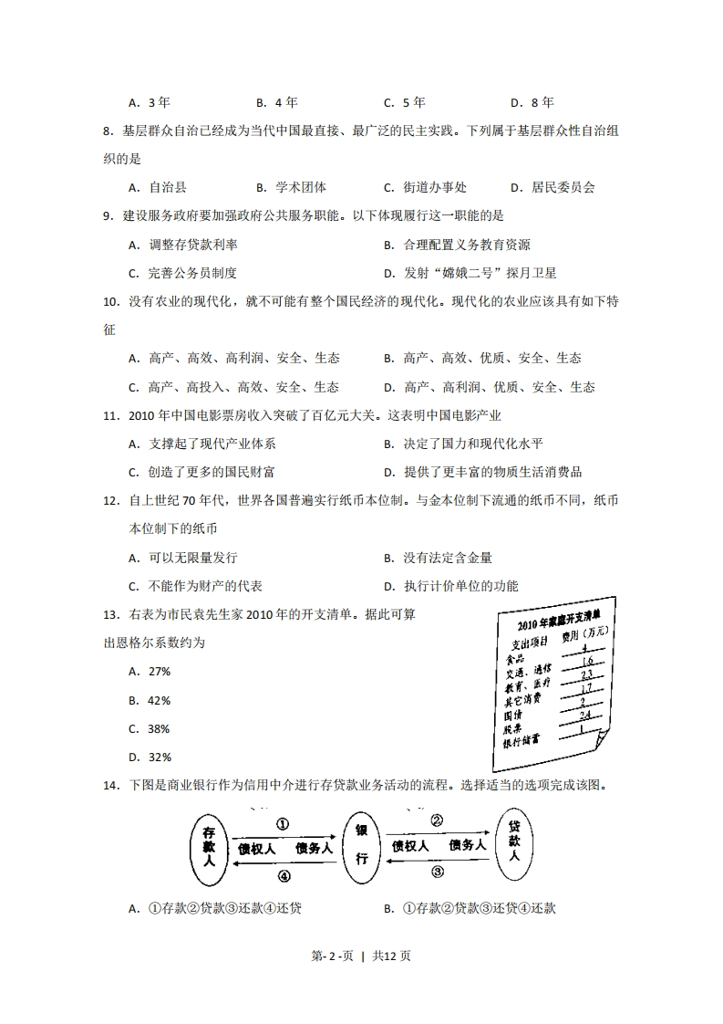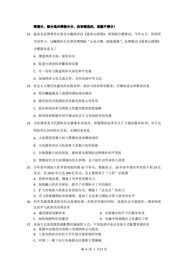 绝密★启封前2011年普通高等学校招生全国统一考试政治(上海卷)考生注意:1.考试时间120分钟,试卷满分150分。2.本考试设试卷和答题纸两部分试卷包括试题与答题要求。所有答题必须涂选择题或写非选择题在答题纸上。做在试卷上一律不得分。3.答题前,务必在答题纸上填写准考证号和姓名,并将核对后的条形码贴在指定位置上。一、单项选择(共42分,每题2分。每题只能选一个选项)1.党的十七届五中全会强调,今后一个时期我国经济社会领域的一场深刻变革是加快转变A.经济改革方式B.经济推进方式C.经济发展方式D.经济增长方式2.作为我国社会主义民主法制建设史上重要里程碑以及中国特色社会主义制度逐步走向成熟的重要标志,到2010年底,我国已经形成了中国特色社会主义A.民主体系B.法律体系C.司法体系D.理论体系3.为迎接建党90周年,2011年5月10日,中共中央总书记、国家主席、中央军委主席胡锦涛作出重要指示,要大力学习宣传优秀共产党员A.吴孟超B.师昌绪C.王振义D.谷超豪4.2011年2月下旬,利比亚局势持续紧张,党中央国务院要求有关方面采取撤离措施,保障我驻利人员生命财产安全。作为中国政府有组织撤离海外中国公民的行动,这是A.建国以来规模最大的B.今年以来规模最大的C.新世纪以来规模最大的D.改革开放以来规模最大的5.2011年4月,金砖国家领导人第三次会晤在海南三亚举行。作为新成员,首次参加会晤的国家是A.南非B.俄罗斯C.越南D.墨西哥6.我国发展武器装备,是维护国家主权、安全和领土完整的需要,不针对任何国家和任何特定目标。近来我国试飞的新型战斗机型是A.F22B.歼-10C.F35D.歼-207.根据我国《宪法》的有关规定,全国人大和地方各级人大每届任期为第1-页1共12页