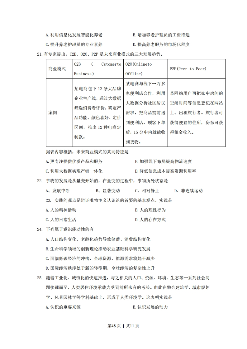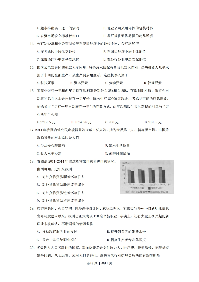 2015年普通高等学校招生全国统一考试(上海卷)政治试题一、单项选择题(共90分,每题3分,年题只能选一个选项)1.中共中央总书记、国家主席、中央军委主席习近平在庆祝“五一”国际劳动节暨表彰全国劳动模范和先进工作者大会上指出,我国工人阶级地位和作用都不容动摇,不容忽视。这是因为工人阶级是我们国家的()A.阶级基础B.坚强柱石C.领导阶级D.政治保证2.下列有关上海市政府与上海市人大两者关系的表述中正确的是()A.上海市政府对上海市人大负责B.上海市政府接受上海市人大领导C.上海市政府与上海市人大互相监督D.上海市政府执行上海市人大的命令3.公民政治参与依据的实体法律有()A.《义务教育法》B.《行政许可法》C.《劳动合同法》D.《选举法》4.根据党中央关于加强新形势下党员队伍建设的新部署,中国人民解放军总政治部颁布了新修订的《军队党组织发展党员工作规定》,为加强军兴军提供重要保证。这体现了党加强军队的()A.军事领导B.思想领导C.组织领导D.政治领导5.新中国成立以后,我国各民族的关系是中华民族大家庭里不同成员的关系,奠定这种新型民族关系的基础是()A.民族区域自治制度B.社会主义制度C.统一和自治相结合D.各民族共同繁荣6.以下体现社会主义法制建设中“执法必严”的是()A.我国实行官员问责制,强调权责统一B.党中央“打老虎、拍苍蝇”,强力反腐C.全国人大常委会修订通过《食品安全法》D.因事实不清、证据不足,法院改判呼格案7.“我希望并相信通过不懈的努力,APEC蓝能够保持下去”。习近平主席道出人民的心声,宣示我国治理大气污染的决心和信心。从根本上说,这是因为()A.维护人民的根本利益是履行国家职能的出发点B.加强大气污染防治是我国推进社会建设的要求第45页1共11页