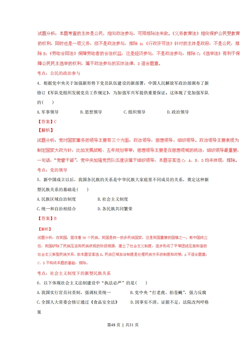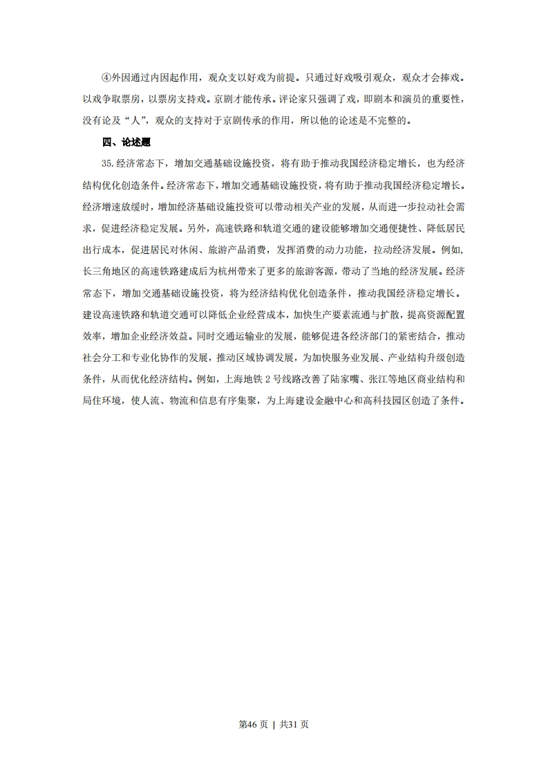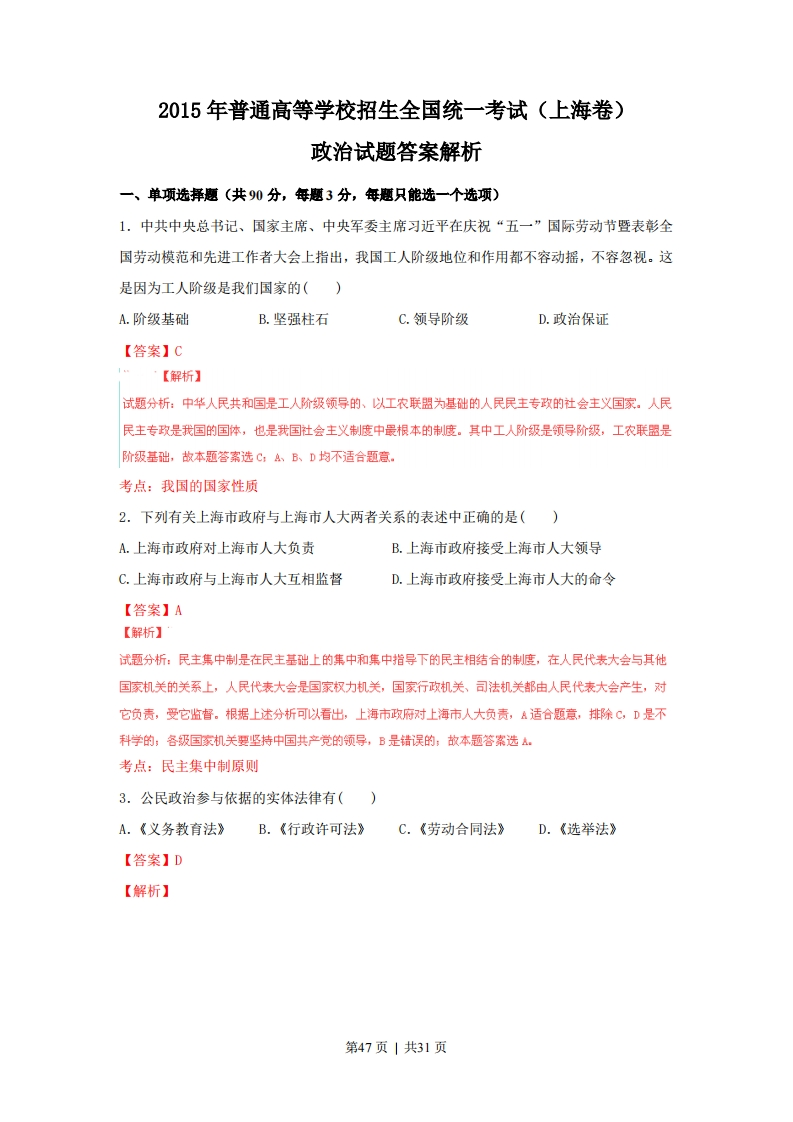 2015年普通高等学校招生全国统一考试(上海卷)政治试题答案一、单项选择题1.C2.A3.D4.C5.B6.D7.A8.D9.C10.B11.D12.A13.C14.B15.B16.D17.C18.A19.D20.A21.A22.C23.D24.B25.B26.D27.B28.D29.C30.B二、简答题31.(1)社会管理和公共服务或组织社会公共服务(2)①居(村)民自治内容方面的关键词涉及:最关心、最直接、最现实利益或切身利益等:②居(村)民自治组织安排方面的核心概念包括:时空、形式、程序安排:便于大多数居(村)民参加:③居(村)民主人翁意识方面的核心概念包括:居(村)民自治权利,或居(村)民自治重要性等。32.(1)中国共产党是中国工人阶级的先锋队,又是中国人民和中华民族的先锋队,代表最广大人民的根本利益,是中国特色社会主义事业的领导核心。建设生态文明关乎人民的切身利益,关乎我国经济健康发展。依法治国是党领导人民治理国家的基本方略,(亿美元1400法律的权威性,强制性,规范性,稳定性为保护生12:·实,使用外商投金1000一对外直接投资金额态环境,建设生态文明提供保障。因此,党中央提800600出用严格的法律制度保护生态文明。400200(2)既要坚持两点论,又要坚持重点论。19911998200620142020(年)33.我国劳动力等生产要素成本持续上升,外商获利空间减小。三、分析说明题34.①唯物辩证法认为,任何事物的变化和发展,都是内因和外因共同起作用的结果。对于京剧的传承,“吸引人”、“人抬戏”中的“戏”指剧本与表演,是因为,“人”指购买戏票的观众,观众的支持是外因。②内因是事物变化的根据。好的题材加上表演艺术家的表演,是京剧传承的根本。③外因是事物变化的必要条件,是第二位原因。观众的支持是京剧艺术传承的重要条件。第45页1共31页