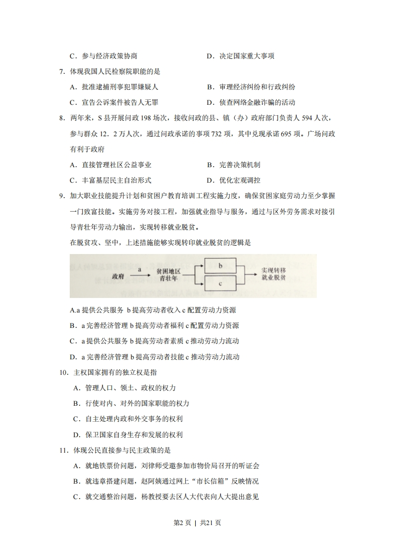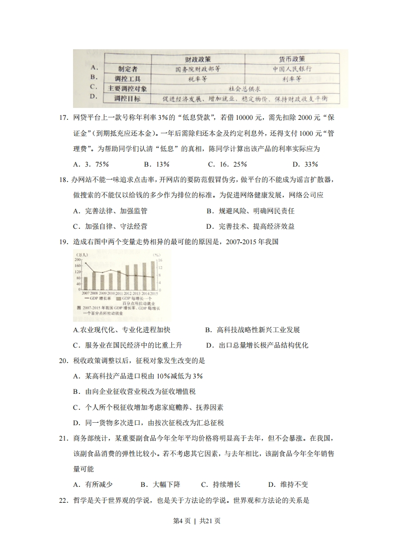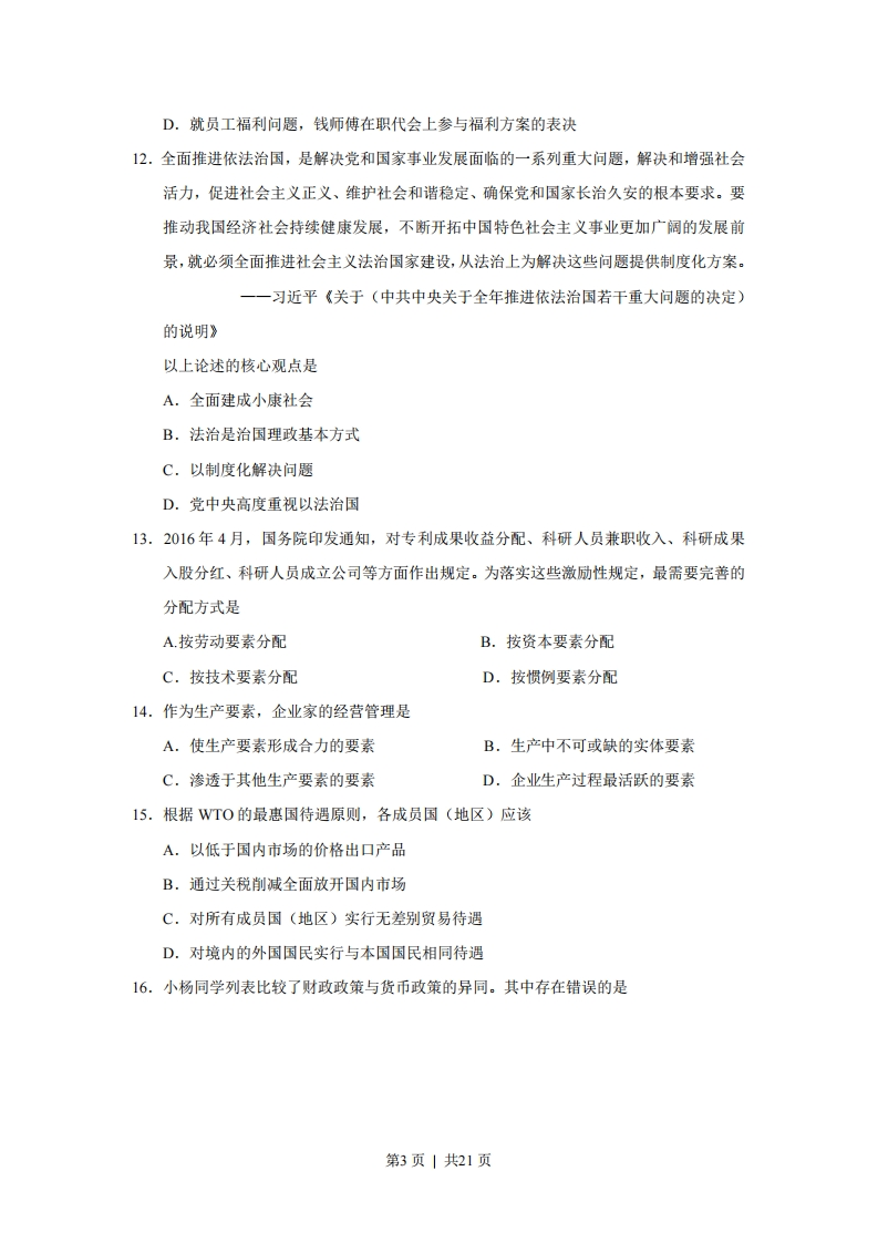 绝密★启用前2016年普通高等学校招生全国统一考试上海政治试卷一、单选选择题(共90分,每题3分。每题只能选一个选项)1.习近平总书记始终强调:人民对美好生活的向往,就是我们的奋斗目标。这是因为中国共产党A.我国的执政党B.以全心全意为人民服务为宗旨C.以工农联盟为基础D.社会主义现代化建设的根本保证2.在我国,由选民直接选举产生的是A.全国人大代表B.上海市闵行区人大代表C.湖南省人大代表D.广西壮族自治区人大代表3.以下代表全国人大行使最高监督权的是A十二届全国人大一次会议根据国家主席习近平的提名,决定国务院总理的人选B.十二届全国人大二次会议审查、批准2014年国民经济和社会发展计划C.十二届全国人大三次会议听取、审议最高人民法院的工作报告D.十二届全国人大四次会议审议《中华人民过喝过慈善法(草案)》4.从东海之滨到雪域高原,上海和西藏虽相距万里。但有着深厚友谊。多年来,两地注重优势互补,不断深化合作交流,上海企业与西藏文化旅游、特色农牧业及资源等领域开发合作,西藏到上海开展经贸、人大交流托搞活动。这反映了我国坚持A.对外开放的理念B.个民族的地位一律平等C.民主集中制原则D.深化市场经济体制改革5.人民政协根植于中国历史文化,产生于近代以后中国人民革命的伟大斗争,发展于中国特色社会主义光辉实践,具有鲜明中国特色。对人民政协理解正确的是A.围绕民主与团结主题开展活动B.社会主义事业的领导核心C.服从中央人民政府的统一领导D.受人大委托,向人大负责6.2015年底,中共中央在中南海召开党外人士座淡会,就2015年经济形势和2016年经济工作听取了各民主党派中央、全国工商联负责人和无党派人士代表的意见和建议。在会议上,各民主党派的作用是A直接参与民主管理B.规划监管经济事务第1页|共21页
