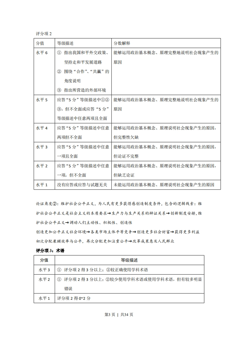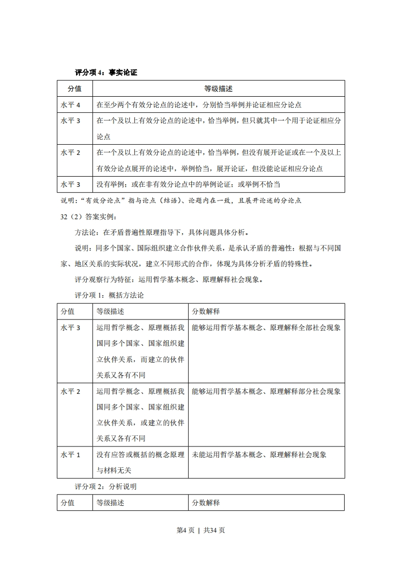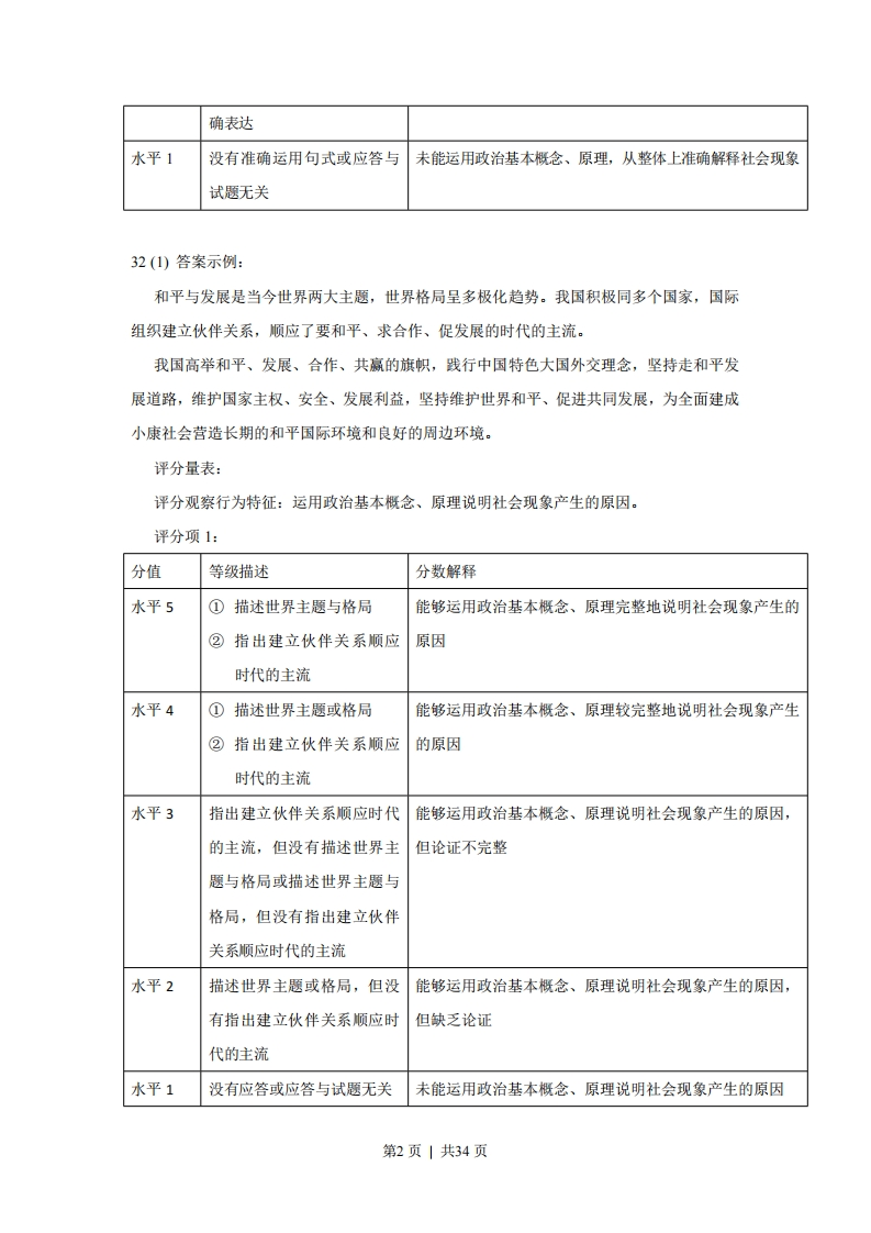 2016年普通高等学校招生全国统一考试上海政治试卷参考答案一、单项选择题1.B2.B3.C4.B5.A6.C7.A8.B9.C10.C11.D12.B13.C14.A15.C16.D17.C18.C19.C20.B21.A22.B23.D24.D25.C26.B27.A28.D29.C30.D二、简答题31.答案示例:只要坚持“和平统一,一国两制”基本方针,贯彻特别行政区基本法,坚持以“一国”为前提和基础,实行两种制度并存,澳门享有高度自治权,全国人民与澳门人民同心协力,就能实现澳门的长期稳定、繁荣和发展。评分观察行为特征:运用政治基本概念、原理解释社会现象。评分项1:分值等级描述分数解释水平7准确解释全部内容能够运用政治基本概念、原理准确解释全部社会现象水平6准确解释绝大部分内容能够运用政治基本概念、原理准确解释绝大部分社会现象水平5准确解释大部分内容能够运用政治基本概念、原理准确解释大部分社会现象水平4准确解释部分内容能够运用政治基本概念、原理准确解释部分社会现象水平3准确解释少部分内容能够运用政治基本概念、原理准确解释少部分社会现象水平2准确解释极少部分内容能够运用政治基本概念、原理准确解释极少部分社会现象水平1没有应答或应答与试题无关未能运用政治基本概念、原理准确解释社会现象评分项2:分值等级描述分数解释水平2以“只要……也可以能够运用政治基本概念、原理,从整体上准确解释社会现象(就)…”或类似句式准第1页|共34页