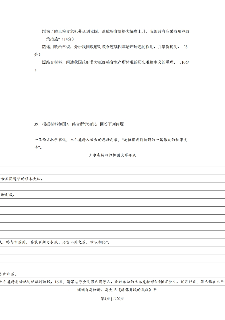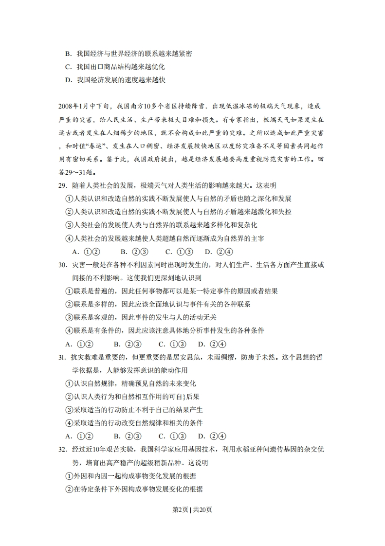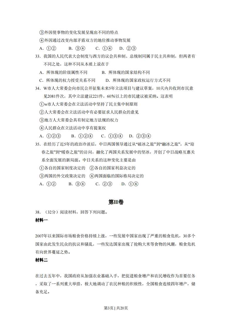 2008年普通高等学校招生全国统一考试文科综合能力测试(政治部分)第I卷(选择题共140分)本卷共35小题,每小题4分。在每小题给出的四个选项中,只有一项符合题目要求。24.中共十七大报告指出,我国“市场体系不断健全,宏观调控继续改善,政府职能加快转变”。下列行为属于宏观调控经济手段的是A.国家提高农产品收购价格B.物价部门核准公共交通的价格C.国家修订个人所得税法D.工商部门给新办企业发放营业执照25.假设2007年某国一单位M商品,其价值用该国货币表示为15元。如果2008年生产M商品的社会劳动生产率提高50%,且该国的货币价值下降(贬值20%,在其他条件不变的情况下,2008年一单位M商品的价值用货币表示为A.12元B.12.5元C.18元D.18.75元26.近年来,我国蔗糖产业逐步由福建、广东等地向广西、云南等地转移。“东蔗西移”、“东糖西移”一方面为东部产业发展提供了新的空间.另一方面也在西部形成新的蔗糖业基地,提升了我国蔗糖产业的国际竞争力。这一事例表明东部产业向西部转移有利于①促进东部地压产业结构的优化和升级②通过东部地区工业化带动西部地区农业产业化③加强西部地区加工工业的基础地位④西部地区合理利用本地资源形成优势产业A.①②B.①③C.①④D.②④27.社会主义市场经济倡导正当竞争.反对不正当竞争。下列企业行为中.属于不正当竟争的是①甲企业为了扩大销售,加大广告宣传力度,影响消费者购买行为②乙企业为了扩大市场份额,进行有奖销售,最高奖励现金1万元③丙企业通过捐建希望小学,提高了知名度,扩大了市场份额④丁企业为了稳定市场份额,联合行业内的其他企业达成价格协议A.①②B.②③C.②④D.③④28.我国1978年进出口贸易总额为206.4亿美元.外贸依存度(贸易总额/国内生产总值)为9.7%:1998年进出口贸易总额为3239.5亿美元,外贸依存度为31.8%:2007年进出口贸易总额达到21738亿美元,位列全球第三位,外贸依存度为73%。这表明A.我国经济越来越脆弱第1页1共20页