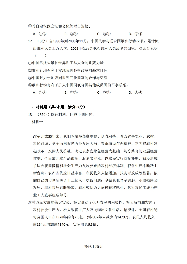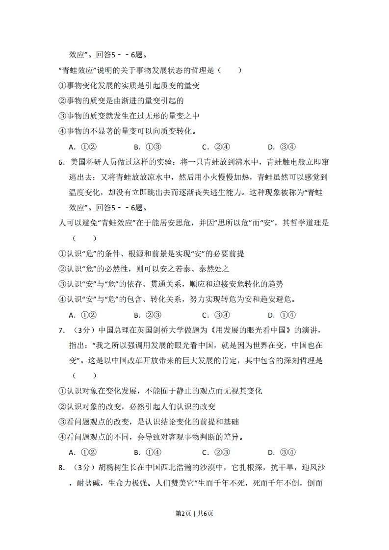 2009年全国高考政治试卷(全国卷Ⅱ)一、选择题部分1.(3分)2012年某国生产甲种商品100万件,每件商品的价值量为6元。如果2013年该国生产甲种商品的劳动生产率提高20%,其他条件不变,则甲种商品的价值总量与单位商品的价值量分别为()A.720万元,6元B.720万元,5元C.600万元,5元D.600万元,6元2.(3分)2009年4月,国务院决定在上海、广州、深圳、珠海和东莞5市开展跨境贸易人民币结算试点。跨境贸易人民币结算()①将扩大人民币的职能从而使其成为世界货币②使人民币在一些国际贸易中发挥流通手段的职能③有利于中国国内物价保持稳定④有利于降低中国与贸易伙伴国的汇率风险A.①③B.②③C.①④D.②④3.目前,全国各地纷纷开展“家电下乡”活动,政府对农民购买家电产品给予补贴。家电下乡受到农民的欢迎。回答3--4题。家电下乡”活动的推出有利于()①缩小城乡收入差距②拉动国内的消费需求③通过消费带动家电企业的生产④调整农村的产业结构。A.①②B.②③C.①④D.③④4.目前,全国各地纷纷开展“家电下乡”活动,政府对农民购买家电产品给予补贴。家电下乡受到农民的欢迎。回答3--4题。个别地方出现了不法商家借“家电下乡”销售伪劣产品坑害农民的现象,这种不法行为侵害了消费者的()①自主选择权②知情权③公平交易权④求偿权。A.①②B.①③C.②③D.②④5.美国科研人员做过这样的实验:将一只青蛙放到沸水中,青蛙触电般立即窜逃出去:又将青蛙放放凉水中,然后用小火慢慢加热,青蛙虽然可以感觉到温度变化,却没有立即跳出去而逐渐丧失逃生能力。这种现象被称为“青蛙第1页1共6页