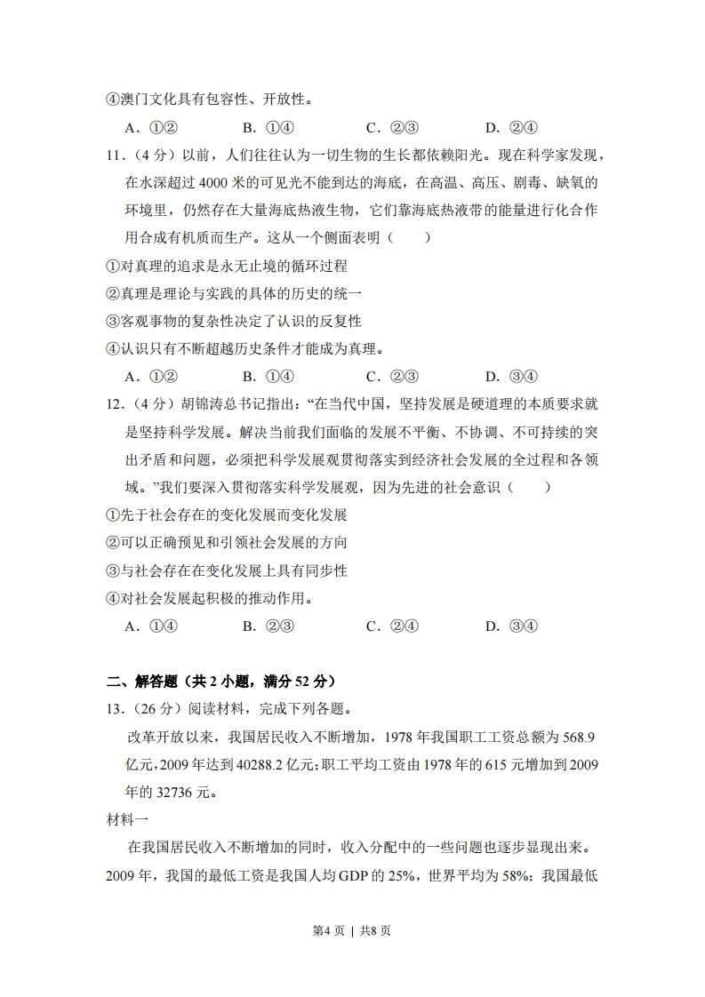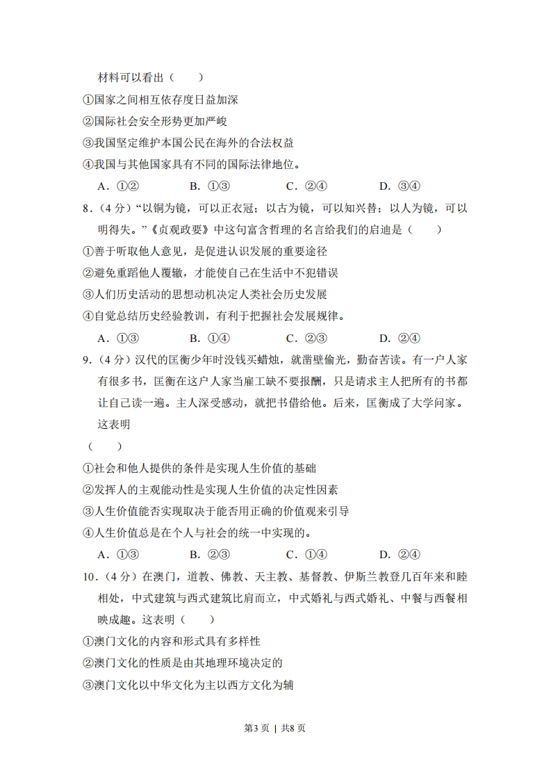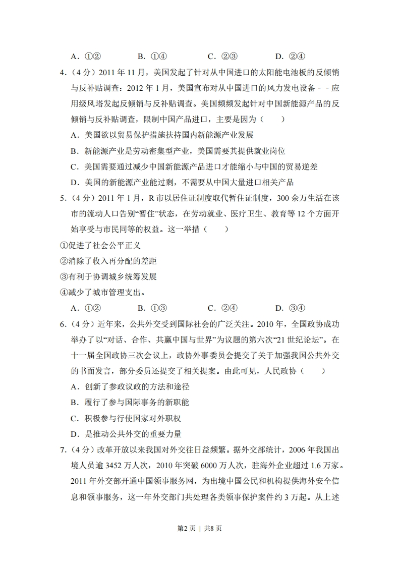 2012年全国高考政治试卷(新课标)一、选择题(共11小题,每小题4分,满分40分)1.(4分)货币最早以足值的金属货币形式出现的。随着商品生产和商品交换的发展,商品流通中产生了作为价值符号的纸币,并逐渐取代了金属货币。纸币之所以能取代金属货币,是因为()①纸币容易产生,且同样具有充当贮藏手段的职能②使用纸币能够有效降低货币制作成本③纸币的使用范围更广④纸币同样能执行价值尺度和流通手段的职能。A.①②B.②③C.②④D.③④2.(4分)由美国次贷危机引发的国际金融危机,深刻影响了世界经济的发展,回答2-3题。在国际金融危机的冲击下,一些国家先后陷入了经济持续下滑、失业率大幅上升的困境。各国政府对市场经济活动进行干预,其依据是()①市场调节具有盲目性和滞后性②市场经济具有开放性③政府具有经济管理职能④政府是超越市场利益的中立者。A.①②B.①③C.②④D.③④3,(4分)由美国次贷危机引发的国际金融危机,深刻影响了世界经济的发展,回答2-3题。2012年1月,中国混凝土机械行业龙头企业之一的S公司宣布,将斥资3.6亿欧元收购德国P公司100%股权,P公司凭借领先的技术优势在全球混凝土泵车市场占有率曾高达40%左右,国际金融危机爆发后,公司出现严重经营困难。S公司并购P公司的积极作用在于()①形成行业垄断格局②开拓国际市场③加速资本周转④促进产品升级换代。第1页|共8页
