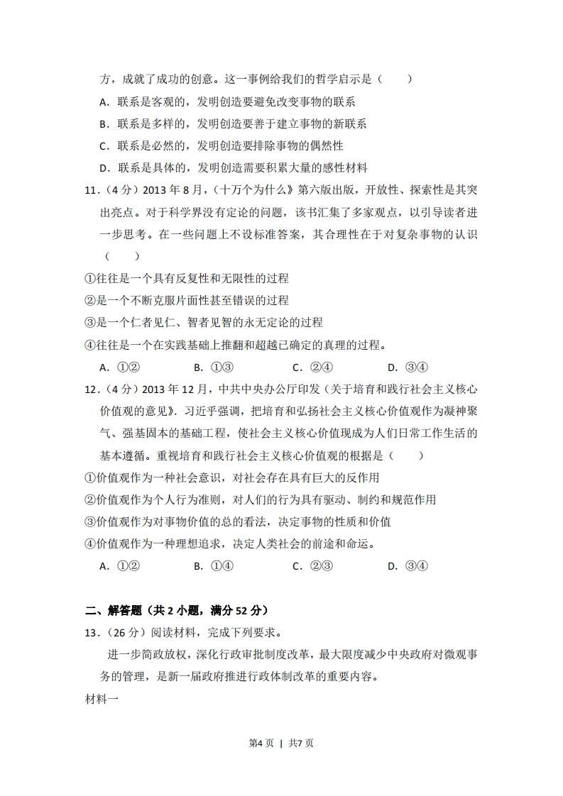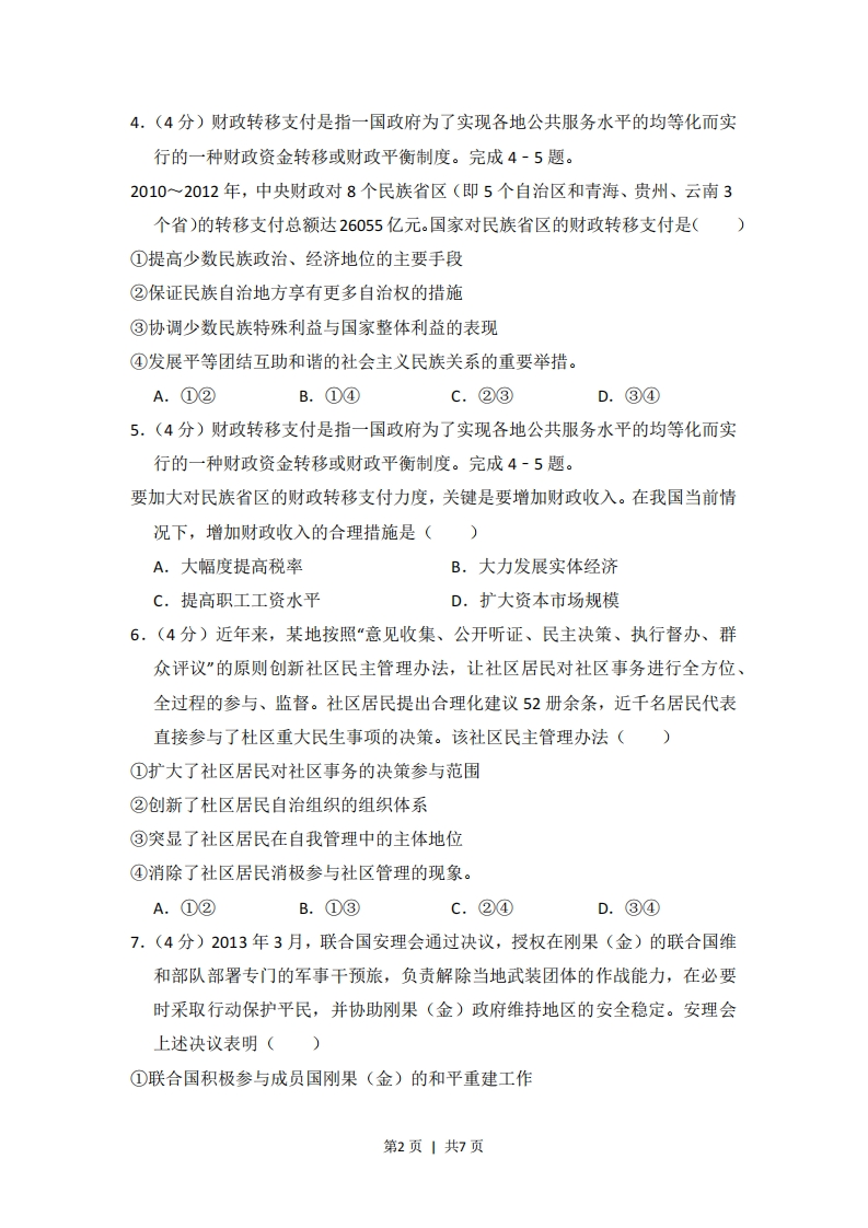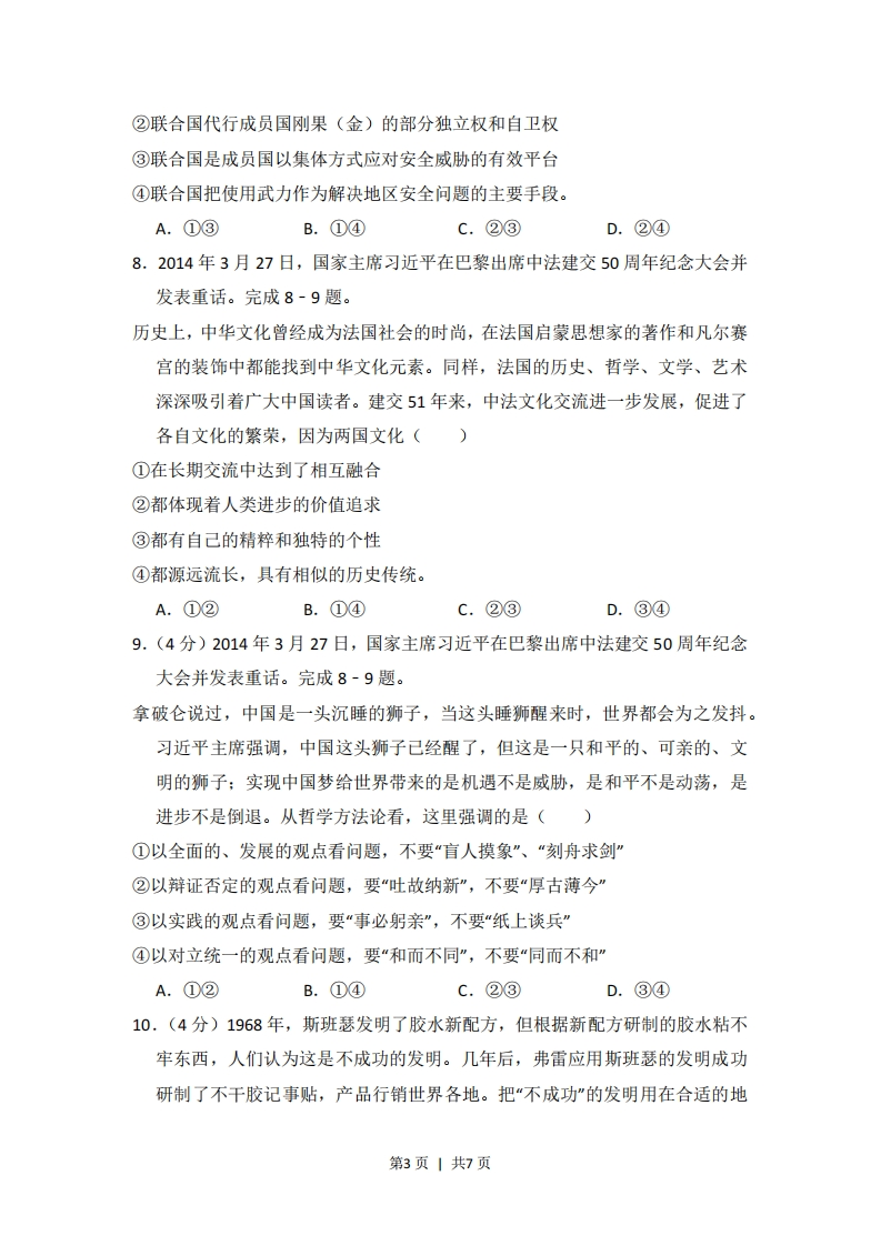 2014年全国高考政治试卷(新课标I)一、选择题(共10小题,每小题4分,满分32分)1,(4分)按现行规定,金融机构人民币存款利率(年利率)一年期为3%,两年期为3.75%.老陈有10000元闲置资金,准备存两年,那么,这笔钱以一年期连续存(第一期利息计入第二期本金)两年的利息比存一个两年期的利息()A.少141元B.多141元C.少150元D.多150元2.(4分)如图是某国20年来人均消费支出增长率的变化图。从图中可以推论出该国居民()14.0%12.0%奢侈品10.0%8.0%6.0%4.0%日用品2.0%0.0%①消费行为越来越不理性②收入差距不断扩大③日用品消费支出不断增长④生活水平逐步提高。A.①②B.①③C.②④D.③④3.(4分)大数据对当前企业发展具有重要意义,某知名家电企业通过大数据搜集消费者的需求信息,并根据他们的特殊需求专门生产了近万台定制彩电。从消费者下单到生产、配送、安装,整个过程仅耗时一个月,比传统批量生产模式(含产供销)少用半年多的时间。与传统的批量生产模式相比,这种定制生产模式能够()①充分发挥企业规模优势②以需定产缩短生产周期,减少企业库存③更灵活应对市场变化,满足消费者多样化需求④优化企业决策流程,提高企业技术水平A.①②B.③④c.②③D.①④第1页1共7页