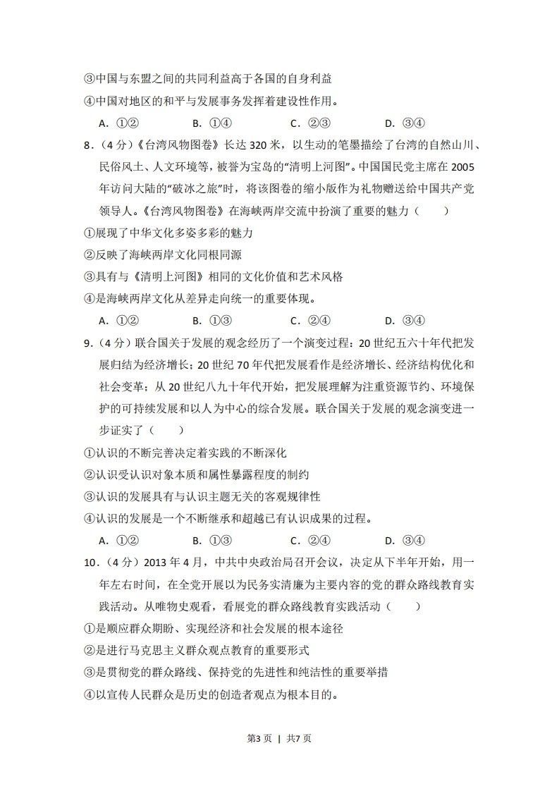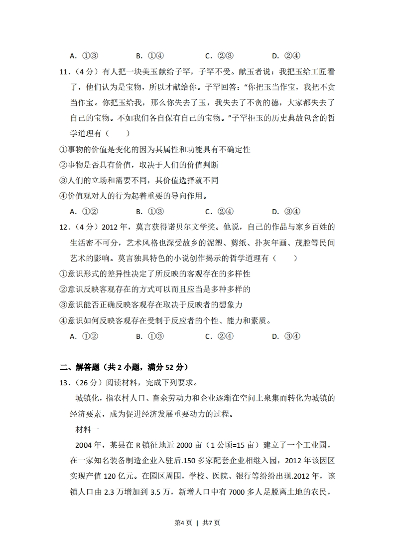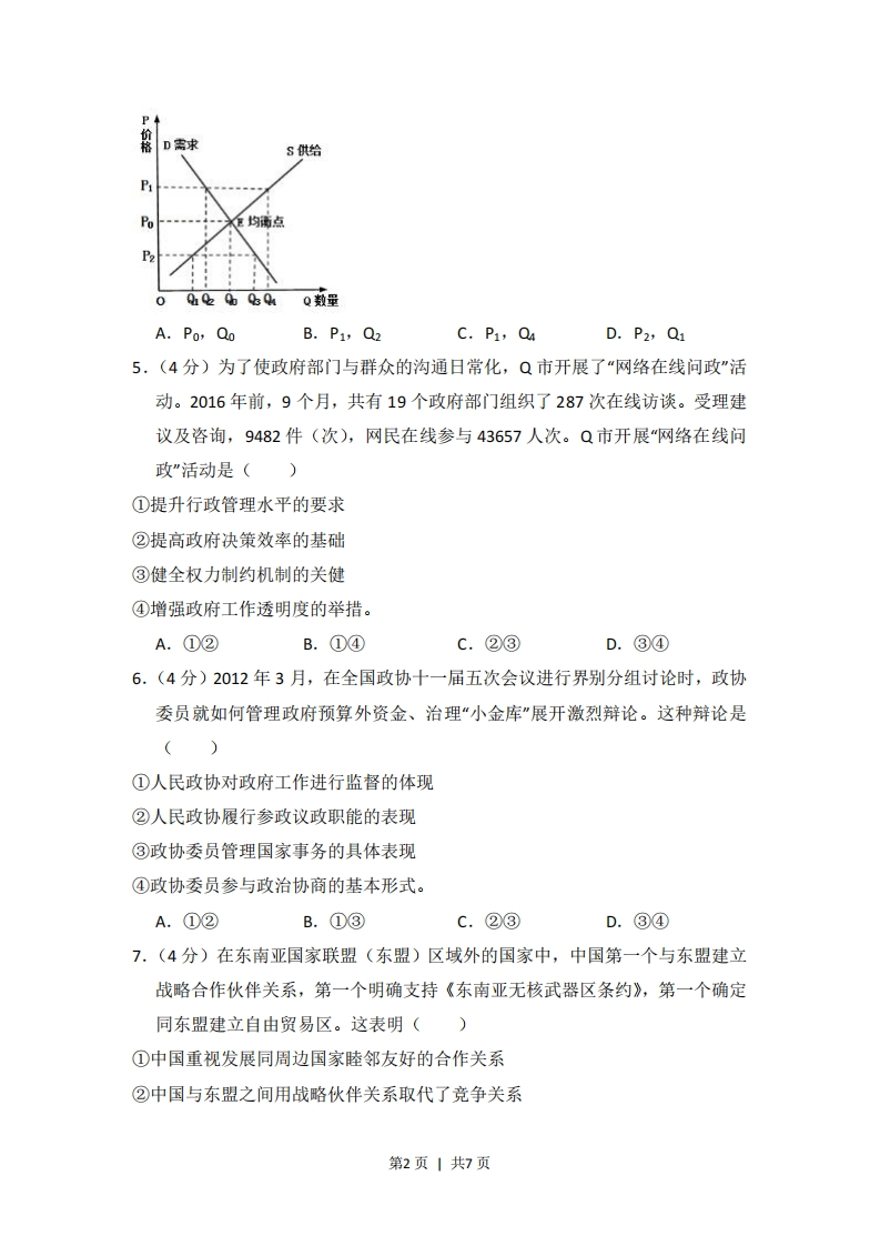 2013年全国高考政治试卷(新课标Ⅱ)一、选择题1.(4分)财政政策是我国重要的宏观调控手段。2013年我国继续实施积极的财政政策,安排财政赤字1.2万亿元。在风险可控的前提下,适度的财政赤字可以()A.扩大社会总需求,促进经济增长B.减轻企业的税负,改善经济结构C.优化预算的结构,完善社会保障D.增加社会总供给,扩大居民消费2.(4分)近年来,智能手机市场的竞争日趋激烈。除传统手机制造商外,许多网络公司也纷纷斥资研发智能手机,并将内置其网络产品的智能手机推向市场。在下列选项中,能够解释“网络公司造手机”原因的是()A.生产智能手机的利润率高于其他行业B.网络公司的业务创新速度不断加快C.传统手机制造商生产智能手机能力不足D.网络公司延伸产业链提高综合竞争力3.(4分)当前我国农业补贴的重心已由流通环节向生产环节、由消费者向生产者转变,初步形成了支持价格、直接补贴和一般服务支特相结合的农业补贴模式。回答3-4题。我国农业补贴重心转变的目的在于①增加农业生产者收入②优化农产品需求结构③缩小农产品供需缺口④稳定农产品市场供给()A.①③B.①④C.②③D.②④4.(4分)当前我国农业补贴的重心已由流通环节向生产环节、由消费者向生产者转变,初步形成了支持价格、直接补贴和一般服务支特相结合的农业补贴模式。回答3-4题。支持价格是指一国为了支持农业的发展而对粮食等农产品所规定的最低收购价格。我国某农产品的需求曲线(D)和供给曲线(S)如图4所示。该产品的支持价格和供给数量分别为()第1页1共7页