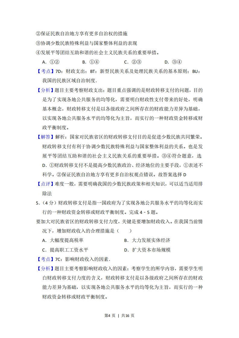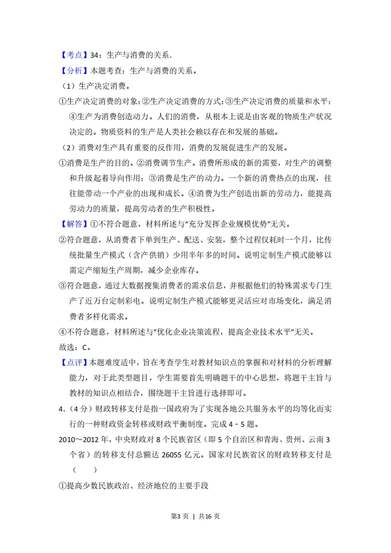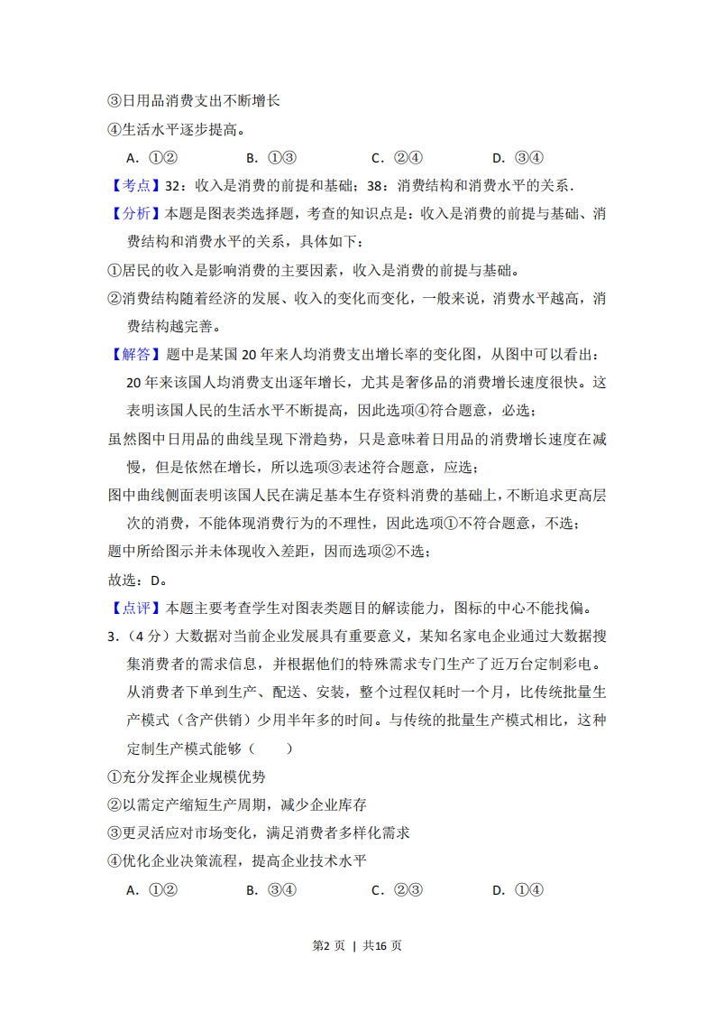 2014年全国高考政治试卷(新课标I)事考答来与试想解析一、选择题(共10小题,每小题4分,满分32分)1.(4分)按现行规定,金融机构人民币存款利率(年利率)一年期为3%,两年期为3.75%.老陈有10000元闲置资金,准备存两年,那么,这笔钱以一年期连续存(第一期利息计入第二期本金)两年的利息比存一个两年期的利息()A.少141元B.多141元C.少150元D.多150元【考点】67:利息收益的计算.【分析】题目主要考察利息的计算:题目属于一个计算题,需要学生明白利息的计算公示,以及本金到期后转存的区别,利息计算公式是:本金×利率×借款时间=利息:【解答】解析:按一年期连续存(第一期利息计入第二期本金)两年的利息为:10000元*3%+(10000元+10000元*3%)*3%=609元:如果存一个两年期的利息为:10000元*3.75%*2=750元:750元-609元=141元。因此,一年期连续存(第一期利息计入第二期本金)两年的利息比存一个两年期的利息少141元,故正确答案选A。【点评】题目简单,但是需要明白计算的方法。需要有耐心2.(4分)如图是某国20年来人均消费支出增长率的变化图。从图中可以推论出该国居民()14.0%12.0%奢侈品10.0%8.0%6.0%4.0%日用品2.0%0.0%①消费行为越来越不理性②收入差距不断扩大第1页|共16页