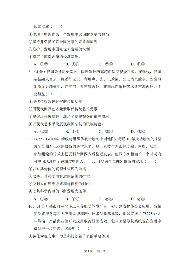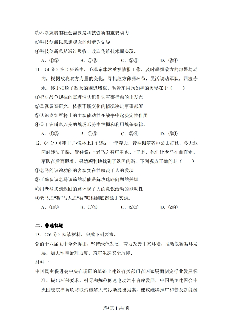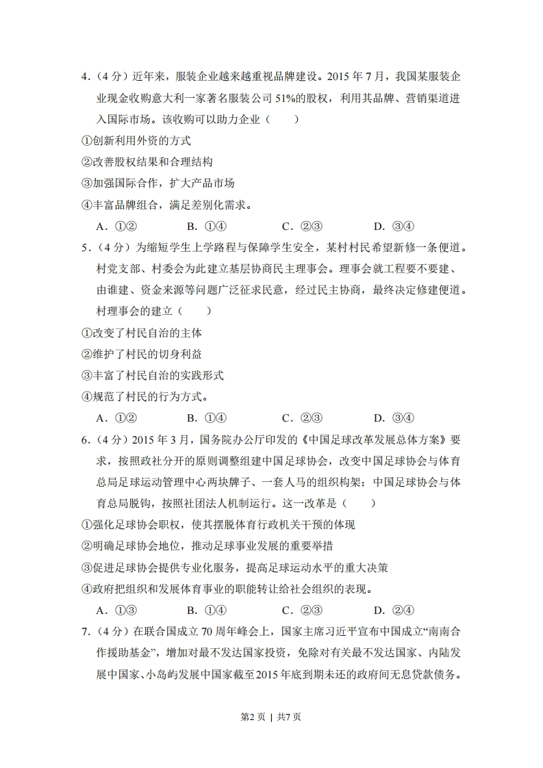 2016年全国统一高考政治试卷(新课标)一、选择题1.(4分)西晋著名文学家左思的《三都赋》创作完成后,都城洛阳的人们都认为写得好,争相传抄,一下子使纸帛的价格贵了好几倍,这就是成语“洛阳纸贵”的由来。若用S、D分别表示供给和需求曲线,下列图示正确反映“洛阳纸贵”的是(P(价格)十D2DS(S2)P(价格)D1D2S,S)P0AQ数世)B+Q数量)P(价格)↑DD)S2P价格)DP)SS2CQ数量)DQ数世)2.(4分)特别提款权(SDR)是国际货币基金组织(MF)创设的一种国际储备资产。2015年12月,MF将人民币纳入SDR货币篮子,占比为10.92%.人民币纳入SDR货币篮子表明()①中国的经济地位上升②人民币国际化取得新进展③中国外汇储备安全性提高④人民币汇率稳定性增强。A.①②B.①④C.②③D.③④3.(4分)2012年,某国司法部起诉甲公司和五家出版社,指控其涉嫌合谋操纵电子书价格,违反了《反垄断法》,令消费者遭受了数千万美元的损失。2015年,法院裁定罪名成立,开出了4.5亿美元的罚单。该案例说明()①市场调节存在滞后性②企业和社会组织均以盈利为经营目标③法律是解决市场失灵问题的有效手段④维护公平公正的市场秩序需要发挥政府的作用。A.①②B.①③C.②④D.③④第1页|共7页