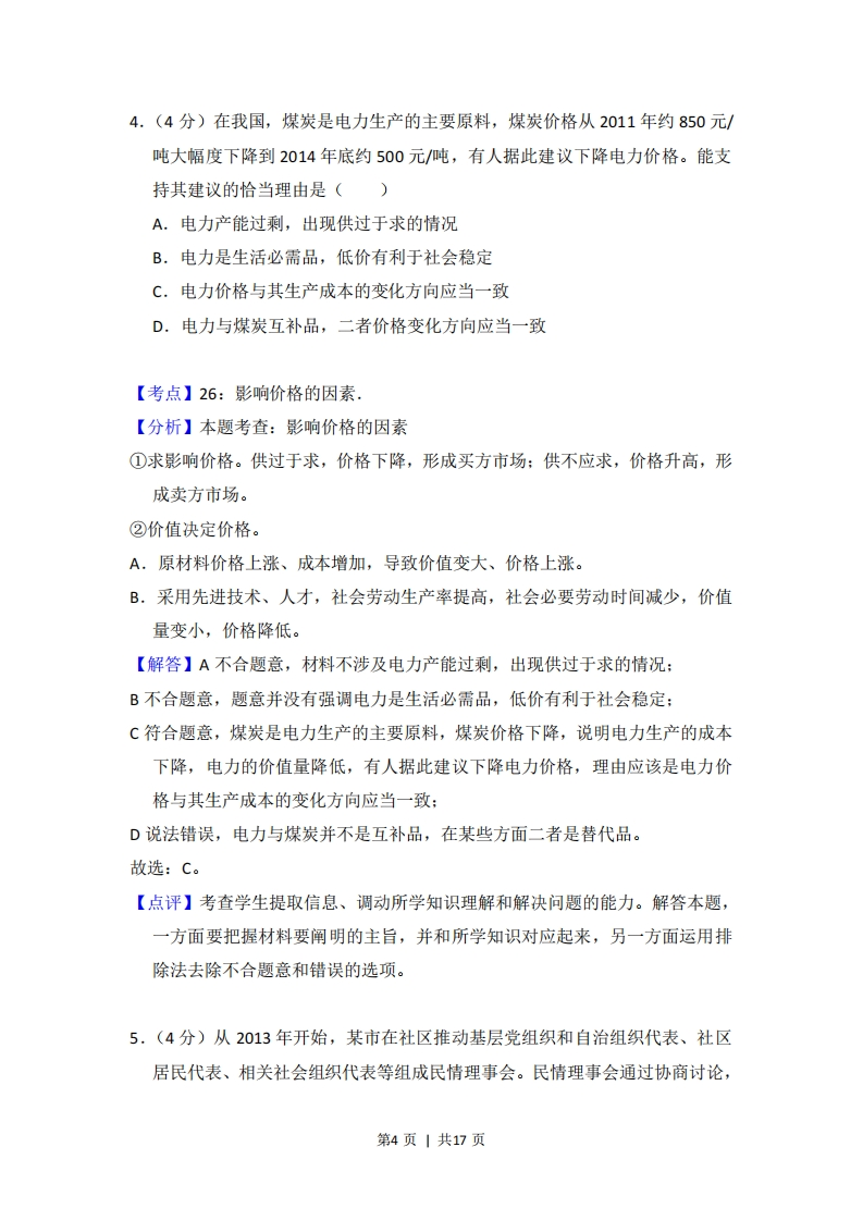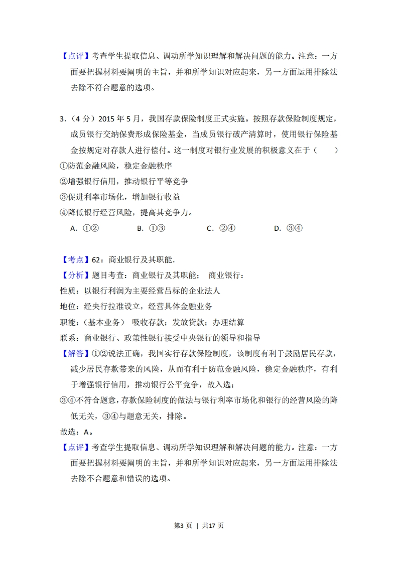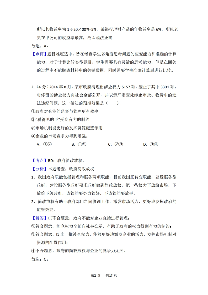 2015年全国统一高考政治试卷(新课标Ⅱ)事考答来与试想解析一、选择题:本题共12小题,每小题4分,共48分.在每小题给出的四个选项中,只有一项是符合题目要求的.1.(4分)老吴在年底对年初购买的投资产品收益进行了梳理:50元买入的甲公司股票已按54元卖出:乙公司股票价格仍为20元,按照每股1.2元进行了现金分红:丙公司股票价格也没变,按照每20股送1股进行了股票分红:某银行理财产品的年收益率是6%.上述投资产品中年收益率最高的是()A.甲公司股票B.乙公司股票C.丙公司股票D.银行理财产品【考点】6B:股票.【分析】题目考查:股票(1)股票的含义:是股份有限公司在筹集资本时向出资人出具的股份凭证。(2)股票的特点:①股票售出不返还。如要改变股东身份,要么等公司的破产清盘,要么将股票转售给第三人。②可转让,流通性强。经国家证券管理部门审批同意后,股票一般可以在股票市场上交易,这种流通性是股票生命力所在。风险、高收益。(3)股票投资的收入:股票投资的收入包括两部分:一部分是股息和红利收入,即股票持有人作为股东享有的定期从股份公司取得的利润分配收入:另一部分收入来源于股票价格上升带来的差价【解答】由题可知,老吴在甲公司股票上的收益为54-50=4元,则其收益率为4÷50×100%=8%:由于乙公司的股票价格没变,其在乙公司的收益率为1.2÷20×100%=6%:丙公司按照每20股送1股进行了股票分红,且股票价格不变。第1页|共17页