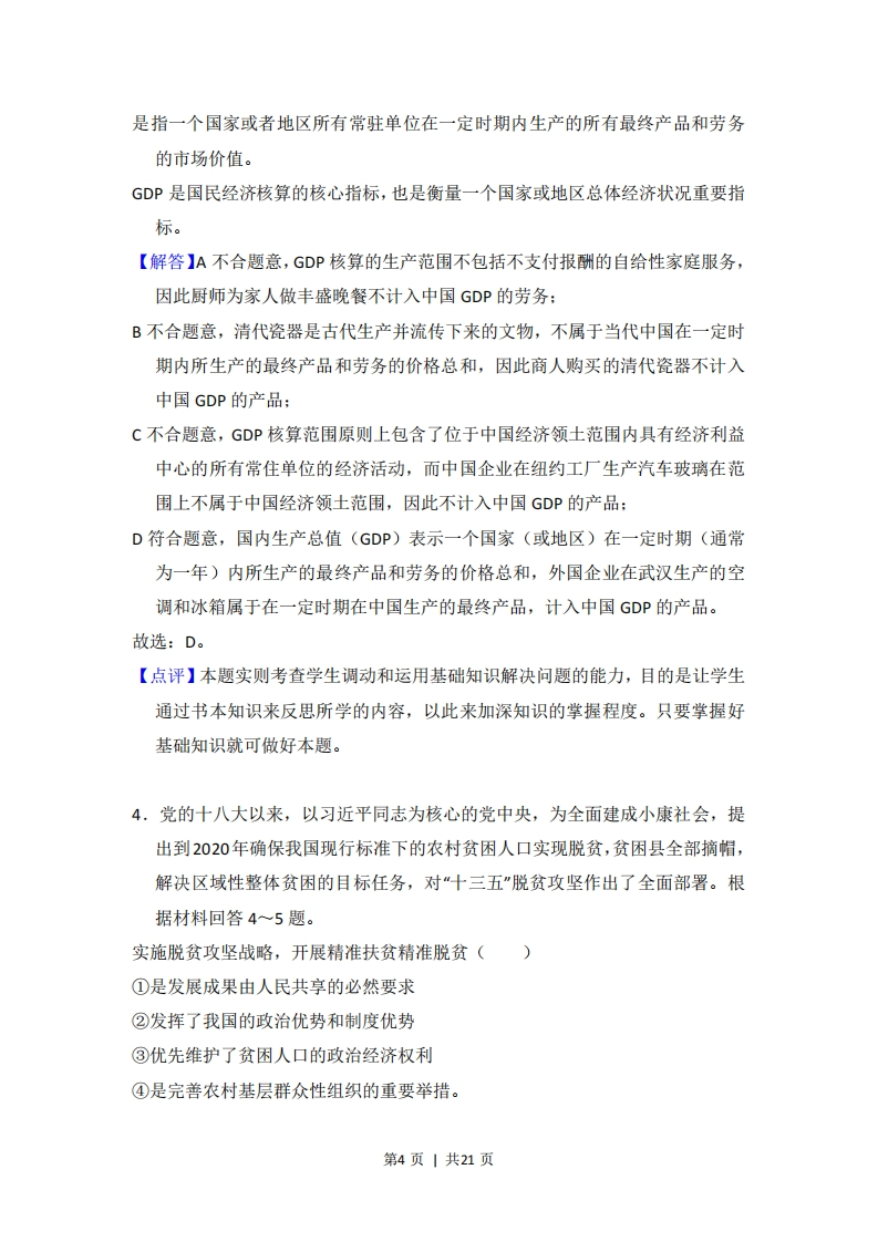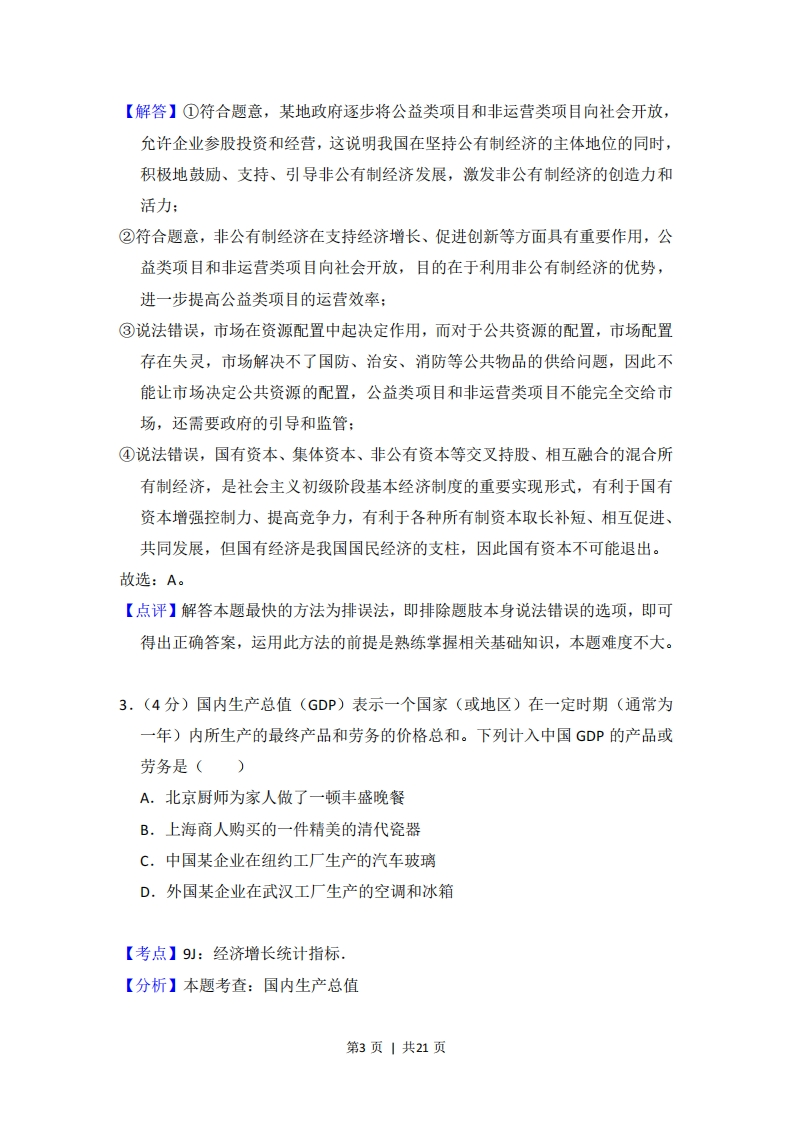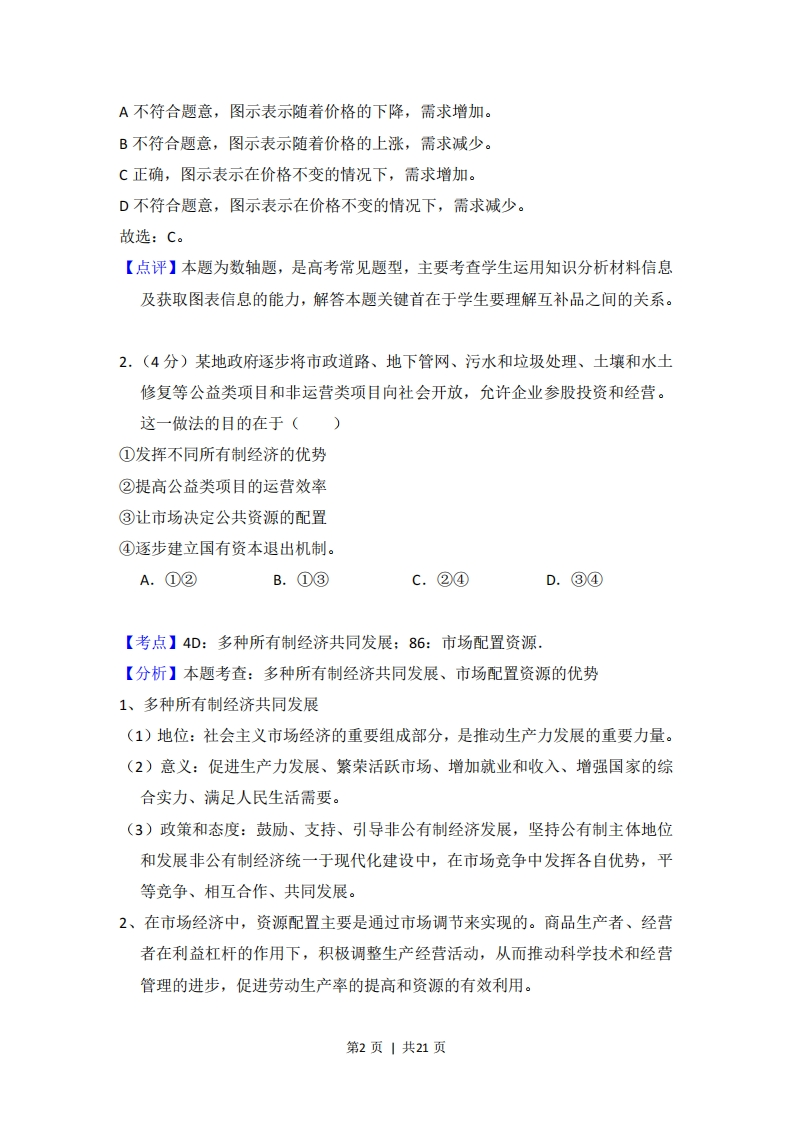2017年全国统一高考政治试卷(新课标I)事考答案与试题佩折一、选择题:本题共11小题,每小题4分,共64分.在每小题给出的四个选项中,只有一项是符合题目要求的。1.(4分)甲与乙是互补商品,假定甲的价格下降,其他条件不变,则乙的需求变动图示是()P(价格)P(价格)+Q(数量)】B+Q数量)P(价格)P(价格)+Q(数量)DQ(数量)】【考点】2C:价格变动对需求量的影响.【分析】本题考查:价格变动对需求量的影响。价格变动会引起需求量的变动,但不同商品对价格变动的反应程度是不同的。一般来说,价格上升,需求下降,价格下降,需求上升。消费者对既定商品的需求,不仅受该商品价格变动的影响,而且受相关商品价格变动的影响。(1)在可以相互替代的两种商品中,一种商品价格上升,消费者将会减少对该商品的需求量,转而消费另一种商品,导致对另一种商品的需求量增加,反之则反。(2)在有互补关系的商品中,一种商品的价格上升,不仅使该商品的需求量减少,也会使另一种商品的需求量减少,反之则反。(3)生活必需品需求弹性较小,高档耐用品需求弹性较大。【解答】在有互补关系的商品中,一种商品的价格下跌,在其他条件不变的情况下,不仅使该商品的需求量增加,也会使另一种商品的需求量增加。第1页|共21页