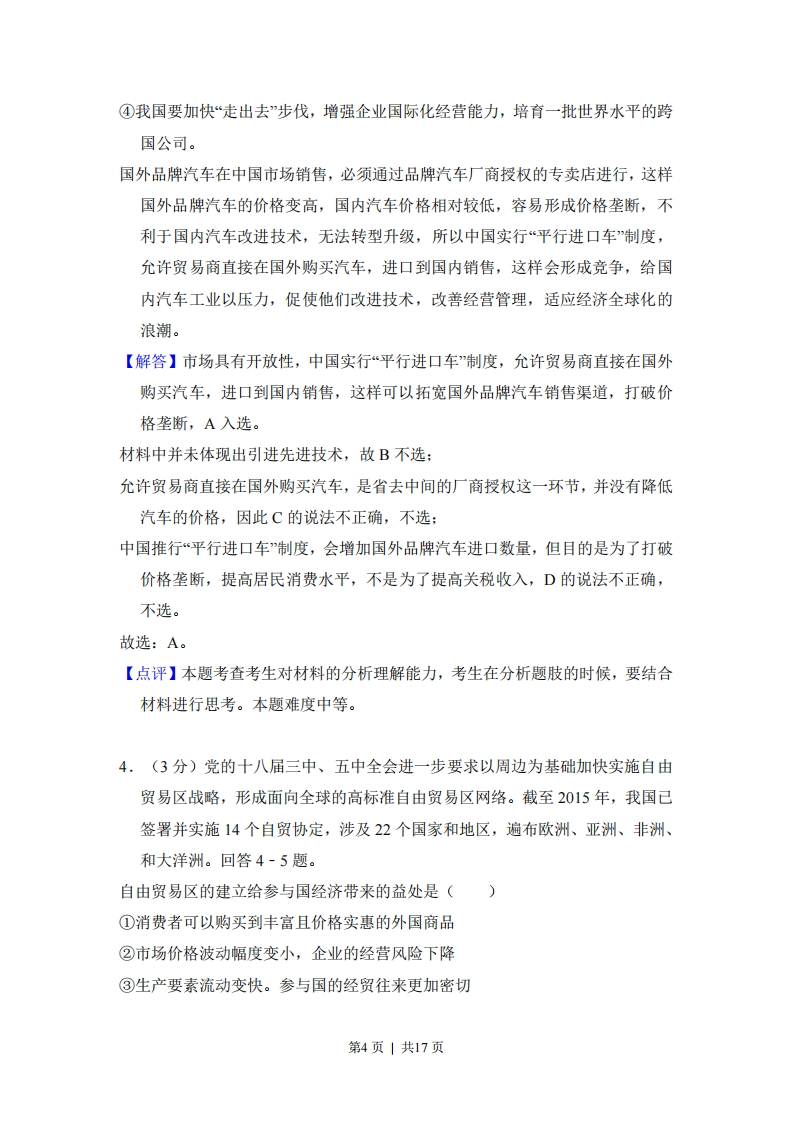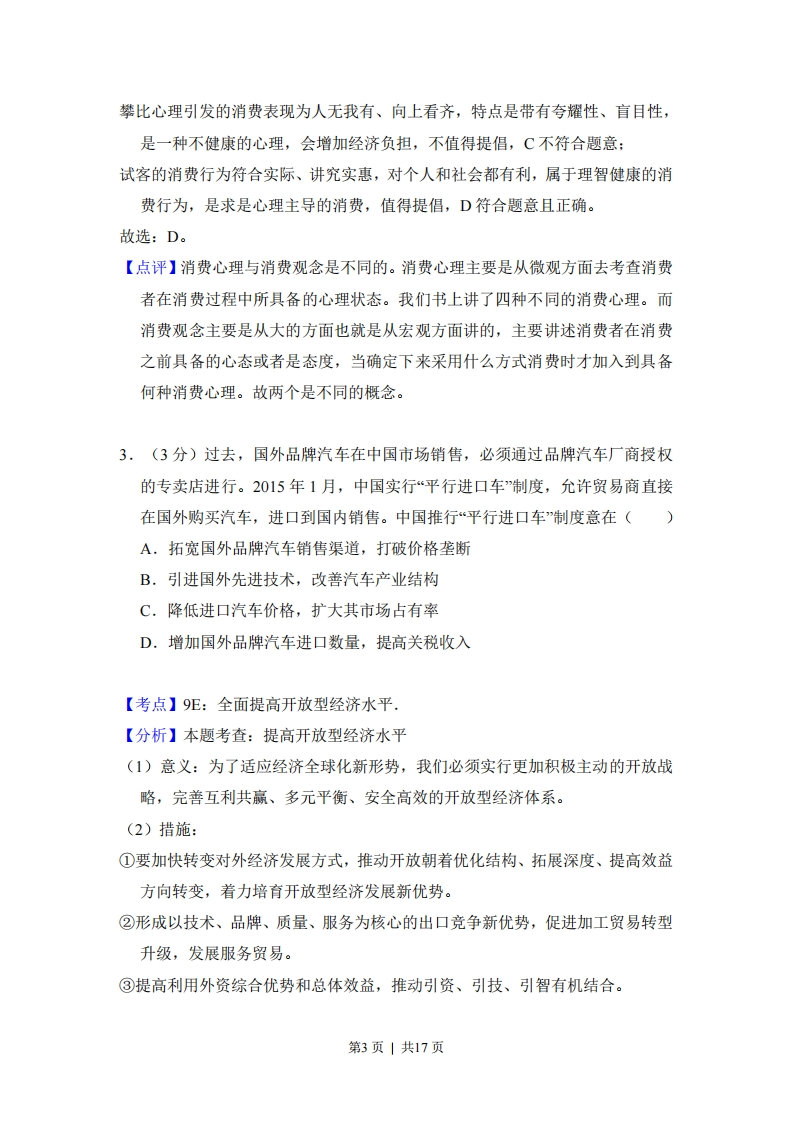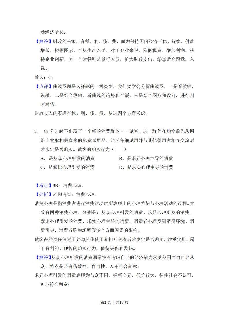 2016年全国统一高考政治试卷(新课标Ⅲ)事考答案与试题佩折一、选择题,1.(3分)如图反映我国2009~2015年的宏观经济状况,为保持国内经济平稳、持续增长,政府可以采取的财政措施是()GDP增长率阁PPI增长率(闲55q6.091041012136,902009年2010年2011年2012年2013年2014年2015年-17-19-19-2-10-15-52GDP增长米阁◆生产者出厂价格指数PPI-。-增长率阁(注:PPI是反映一定时期内全部工业产品出厂价格总水平变动趋势和程度的相对数。)①提高企业税费,增加财政收入②发行国债,扩大经济建设支出③降低企业税费,扶持企业创新④减少财政赤字,降低财政赤字率。A.①③B.①④C.②③D.②④【考点】7L:财政与宏观调控:8C:国家宏观调控的手段和目标,【分析】本题为曲线图,考查国家宏观调控的手段。曲线图横轴以2009年到2015年的时间为轴,纵轴左边是以GDP的增长率为轴,右边则以PPI的增长率为轴,读图可知,我国GDP增长率逐年下降,PPI增长率09-12年大幅上升,12年以后逐年下降,整体呈下降趋势。在经济增长滞缓、经济运行主要受需求不足制约时,政府可以采取扩张性财政政策,通过增加经济建设支出、减少税收,刺激总需求增长,降低失业率,拉第1页|共17页