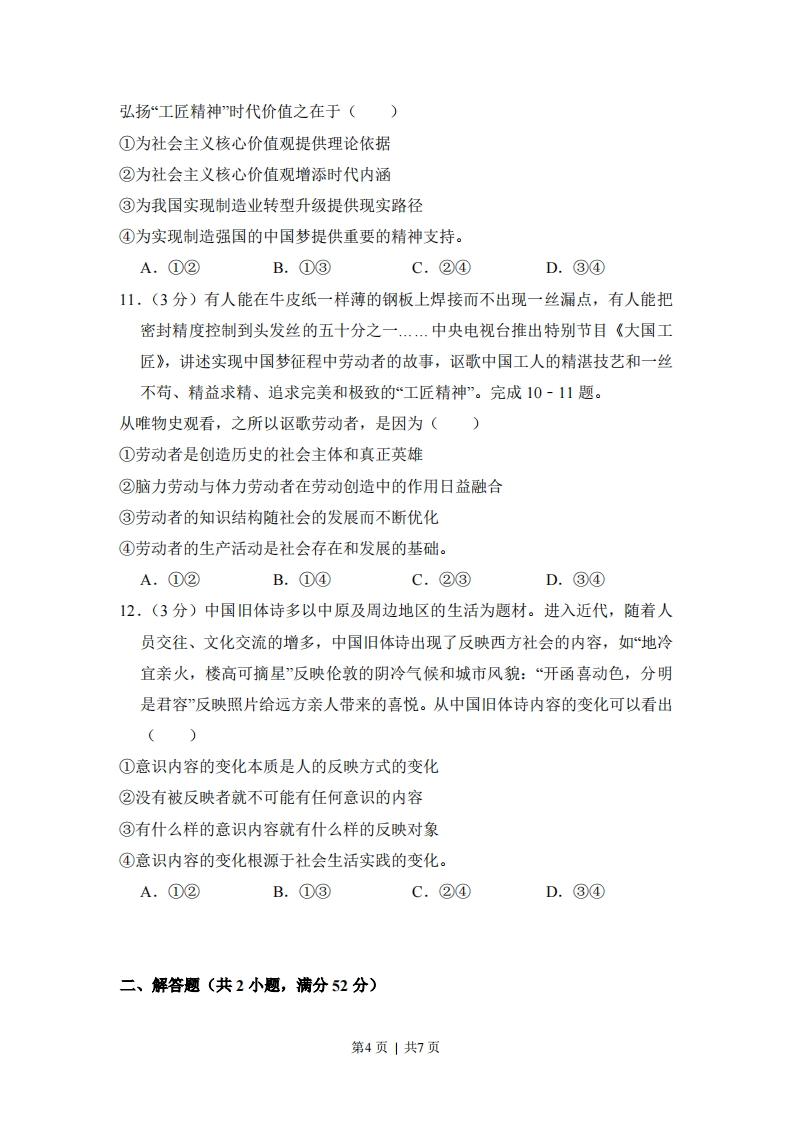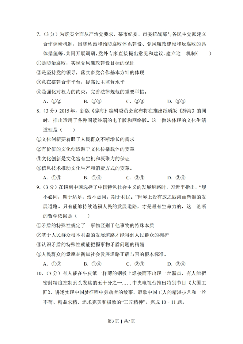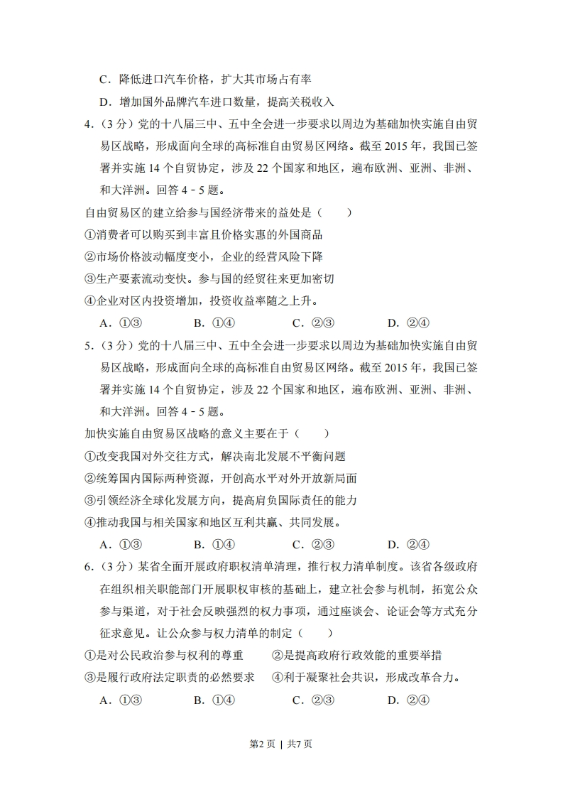 2016年全国统一高考政治试卷(新课标Ⅱ)一、选择题,1,(3分)如图反映我国2009~2015年的宏观经济状况,为保持国内经济平稳、持续增长,政府可以采取的财政措施是()GDP增长率阁PP增长率(阁155596061041092931727369502009年2010年2011年2012年2013年2014年2015年-5H-2-10-15-5.4-5.2GDP增长率阁◆生产者出厂价格指数PPD-o增长率阁(注:PP是反映一定时期内全部工业产品出厂价格总水平变动趋势和程度的相对数。)①提高企业税费,增加财政收入②发行国债,扩大经济建设支出③降低企业税费,扶持企业创新④减少财政赤字,降低财政赤字率。A.①③B.①④C.②③D.②④2.(3分)时下出现了一个新的消费群体--试客。这一群体在购物前先从网络上索取相关商家的免费试用品,经过仔细试用并与其他使用者相互交流后才决定是否购买。试客的购买行为()A.是从众心理引发的消费B.是求异心理主导的消费C.是攀比心理引发的消费D.是求实心理主导的消费3.(3分)过去,国外品牌汽车在中国市场销售,必须通过品牌汽车厂商授权的专卖店进行。2015年1月,中国实行“平行进口车制度,允许贸易商直接在国外购买汽车,进口到国内销售。中国推行“平行进口车”制度意在()A.拓宽国外品牌汽车销售渠道,打破价格垄断B.引进国外先进技术,改善汽车产业结构第1页|共7页