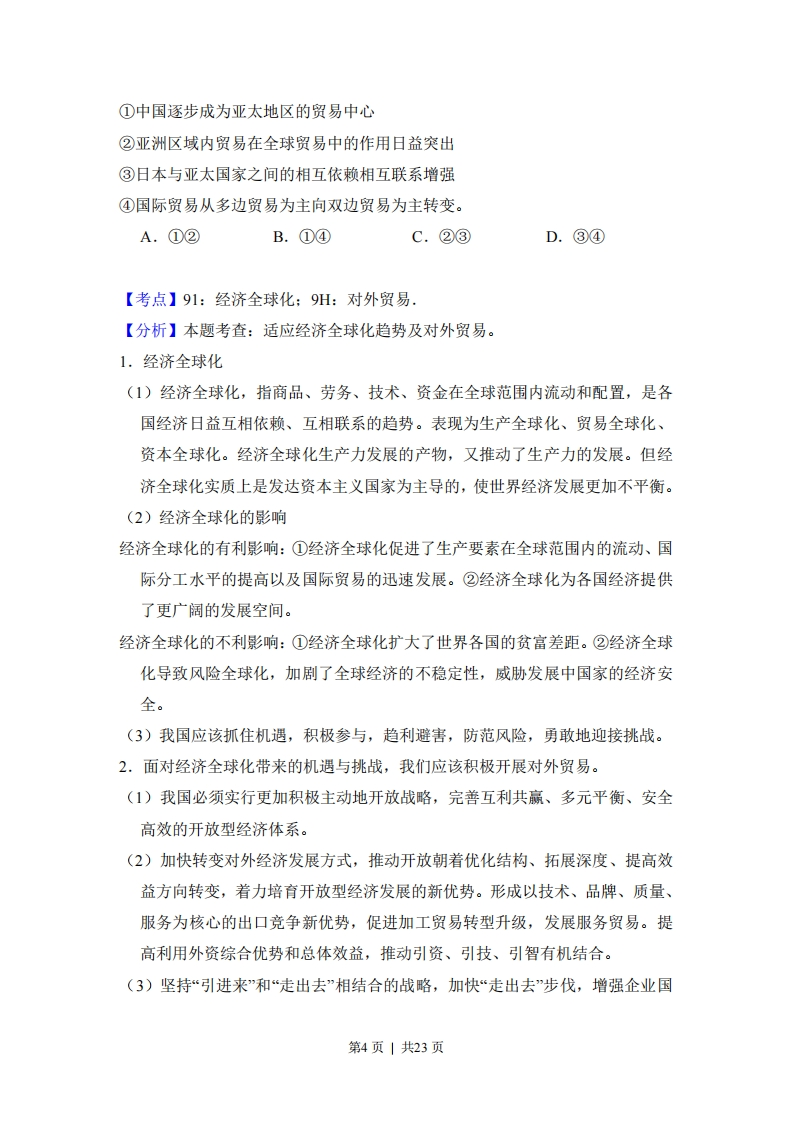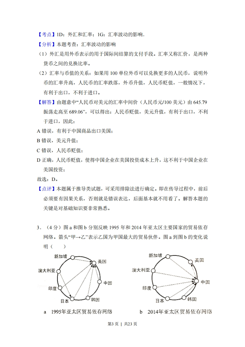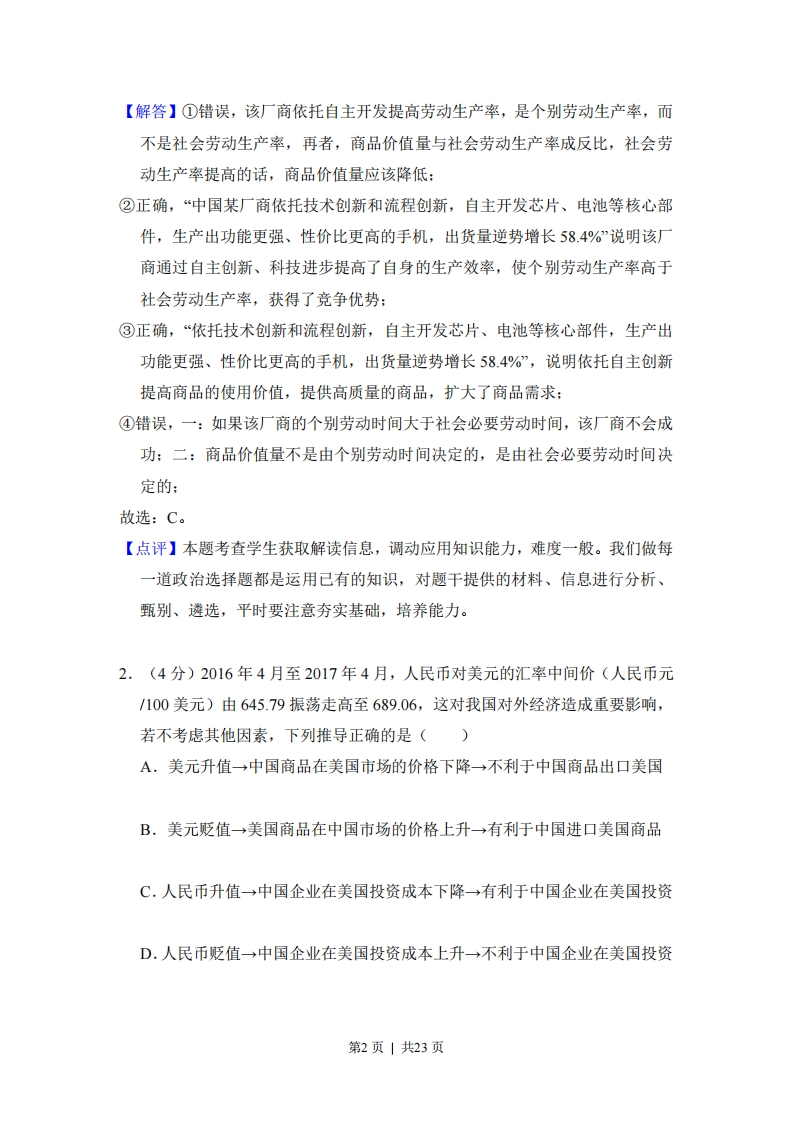 2017年全国统一高考政治试卷(新课标Ⅲ)事考答案与试题佩折一、选择题:本题共12小题,每小题4分,共48分。在每小题给出的四个选项中,只有一项是符合题目要求的。1.(4分)全球智能手机市场品牌众多,竞争激烈。2016年,多数国际厂商出货量同比下滑。中国某厂商依托技术创新和流程创新,自主开发芯片、电池等核心部件,生产出功能更强、性价比更高的手机,出货量逆势增长58.4%.该厂商的成功得益于()①依托自主开发提高社会劳动生产率,使商品价值增加②个别劳动生产率高于社会劳动生产率,获得竞争优势③依托自主创新提高商品的使用价值,扩大了商品需求④个别劳动时间大于社会必要劳动时间,商品价值增加。A.①②B.①④C.②③D.③④【考点】22:价值量与劳动生产率关系:56:企业经营与发展.【分析】本题考查:企业的经营与发展:价值量与劳动生产效率关系1.企业的经营与发展①制定正确的经营战略,开发适应市场适销对路、有市场前景的产品,正确市场定位等:积极开拓国内市场,市场多元化。--市场观念②自主创新、科技进步和科学管理(质量、品牌、服务、劳动生产率,降低成本),形成自己独特的竞争优势:转变发展方式,依靠科技进步、科学管理和劳动者素质的提高,实现又好又快发展:--效益观念③依法诚信经营,承担社会责任,树立良好的信誉和企业形象。经济效益和社会效益相结合、质量、品牌、服务:责任、质量观念。2.价值量与劳动生产效率关系商品价值量不是由个别劳动时间决定的,是由社会必要劳动时间决定的,与社会劳动生产率成反比,与个别劳动生产效率无关,商品价值总量与社会劳动生产率无关,与个别劳动生产效率成正比。第1页|共23页