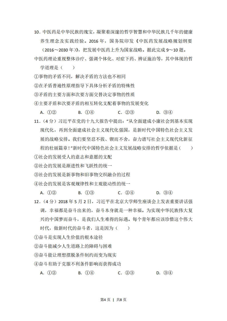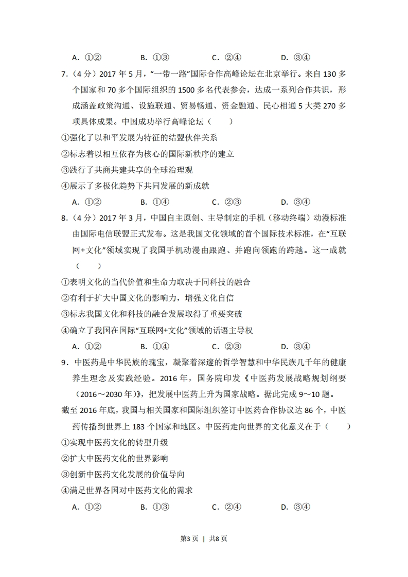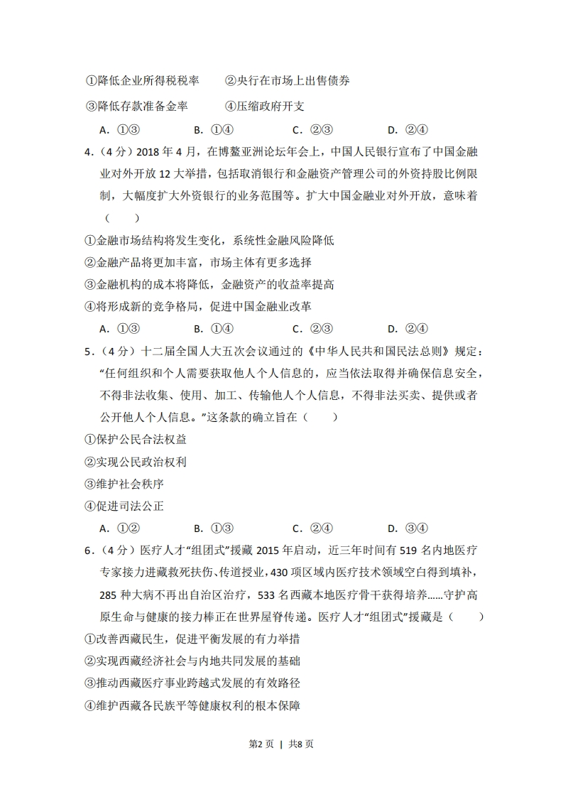2018年全国统一高考政治试卷(新课标Ⅱ)一、选择题:本题共12题,每小题4分,共48分。在每小题给出的四个选项中,只有一项是符合题目要求的。1.(4分)甲、乙、丙是三种相关商品,当甲的价格上升后,乙与丙的需求变动如图所示。价格PDD价格P+数量Q数量Q乙商品丙商品这表明()①甲与乙是互补品②甲与乙是替代品③甲与丙是替代品④甲与丙是互补品⑤乙与丙是替代品⑥乙与丙是互补品A.①③B.②④c.②⑤D.④⑥2.(4分)某国是全球最大的钢铁进口国。2018年3月该国决定将进口锅铁关税大幅度提高至25%.不考虑其他因素,短期内上调关税对该国钢铁制成品消费的影响路径是()①钢铁进口成本上升②国家关税收入增加③锅铁制成品价格上涨④锅铁企业利润增加⑤消费者的利益受损⑥消费者的利益增加A.①→③→⑤B.②→④→⑥C.①→②→④D.②→③→④3.(4分)近三年来,某国财政赤字率和通货膨胀率的变化如表所示。年份2015年2016年2017年指标财政赤字率3%4.2%6.7%通货膨胀率5%7.5%13%为了应对这种局面,该国可采取的政策措施是(第1页1共8页