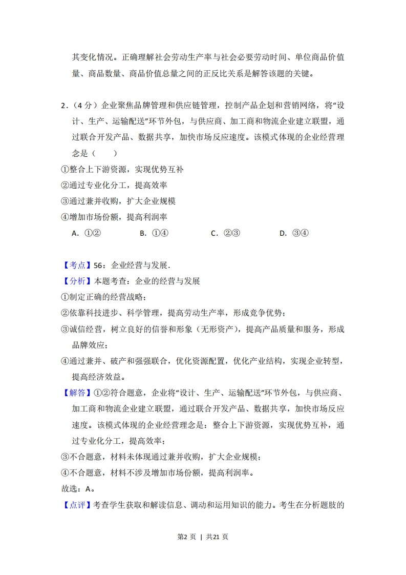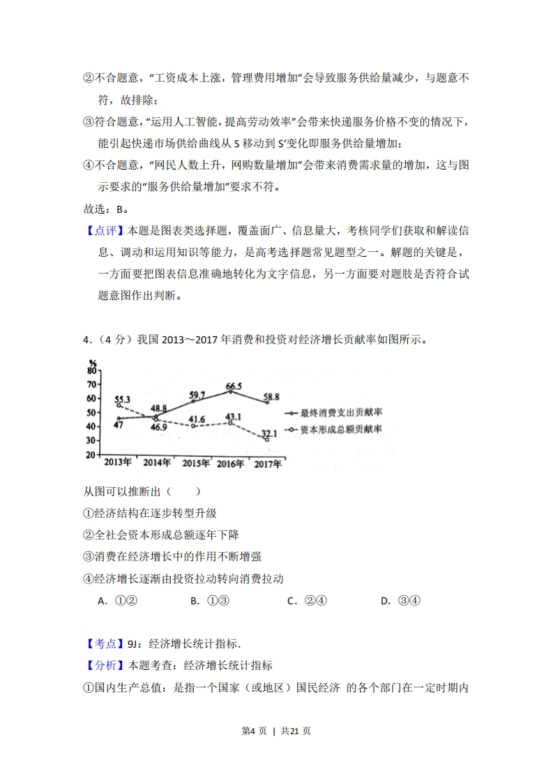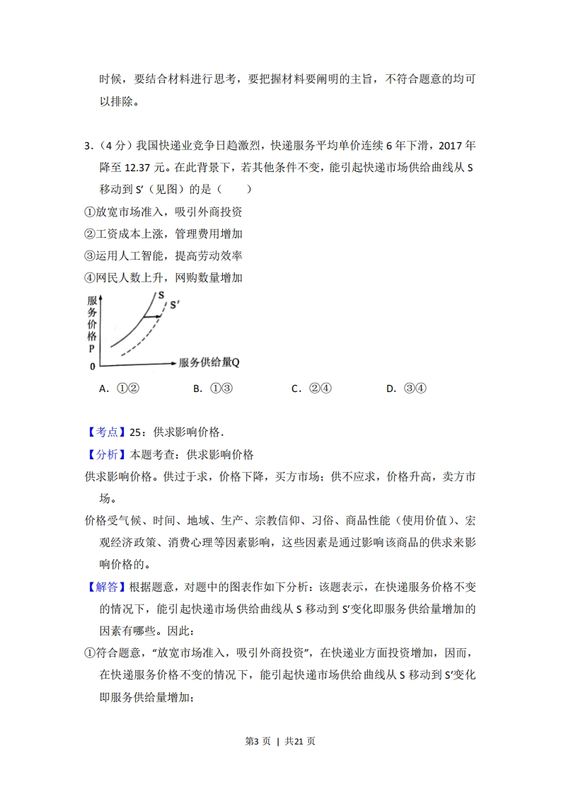 2018年全国统一高考政治试卷(新课标I)事考答来与试想解析一、选择题:本题共12小题,每小题4分,共48分。在每小题给出的四个选项中,只有一项是符合题目要求的。1.(4分)根据马克思的劳动价值理论,如果生产某种商品的社会劳动生产率提高,在其他条件不变的情况下,与生产该商品相关的判断如表所示。序号社会必要劳动时间单位商品价值量商品数量商品价值总量①缩短降低增加不变②缩短降低增加增加③不变增加降低不变④不变降低增加增加其中正确的是()A.①B.②C.③D.④【考点】L4:马克思的劳动价值理论,【分析】本题考查:马克思的劳动价值理论商品价值量不是由个别劳动时间决定的,是由社会必要劳动时间决定的,与社会劳动生产率成反比,与个别劳动生产效率无关,商品价值总量与社会劳动生产率无关,与个别劳动生产效率成正比。【解答】A正确,当生产某种商品的社会劳动生产率提高,在其他条件不变的情况下,意味着社会必要劳动时间缩短,社会劳动生产率与单位商品价值量成反比,那么此时,单位商品价值量降低,商品数量增加,商品价值总量与社会劳动生产率无关,那么此时,商品价值总量不变:BCD不合题意,这三项与上述分析都不符,故都不选。故选:A。【点评】本题以图表的形式考查马克思的劳动价值理论,考查学生的阅读、理解及归纳问题的能力,解答本题需要学生认真分析图示及图表中的各项数据及第1页|共21页