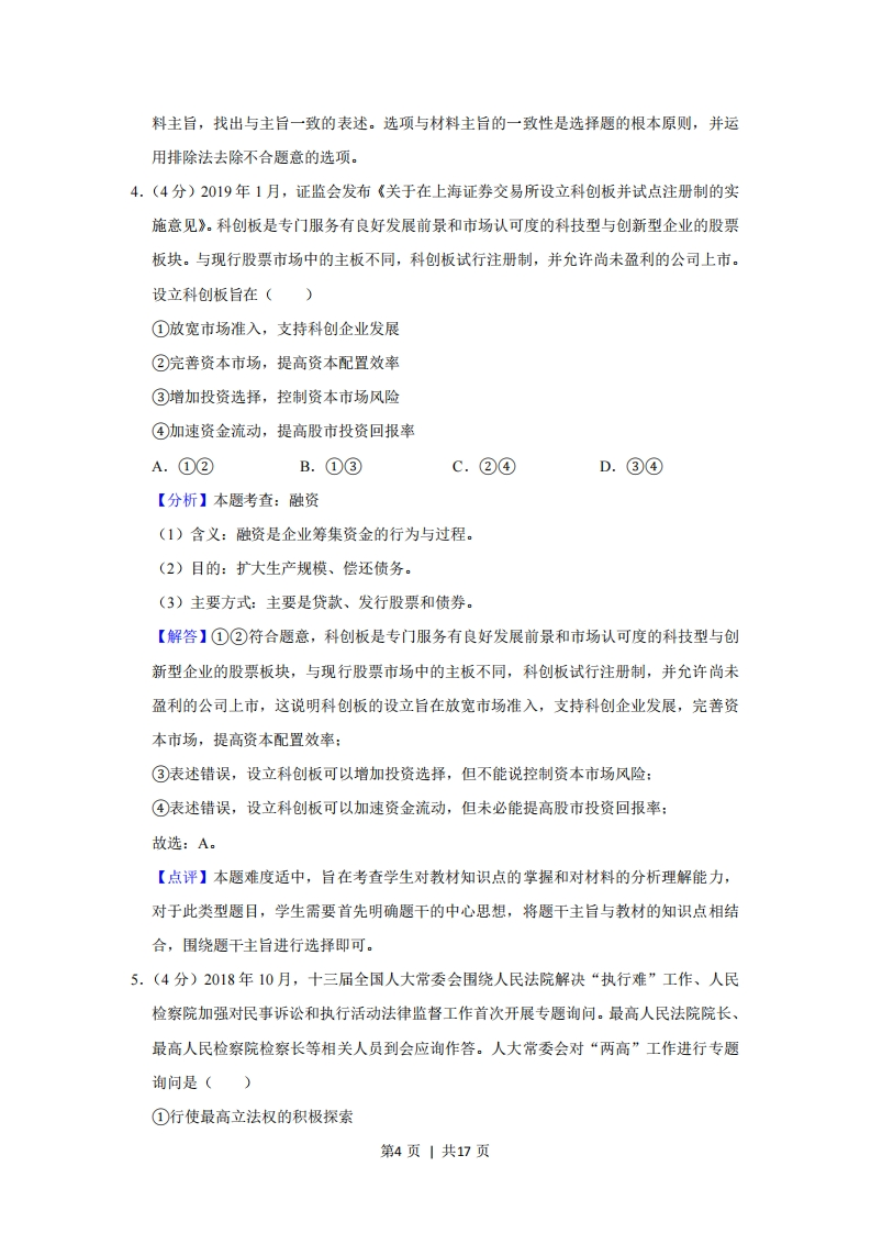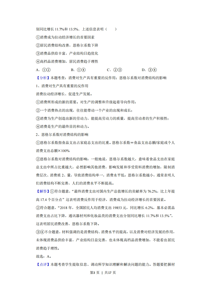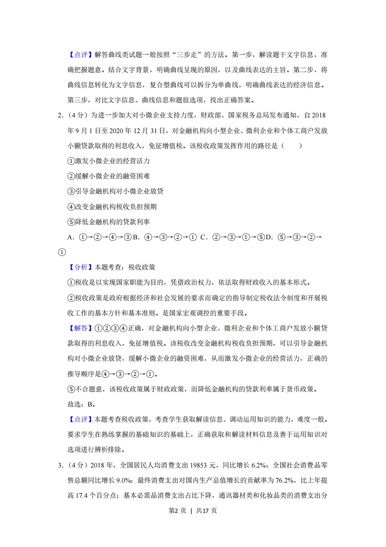 2019年全国统一高考政治试卷(新课标Ⅱ)套考答案与试题解析一、选释题:本题共11小题,每小题4分,共48分。在每小题给出的四个选项中,只有一项是符合题目要求的。1.(4分)某国生产新闻纸所需要的纸浆以固废纸为原料,消耗的固废纸20%以上依赖进口。出于环保需要,2019年该国开始限制固废纸进口。不考虑其他因素,正确反映短期内该国新闻纸价格变化的图示是(图中S表示供给,D表示需求)()PP(价格)(价格)SSPPPDD2)DD)0AQ(数量)BQ(数量)pp(价格)(价榕才S(S2)SPP(P2)P一DDDQ数量)DQ(数量)【分析】本题考查:价格与供求的关系价值决定价格,供求影响价格,价格也会影响供求。一般来说,当供给大于需求时,价格下降,当需求大于供给时,价格上升。当价格上升时,供给增加,需求下降,当价格下降时,供给下降,需求增加。【解答】某国生产消耗的固废纸20%以上依赖进口,出于环保需要,2019年该国开始限制固废纸进口,不考虑其他因素,表明需求不变的同时,供给减少,价格上涨。A不合题意,该图表示供给不变,需求增加,价格下降,与题意不符。B符合题意,该图表示需求不变,供给减少,价格上涨,与题意相符。C不合题意,该图表示需求减少,供给减少,题中强调的是供给减少,需求不变,与题意不符。D不合题意,该图表示供给不变,需求增加,价格上涨,与题意不符。故选:B。第1页|共17页