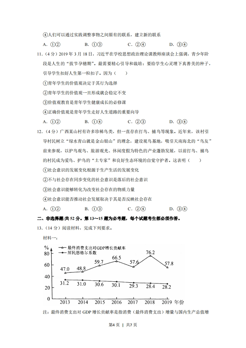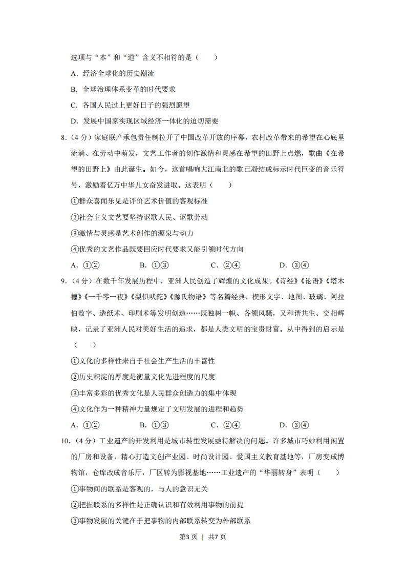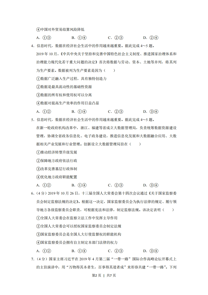 2020年全国统一高考政治试卷(新课标I)一、选择题:本题共11小题,每小题4分,共48分。在每小题给出的四个选项中,只有一项是符合题目要求的。1.(4分)新冠肺炎疫情发生以后,医用口罩、防护服、消毒液等防疫物资一度紧缺,不少大型制造企业开启了“跨界”生产之路,如某电器集团紧急成立医疗子公司,迅速调整生产计划,很快向市场提供医疗物资生产设备和医用口罩。企业短时间内紧急转产、快速投产,说明()①我国相关制造业有完整灵活的供应链②市场需求对企业生产有重要导向作用③企业具有转产防疫产品的前瞻性战略④企业可以通过转产快速化解市场风险A.①②B.①④C.②③D.③④2.(4分)为发挥农业保险对支农惠农、促进农业发展的作用,中央财政于2007年开始实施农业保险保费补贴政策。截至2019年底,农业保险累计支付赔款2400多亿元,服务农户数从0.5亿户次增至1.8亿户次,提供的风险保障从0.1万亿元增加到3.6万亿元。农业保险保费补贴政策发挥作用的路径是()①获得财政补贴,降低成本支出②增加生产投入,促进产业发展③购买农业保险,支付保险费用④转移灾害风险,稳定收入预期A.①-③-→④→②B.①→③②→④C.③-→①④-→②D.③-→①②-④3.(4分)2015年10月,人民币跨境支付系统(CPS)正式启动。CIPS是由中国人民银行组织开发,为境内外金融机构人民币跨境和离岸业务提供资金清算与结算服务的系统。截至2020年5月末,有96个国家和地区的969家银行接入该系统。CIPS的推广使用表明()①人民币实现跨境自由流动②人民币国际化进程加速③人民币在全球可自由兑换第1页1共7页