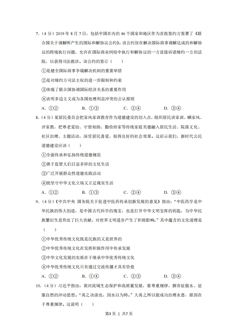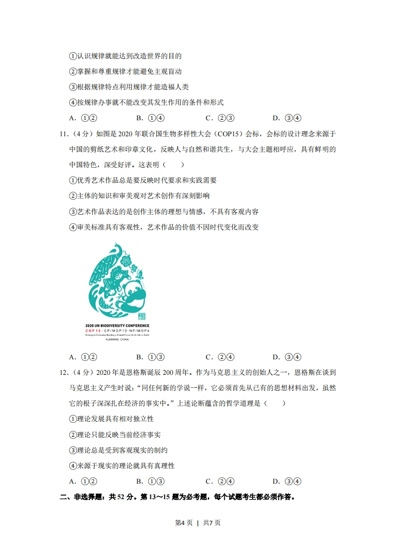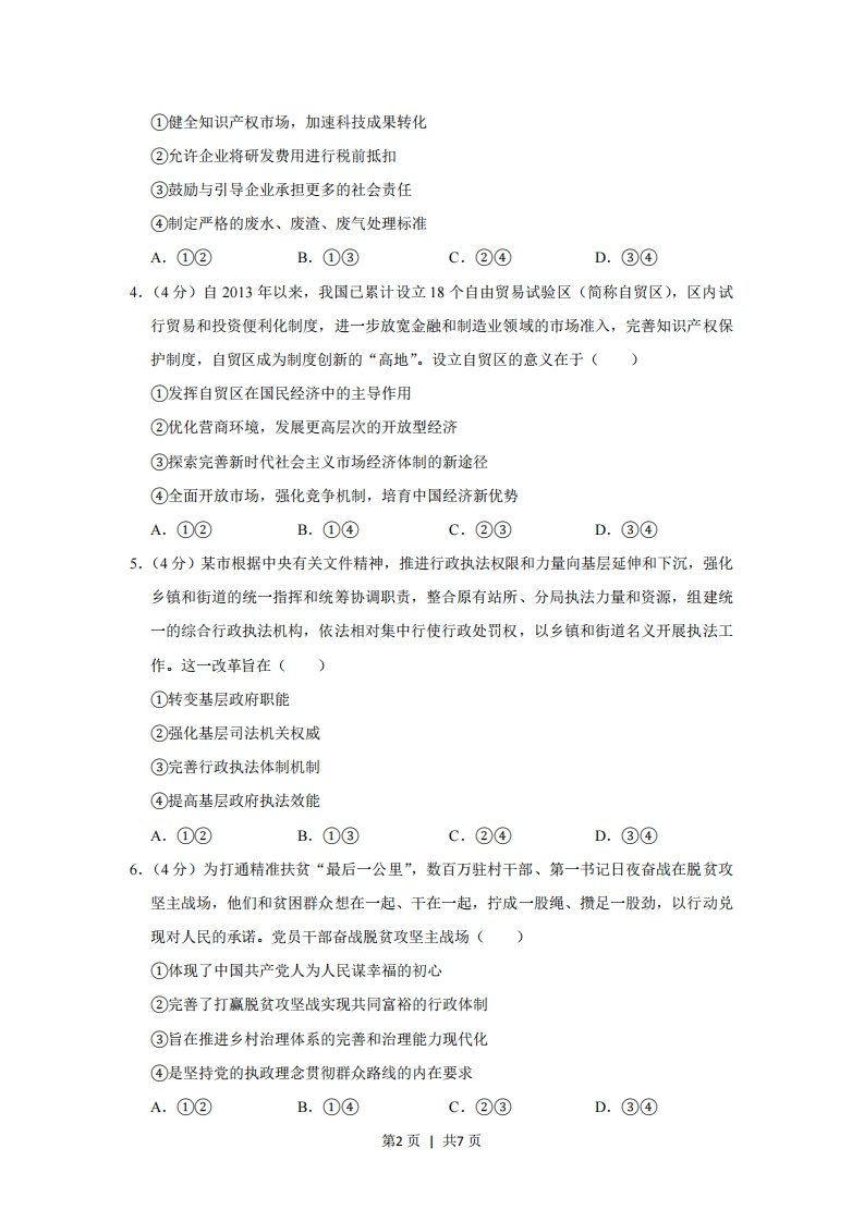 2020年全国统一高考政治试卷(新课标Ⅱ)一、选释题:本题共12小题,每小题4分,共48分。在每小题给出的四个选项中,只有一项是符合题目要求的。1.(4分)一双限量版运动鞋,官网标价千余元,线上倒手几次价格就能翻到几万:有人甚至声称自己靠炒鞋月入十几万一段时间以来,炒鞋不断升温,引发媒体关注,并纷纷提示风险。炒鞋行为存在风险的原因在于()①鞋己不具有使用价值,其交易不是商品交换②鞋的价格远远高于鞋的价值,背离了价值规律③猎助网络交易平台炒鞋,货币难以充当流通媒介④资本追逐不断推高价格,鞋的价值越来越难以实现A.①②B.①③C.②④D.③④2.(4分)近年来,中国铁路上海局集团、南昌局集团、成都局集团等发布消总,对所属高铁列车执行票价调整:以公布票价为最高限价,分季节、分时段、分席别、分区段在限价内实行多档次票价,最大折扣幅度5.5折。对高铁车票实行差异化定价,意在()①增加高铁供给,提高市场占有率②发挥价值规律作用,让市场供求决定价格③运用价格机制,提高高铁运营效率(④形成合理比价,正确反映市场供求关系A.①②B.①③C.②④D.③④3.(4分)2016一2019年某国工业企业的成本和利润率指标变化如图所示。成本(元)利润率(%)86上85.76.46.85.56.50◆8585.0846.058到83.96.00835.50002016年2017年2018年2019年口每百元生营业务收入中的成本◆上营业务收入利润率2016~2019年某国工业企业的成本和利润率指标变化下列政策措施中,有利于保持图中指标变化趋势的是()第1页1共7页