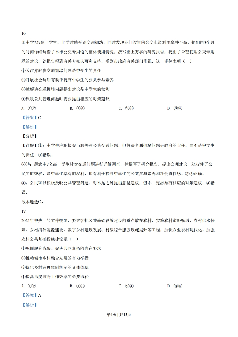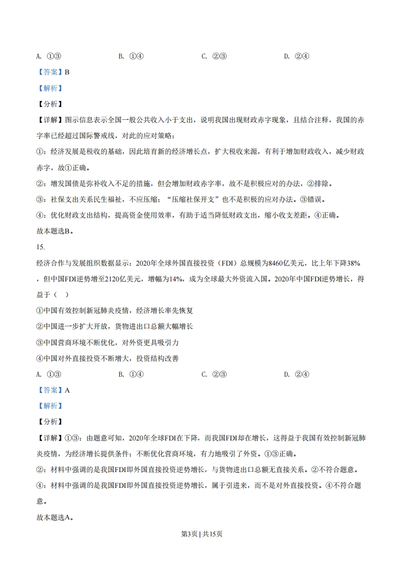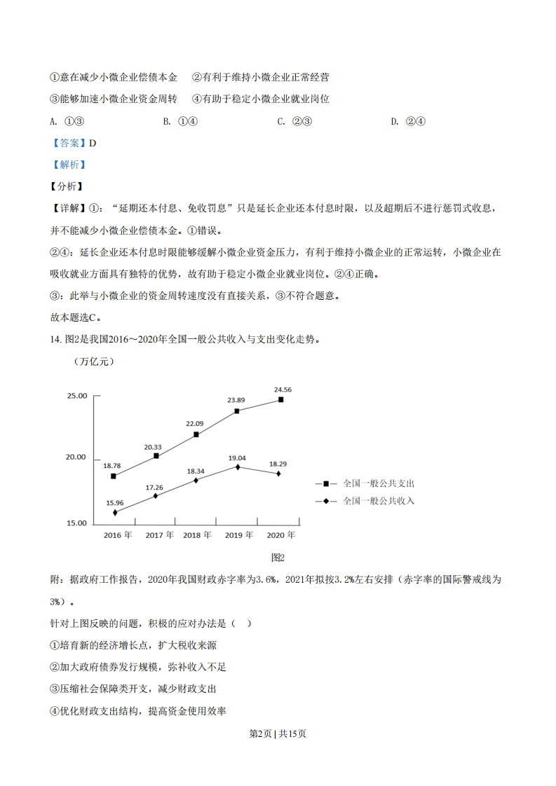 绝密★启用前2021年普通高等学校招生全国统一考试文科综合能力测试·政治部分注意事项:1,答卷前,考生务必将自已的姓名、准考证号填写在答题卡上。2.回答选择题时,选出每小题答案后,用铅笔把答题卡上对应题目的答案标号涂黑。如需改动,用橡皮擦干净后,再选涂其他答案标号。回答非选择题时,将答案写在答题卡上.写在本试卷上无效。3。考试结束后,将本试卷和答题卡一并交回。一、选择题:本题共35小题,每小题4分,共140分。在每小题给出的四个选项中,只有一项是符合题目要求的。12.甲国经济对外贸的依存度高,其进出口贸易以美元结算。在开放市场条件下,当甲国发生通货膨胀时,若不考虑其他因素,甲国货币对美元的汇率会下降。关于这一作用过程的描述,正确的是()①进口商品增加→美元需求增加②进口商品减少→美元需求减少甲国通货膨胀甲国货币汇率下降③出口商品增加→美元供给增加④出口商品减少→美元供给减少A.①③B.①④C.②③D.②④【答案】B【解析】【分析】【详解】①②:甲国发生通货膨胀,物价上涨,进口增加,美元需求增加,①正确,②错误。③④:甲国发生通货膨胀,物价上涨,出口商品减少,美元供给减少,④正确,③错误。故本题选B。13.2021年1月,中国人民银行会同有关部门发布通知明确:2020年6月出台的普惠小微企业贷款延期还本付息政策延期至2021年3月31日,免收罚息:对于2021年1月1日至3月31日期间到期的普惠小微企业贷款,按市场化原则“应延尽延”,继续实施阶段性延期还本付息。此举()第1页1共15页