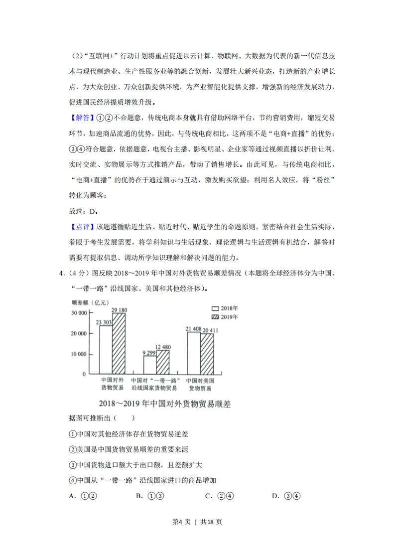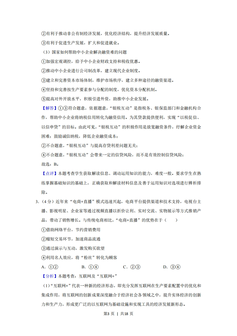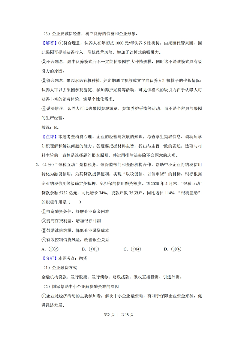 2020年全国统一高考政治试卷(新课标Ⅲ)◆考答案与试题解析一、选择题:本题共12题,每小题4分,共48分。在年小题给出的四个选项中,只有一项是符合题目要求的。1.(4分)某果园尝试新的运营模式:认养人在年初按1000元/年认养5株桃树,由果园代管,果园将收获的桃子寄给认养人。合同约定,寄送的桃子数量由桃树的实际收成确定:果园承诺有机种植,并定期通过视频或文字向认养人汇报桃子的生长情况:认养人可以去果园参观游览、参加养护采摘等活动。果园的桃树很快被认养一空。该模式的吸引力在于()①果园可提前获得销售收入,降低经营风险②果园可扩大种植规模,提高生产效率③认养人可获得丰富的消费体验,满足个性化需求④认养人可全程参与果园的生产经营,维护自身权益A.①②B.①③C.②④D.③④【分析】本题考查:消费心理:企业的经营与发展1、消费心理(1)从众心理引发的消费,盲目从众不可取。(2)求异心理引发的消费,过分标新立异不值得提倡。(3)攀比心理引发的消费,不健康的消费心理。(4)求实心理主导的消费,是一种理智的消费。2、企业经营与发展(1)企业要制定正确的经营战略,这是企业经营的航标。但是,正确的经营战略,要出自高素质的决策群,他们必须把握市场动向,捕捉市场信息,引领市场先机,开发有市场前景的产品。(2)企业要提高自主创新能力,依靠技术进步、科学管理等手段,形成自己的竞争优势。这是现代企业发展最重要的方法和途径,也是提高我国整体竞争力与国民经济整体水平的主要途径。只有依靠技术进步、科学管理,企业才能在产品价格、产品质量、服务水平、品牌效应等方面取得竞争优势。第1页|共18页