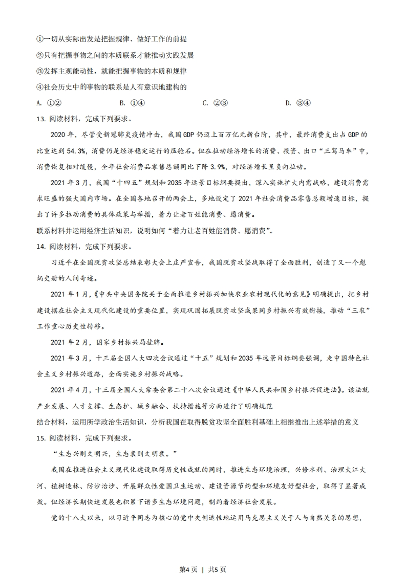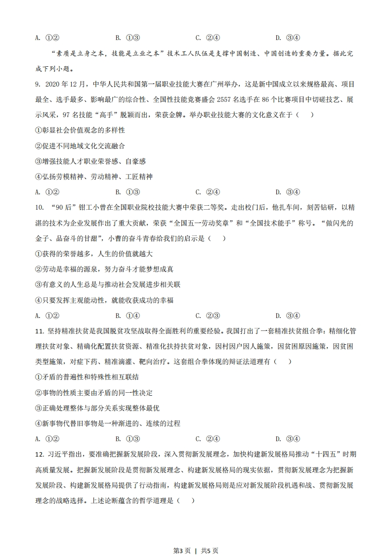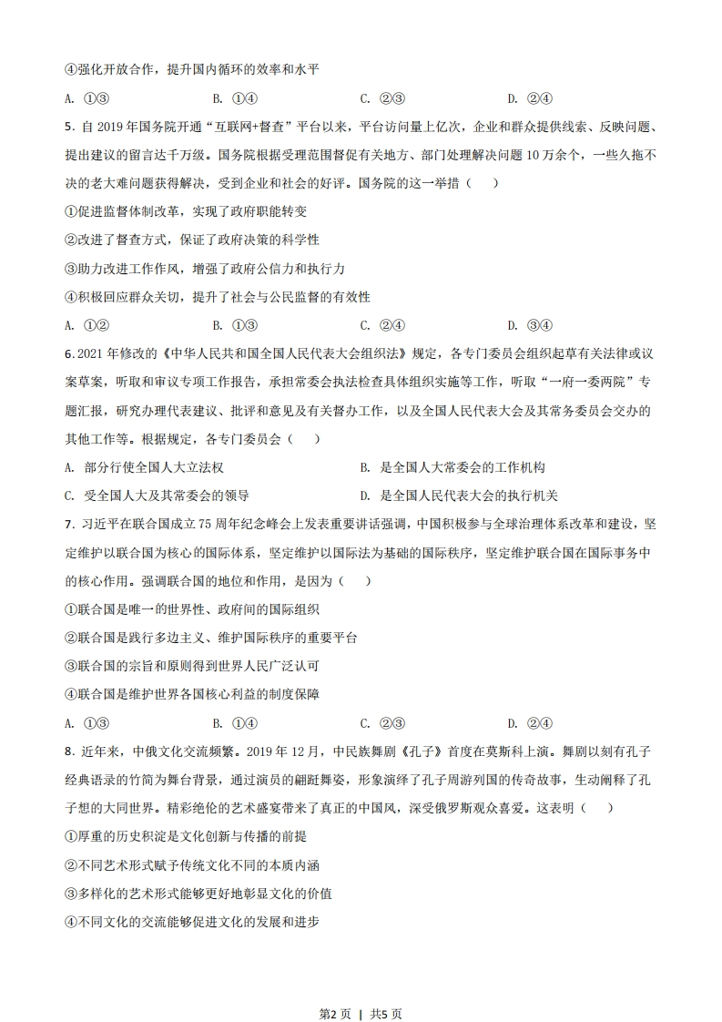 2021年高考全国甲卷政治试题1.为促进新能源汽车业发展,一些地方采取购置补贴和免征购置税等政策。在此背景下,这些地方燃油汽车的需求会受到一定影响在其他因素不变的条件下,正确反映这些地方汽车需求变化趋势的图示是()P(价格)P(价格)+Q(数量)+0(数量)新能源汽车新能源汽车①⊙@P(价格)P(价格)Q数量)BQ(数量)燃油汽车燃油汽车③④A.①③B.①④c.②③D.②④2.对于传统百货商场来说,超市和家电连锁大卖场的出现使其经营陷入困境,而互联网电商的出现,又使超市和家电连锁大卖场的经营受到冲击。上述现象背后的经济逻辑是()A.商业模式创新提升成本优势B.科技进步减少商品流通环节C.数字营销增加商品的附加值D.居民收入增长改变消费习惯3.2021年,某地改变养老补贴模式,将每人每月300元一600元不等的补贴资金储值在专门账户,失能,失智、孤寡、独居老人可自主选择养老机构和专业人员提供陪护、助浴、修剪指甲等上门服务:服务费用按规定服务次数和时长从专门账户中抵扣,超额部分按照市场价格收费。相对于现金直补,该模式可()①引导资金使用方向,更好发挥补贴资金作用②加快资金周转速度,充实养老保障资金③促进养老服务质量提升,更好满足老人需求④利用价格调节机制,合理配置养老资源A.①③B.①④C.②③D.②④4.近些年来,中国经济总量和发展水平不断提高同时,中国经济外部环境日益错综复杂。2020年7月21日,习近平在企业家座谈会上强调,要逐步形成以国内大循环为主体、国内国际双循环相互促进的新发展格局。构建双循环新发展格局应当()①发挥内需潜力,更好联通和利用国内国际两个市场②建立独立的产业链供应链,有效应对外部经济波动③立足自给自足,逐步降低经济的对外依存度第1页1共5页