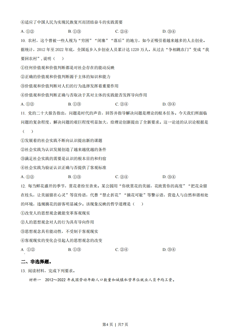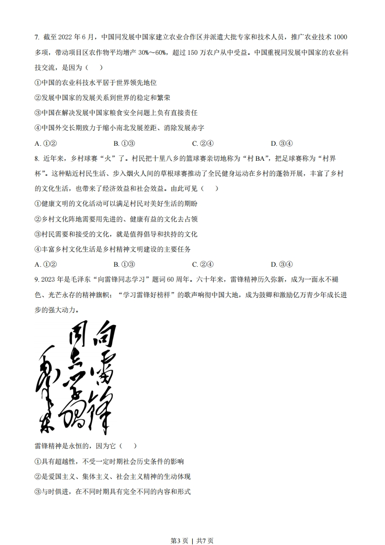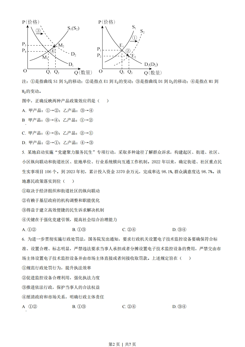 2023年普通高等学校招生全国统一考试(全国乙卷)思想政治一、选择题。1.劳动课程成为义务教育阶段一门独立课程后,一些企业加大了儿童劳动工具的开发与生产,销售市场也不断升温,如浙江义乌小商品市场儿童使用的锅、碗、炉、勺、铲等厨具销售火爆。上述现象反映的经济道理是()①生产决定消费的内容,生产什么就消费什么②市场需求引导供给,市场需要什么就生产什么③生产为消费创造动力,供给转型才能扩大需求④消费对生产有反作用,新消费热点催生新生产业态A.①③B.①④C.②③D.②④2.某农机企业为了推广智能农业机械,推出一种新的营销服务模式。该模式允许农户选择短期租赁、系统代运营服务,农户支付较低服务费用后获得业务支持,如播种、杂草控制、施肥、灌溉、土壤分析等。目前,这种服务模式得到大面积推广。该模式被市场广泛认同的原因在于()①减少农机研发成本,扩大农机生产规模②推动智能化生产,提高农产品销售价格③加速农机运营周转,增加农机使用效益④降低农户生产劳动强度,提高经营效率A.①②B.①③C.②④D.③④3.《管子》中记载:鲁梁两国百姓惯于织绨(古代一种织物)。齐国禁止国内织绨并要求所需绨服全部从鲁梁购买,同时齐桓公带头穿绨服,百姓纷纷仿效,结果绨价大涨。鲁梁国君遂要求百姓少种粮而全力发展绨业。然而一年多后,齐桓公率百姓改穿帛服,并封闭关卡与鲁梁断绝经济往来。很快鲁梁粮价飞涨,百姓陷入饥荒,纷纷投奔齐国。三年后,鲁梁臣服于齐国。从中可获得的启示是()①粮食安全是一国经济安全的底线②生产分工会加剧一国经济发展不平衡③经济结构单一存在潜在经济风险④对外贸易畅通是一国经济发展的保证A.①③B.①④C.②③D.②④4.为刺激消费增加生产,政府出台了一系列政策,对购买甲种产品发放消费补贴,对生产乙种产品的企业减税降费,由此引起这两种产品的供需变化,如下图所示。第1页」共7页