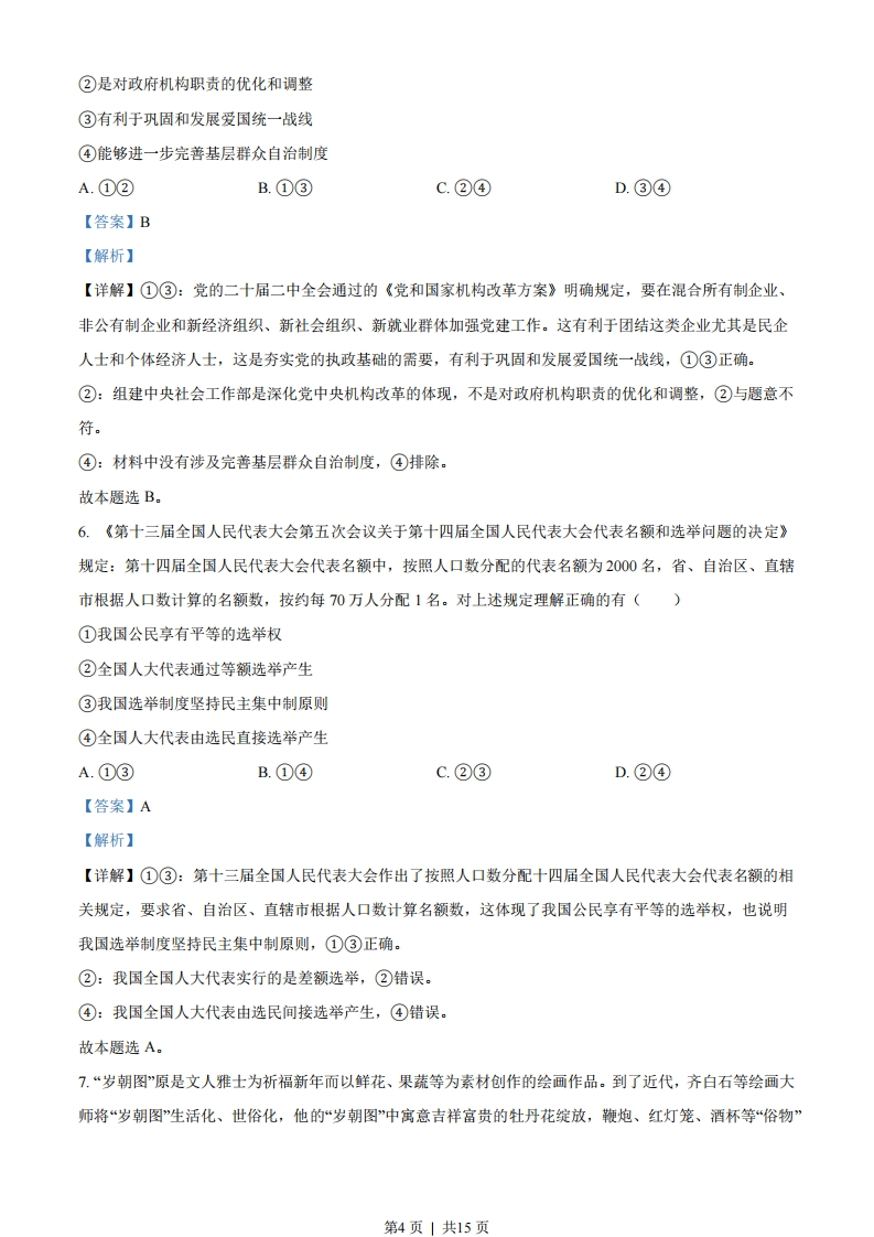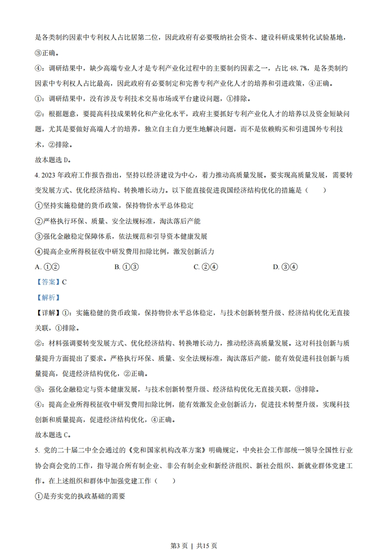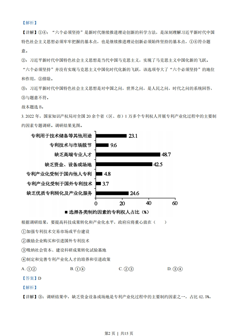 绝密★启用前2023年普通高等学校招生全国统一考试(新课标卷)文科综合思想政治学科一、选择题。1.马克思和恩格斯共同创立了科学社会主义,实现了社会主义从空想到科学的伟大飞跃。科学社会主义之所以是科学,是因为它()①对未来的共产主义社会进行了原则性描述②对现存的资本主义社会进行了深刻的批判③以唯物史观和剩余价值学说为理论基础④找到了实现人类解放的社会力量和正确道路A.①②B.①③c.②④D.③④【答案】D【解析】【详解】③④:科学社会主义之所以科学,是因为它以唯物史观和剩余价值学说为理论基石,揭示了人类社会的一般规律和资本主义运行的特殊规律,找到了无产阶级这一实现人类解放的社会力量,指明了实现人类彻底解放的正确道路,这也是科学社会主义超越空想社会主义的地方。③④符合题意。①②:空想社会主义也对资本主义社会进行了深刻的批判,对未来共产主义社会的图景进行了勾画,但他们主张阶级调和,反对阶级斗争,看不到广大人民群众特别是无产阶级的力量,没有找到社会变革的正确途径,因此这两个选项不能表明科学社会主义相对于空想社会主义的进步性,即不能说明其科学性,①②与题意不符。故本题选D。2.党的二十大报告强调,继续推进实践基础上的理论创新,首先要把握好新时代中国特色社会主义思想的世界观和方法论,坚持好、运用好贯穿其中的立场观点方法。必须坚持人民至上,必须坚持自信自立,必须坚持守正创新,必须坚持问题导向,必须坚持系统观念,必须坚持胸怀天下。“六个必须坚持”()①是新时代继续推进理论创新的科学方法②实现了马克思主义中国化时代化新的飞跃③是对中国之问、世界之问、人民之问、时代之问的系统回答④是深刻领会习近平新时代中国特色社会主义思想必须把握的基本点A.①②B.①④c.②③D.③④【答案】B第1页|共15页