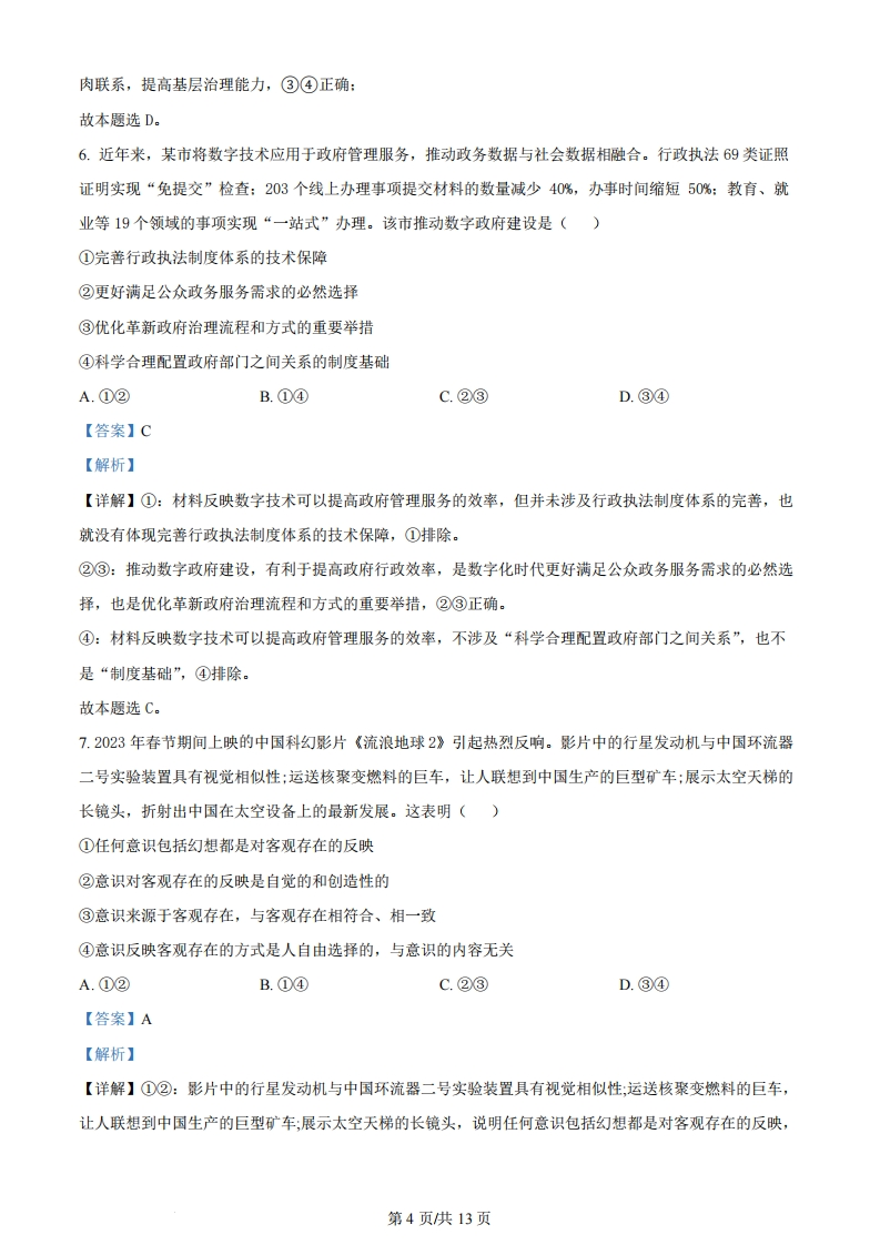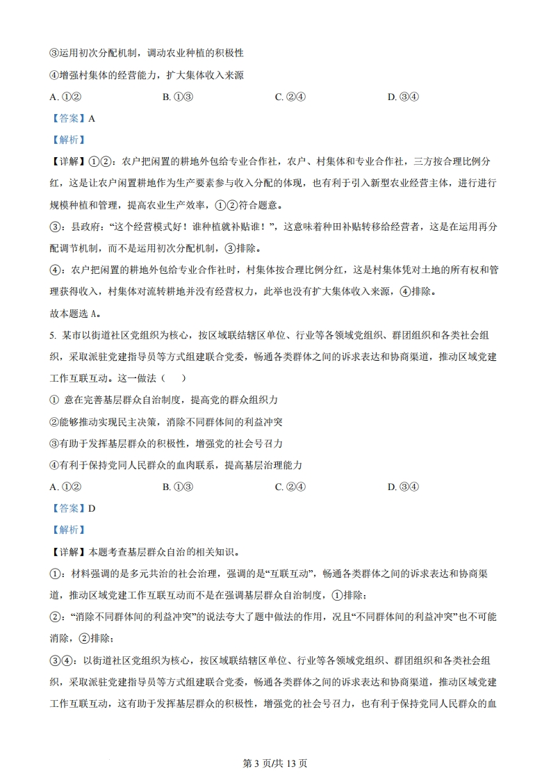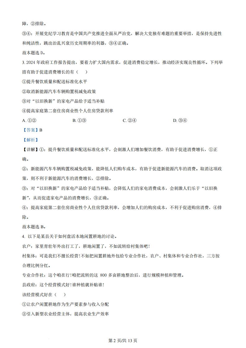 2024全国高考新课标卷政治试题1.在社会主义发展史上,空想社会主义者在批判资本主义带来的各种灾难和罪恶的同时,也描绘了未来理想社会的蓝图。反映空想社会主义者为建立美好社会而努力的有()①缔结反映各族人民意愿的国家联盟②进行共产主义的“新和谐公社”新村实验③成立被誉为新社会的光辉先驱的巴黎公社④倡导建立人人劳动、普遍协作的“和谐制度”A.①②B.①③C.②④D.③④【答案】C【解析】【详解】①:空想社会主义没有提出缔结反映各族人民意愿的国家联盟的主张,①排除。②④:新和谐公社是英国空想社会主义者欧文建立的理想模型,“和谐制度”构想是由法国空想社会主义者傅立叶提出,倡导建立人人劳动、普遍协作的“和谐制度”。虽然最终失败了,但也是一次有意义的尝试。这种尝试及其思想,为后来马克思主义的产生起到了重要作用,②④符合题意。③:空想社会主义是一种理论,其构想和原则并没有在实践中得到真正的实现:而巴黎公社则是一场实际的革命运动,它试图通过建立无产阶级政权来实现社会主义的理想。巴黎公社不是空想社会主义的主张也不是其实践活动,③排除。故本题选C。2.中共中央办公厅2024年印发的《关于在全党开展党纪学习教育的通知》指出,为了深入学习贯彻修订后的《中国共产党纪律处分条例》,经党中央同意,自2024年4月至7月,在全党开展党纪学习教育。开展党纪学习教育是中国共产党()①区别于其他政党的显著标志②以伟大自我革命引领伟大社会革命的政治保障③推进全面从严治党,解决大党独有难题的重要举措④保持先进性和纯洁性,跳出治乱兴衰历史周期率的利器A.①②B.①③C.②④D.③④【答案】D【解析】【详解】①:勇于自我革命是中国共产党区别于其他政党的显著标志,①排除。②:开展党纪学习教育为中国共产党以伟大自我革命引领伟大社会革命提供坚强纪律保障,不是政治保第1页供13页