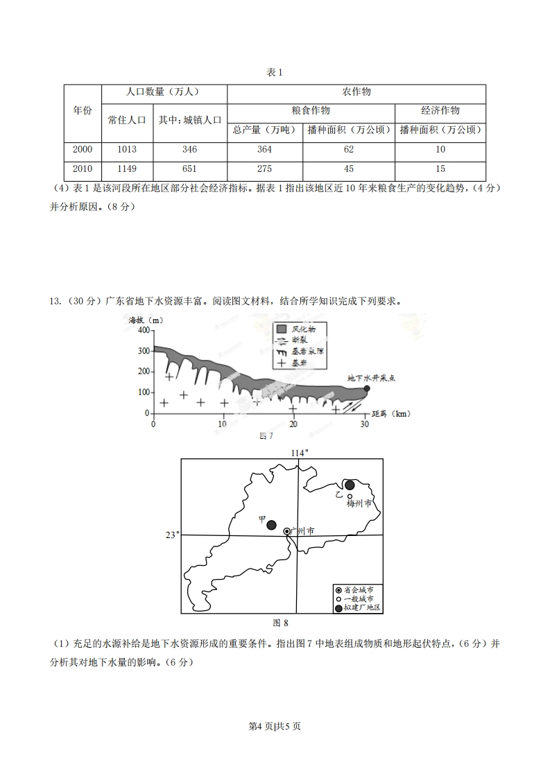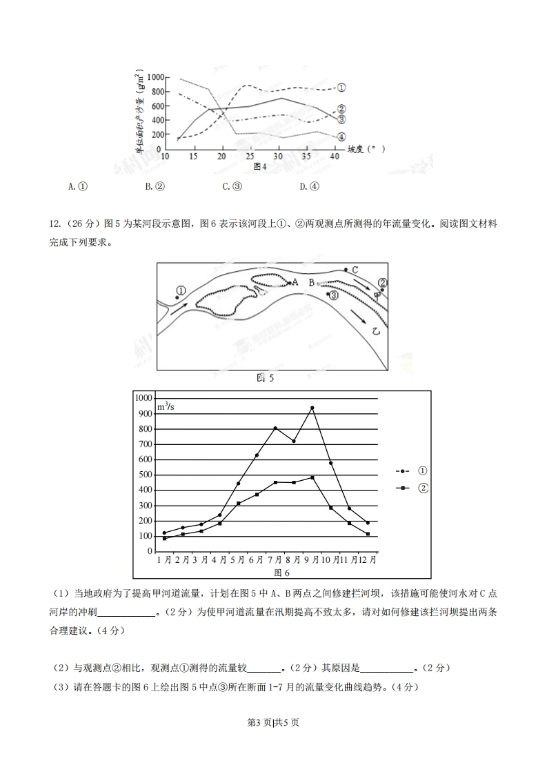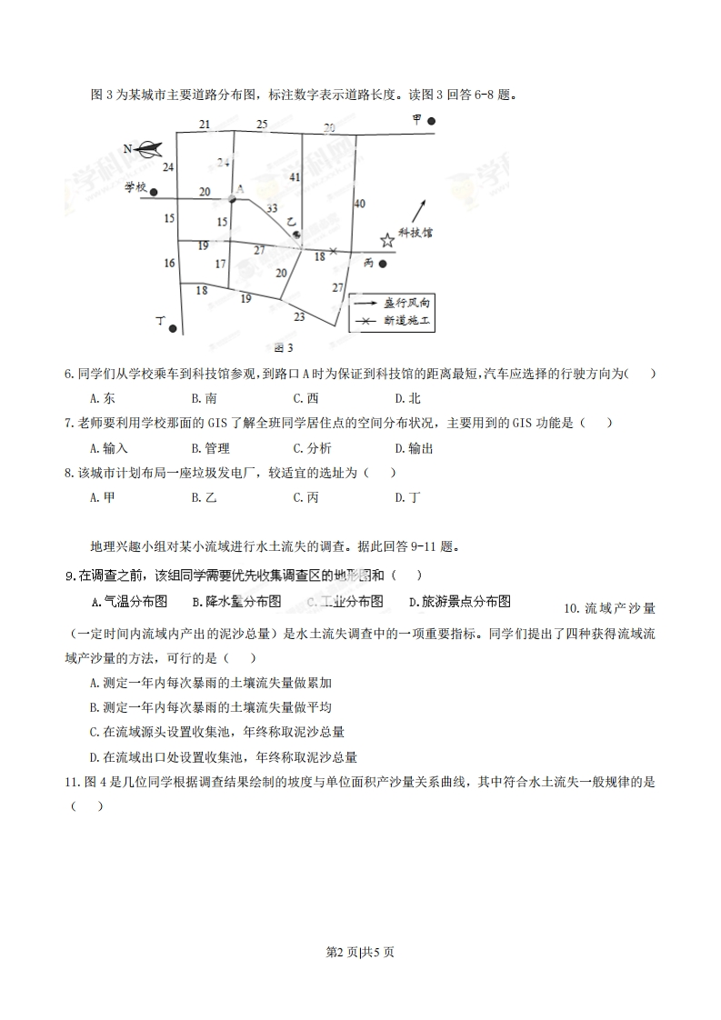 2013年普通高等学校招生全国统一考试(重庆卷)文科综合地理图1是47°N部分地点海拔与年降水量对照图,读图1,回答1-3题。800⊙解水量800■海技7007006005005004003002002001001001251271293123135东经)图11.与乙地相比,甲地年降水量大的主要影响因素是()A.距海距离B.地形条件C.局地水域D.植被分布2.乙地所在地形区春季影响农作物生长的突出自然灾害是()A.虫害B.冻害C.滑坡D.洪水3.材料所示地区河流具有的共同特征是()A.含沙量高B.流程较短C.春、夏汛明显D.冰川补给为主图2为美国与巴西两国城市的土地、淡水、能源产出效益图。读图2回答4-5题。801050☑3眉瓷10国装0图24.两国相比()A.淡水产出效益美国低于巴西B.淡水产出效益相等C.能源产出效益美国低于巴西D.能源产出效益相等5.与巴西相比,形成美国城市土地产出效益特点的原因可能是()A.国土面积广大B.城市绿地面积大C.城市人口比重高D.科技发展水平高第1页供5页图3为某城市主要道路分布图,标注数字表示道路长度。读图3回答6-8题。212521甲●2441学校。2033405乙19☆科被馆21618×17两●201827盛行风向23断道施工西36.同学们从学校乘车到科技馆参观,到路口A时为保证到科技馆的距离最短,汽车应选择的行驶方向为()A.东B.南C.西D.北7.老师要利用学校那面的GIS了解全班同学居住点的空间分布状况,主要用到的GIS功能是()A.输入B.管理C.分析D.输出8.该城市计划布局一座垃圾发电厂,较适宜的选址为()A.甲B.乙C.丙D.丁地理兴趣小组对某小流域进行水土流失的调查。据此回答9-11题。9.在调查之前,该组同学需要优先收集调查区的地形图和()A.气温分布图B.降水星分布图C.工业分布图D.旅游景点分布图10.流域产沙量(一定时间内流域内产出的泥沙总量)是水土流失调查中的一项重要指标。同学们提出了四种获得流域流域产沙量的方法,可行的是()A.测定一年内每次暴雨的土壤流失量做累加B.测定一年内每次暴雨的土壤流失量做平均C.在流域源头设置收集池,年终称取泥沙总量D.在流域出口处设置收集池,年终称取泥沙总量11.图4是几位同学根据调查结果绘制的坡度与单位面积产沙量关系曲线,其中符合水土流失一般规律的是()第2页供5页
