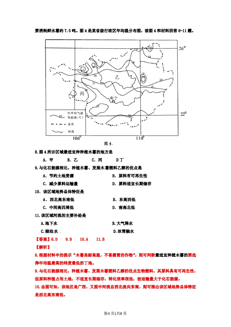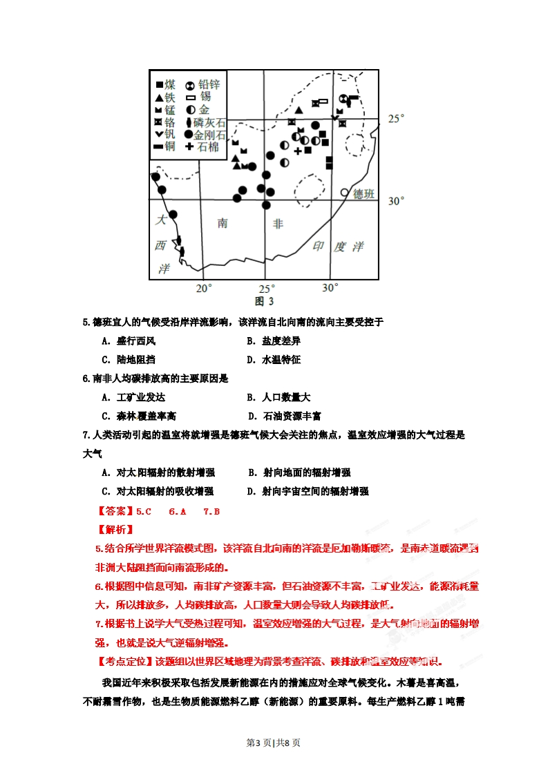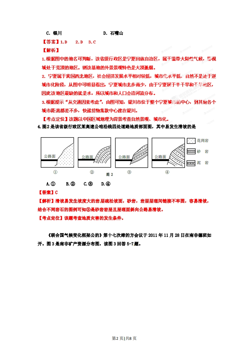 2012年高考重庆文综地理试卷解析(教师版)【试卷总评】该套试题难度适宜。选择题以试题组的形式命愿,2一3、6、9四个小愿分别考查城市化、交通、环境保护和生物能源,其它7道题都是考查自然地理知识:两道综合愿都是以世界区域地理为背景材料命题,重点考查学生对材料阅读理解和综合分析的能力,考查学生描述和阐释地理基本原理与规律的能力。第一部分(选择题)本部分共35题,每题4分,共140分。在每题给出的四个选项中,只有一项是最符合题目要求的。图1是我国某省级行政区咯图,读图1完成1-4题。0省会中心⊙地领市中彬视戴①机场高速公路铁路一·一·省界、一河流图11.图1中形视城是我国著名的电影电视拍摄基地,该基地的外景景观特色是A.林海雪原B.奇山秀水C.椰风海韵D.大漠孤烟2.该省级行政区的城市发展特征是A.城市化水平高B.城市南多北少C.处于逆城市化阶段D.城市沿河分布明显3.该省级行政区拟建设一个快递货物集散中心,从交通因素考虑该中心最适宜布局在A.固原B.中卫第1页|共8页C.银川D.石嘴山【答案】1.D2.D3.c【解析】1.根据图中的地名可判断,该省级行攻区是宁夏回嗾自治区,属干温带大陆性气侯,影视城处于荒漠的地区。则该基地的外景景观特色是大漠狐烟。2.宁夏属于我国西北地区,社会经济发展水平相对较低,城市化水平低,目然不是处于逆城市化阶段,从图中可明显看出,宁夏城市北多南少,由于宁夏尿于半干旱和干旱心区,因此该地区最缺的就是水,以城市和人口会沿河流分布。3.根据提示“从交通因素考虑”,由图可知,银川市位于整个宁夏城市命中心,到其他各个城市距离都差不多,快递货物集散中心建在银川。【考点定位】该题以中国区域地理为背紧考查自然景观、城市化4,图2是该省级行政区某高速公咱沿线四处道路地质部面图,其中易发生滑坡的是四花岗岩砂岩公路面公路面公路面公路面国泥岩①②图2③A①B.②C.⑧D.④【答案】C【解析】滑坡易发生坡度大的岩层疏松坡面,砂岩,岩层层理间链接不牢固,容易滑坡,结合不同岩石的图例可知⑧是砂岩岩层且层理面斜向公路易滑坡。【考点定位】该题考查地质灾音的发生条件。《联合国气候变化框架公的》第十七次缔的方会议于2011年11月28日在南非德班如开。图3是南非矿产资源分布图,读图3回答57题。第2页共8页
