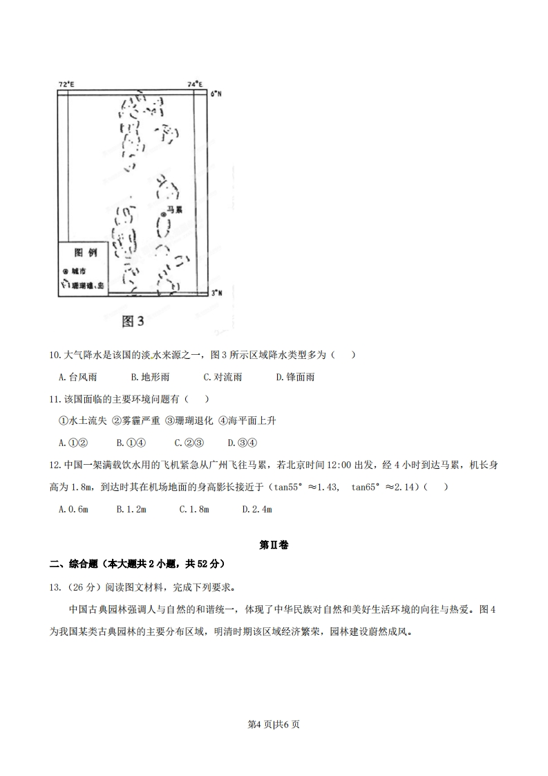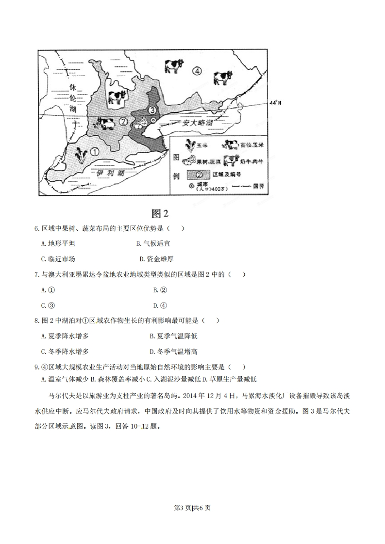 2015年普通高等学校招生全国统一考试(重庆卷)文科综合地理注意事项:1.本试卷分第I卷(选择题)和第Ⅱ卷(非选择题)两部分。答题前,考生务必在将自己的姓名、考生号填写在答题卡上。2。回答第I卷时,选出每小愿选出答案后,用铅笔把答愿卡上对应题目的答案标号涂黑,如需改动,用橡皮擦干净后,再选涂其他答案标号。写在试卷上无效。3.回答第Ⅱ卷时,将答案卸载答题卡上,写在试卷上无效。4.考试结束,将本试卷和答题卡一并交回。第I卷一、选择题:本大题共12小题,每小题4分,共48分。在年小题列出的四个选项中,只有一项是符合题目要求的。二十四节气是我国独有的农业物候历,是我国优秀传统文化之一,寒露节气在每年公历10月8日左右。据此回答1-3题。1.“露气寒冷,将凝结”是寒露时节的天气现象,可引起我国这种天气现象的气压系统是()A.蒙古高压B.印度低压C.阿留申低压D.夏威夷高压2.“上午忙麦茬,下午摘棉花”是民间描述寒露时节农事活动的谚语。在下列地区中,该谚语描述的农事活动场景最可能出现在()A.珠江三角洲B.柴达木盆地C.藏南谷地D.渭河平原3.地球绕太阳一周为360°,以春分日地球在黄道上的位置为0°,则寒露日地球在黄道上的位置为()A.15°B.10.5°C.195D.285°图1中的曲线示意中国、日本、意大利和法国四个国家的城镇化率变化情况,曲线上的圆点表示各国不同高铁线路开始运营的年份。读图1,回答4-5题。第1页供6页城镇化率()100908070504030200图14.图1中第一条高铁开始运营时,四个国家中乡村人口比重最小的为()A.20%-30%B.30%-40%C.40%-50%D.60%-70%5.图1中2000-2010年高铁新运营线路最多的国家在此期间()A.工业化程度提高B.人口增长率增大C.逆城市化现象明显D.经济发展水平最高图2是某地区农业分布示意图,读图2回答6-9题。第2页供6页
