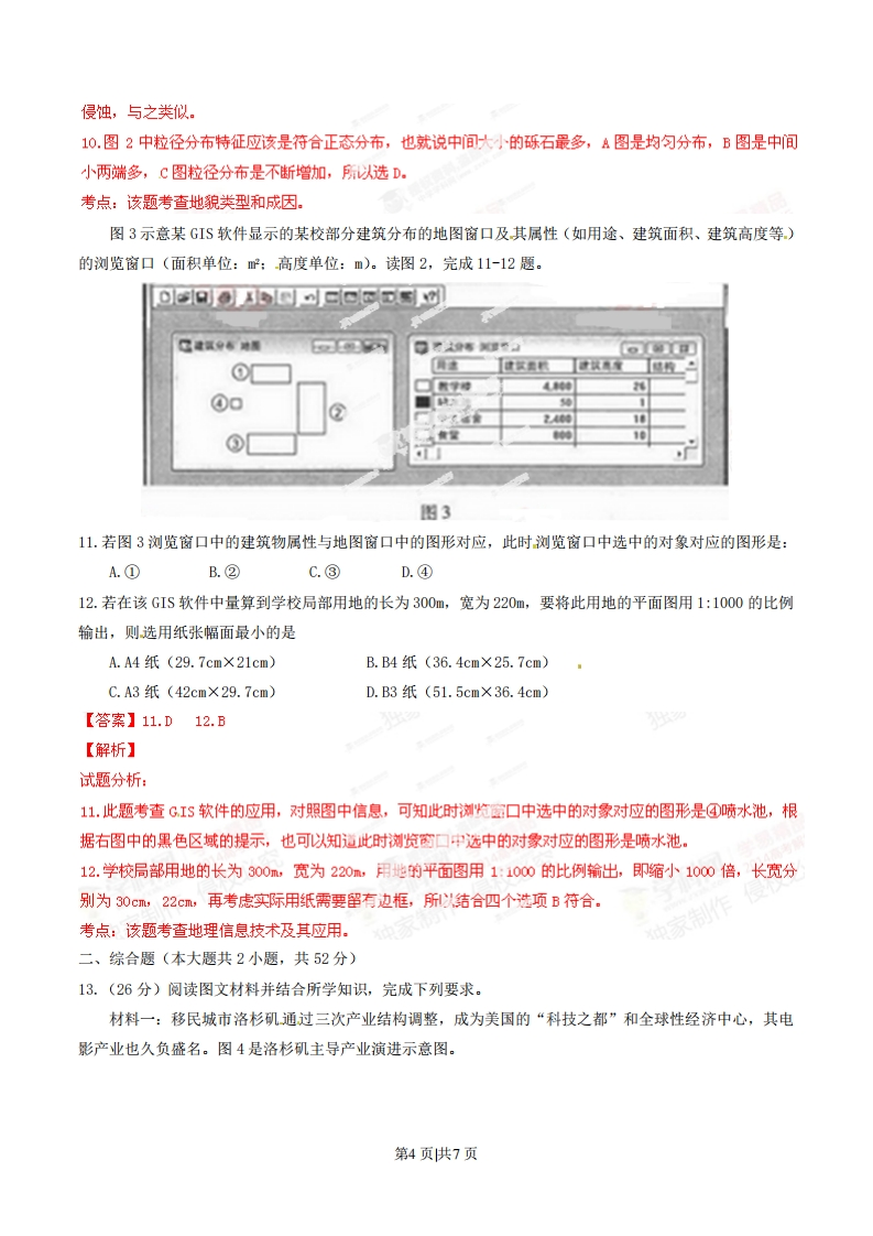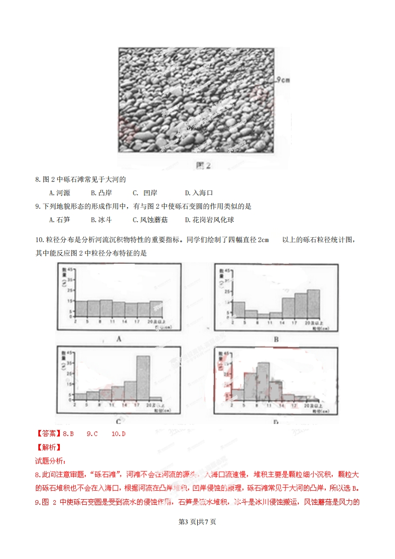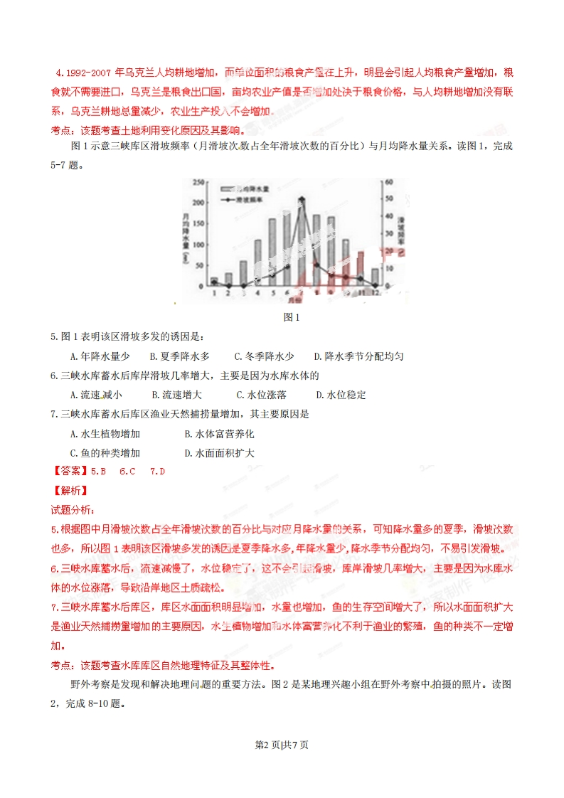 2014年普通高等学校招生全国统一考试(重庆卷)文科综合地理第I卷一、选择题:本大题共12小题,每小题4分,共48分。在每小题列出的四个选项中,只有一项是符合题目要求的。有人把城市楼房超过90m部分的高度之和称为.“城市个头”。2011年香港和重庆“城市个头”在中国排名靠前。据此完成1-2题。1.香港“城市个头”比重庆高,下列原因更合理的是香港A.洪涝灾害更少B.淡水资源更多C.经济水平更高D.土地成本更低2.今年来重庆“城市个头”不断长高,其主要积极影响是A.节约建筑用地B.缓解交通压力C.降低建筑耗能D.扩大用地规模【答案】1.C2.A【解析】独家制作俊试题分析:1.香港“城市个头”比重庆高,说明香苍城市楼病高度超过重庆,楼房高度高反应地价贵,可知香港经济水平更高,而不是土地成本更低,楼房高,诚市内涝可能更多,而不是洪涝灾害更少,香港淡水资源没有重庆丰富,香港淡水主要来源内地。2.近年来重庆“城市个头”不断长高,说明地价不断上涨,同时也节约土地,节约建筑用地,而不是扩大用地规模,楼房更高,人口更密集,交通压力加大,对降低建筑耗能影响不大。考点:该题考查城市化及其特征。素有“欧洲粮仓”之称的乌克兰在1992-2007年期间耕地总量减少2.78%,但人均耕地增加8.32%。据此完成3-4题。3.1992-2007年乌克兰耕地的变化标明这一时期该国A.人口数量减少B.城市化率提高C.土壤质量下降D.粮食单产提高4.1992-2007年乌克兰人均耕地增加最可能起该国A.人均粮食产量增加B.农业生产投入增加C.粮食进口总量增加D.亩均农业产值增加【答案】3.A4.A【解析】试题分析:3.乌克兰在1992-2007年期间耕地总量少2.78%,但人均耕地增加8.32%,则说明该国人口总数在下降,且超过耕地面积的下降速度,与城市化率没有心然联系,土垓贡量是否下降也不能确定,粮食单产提高与耕地变化无关。第1页供7页4.1992-2007年乌克兰人均耕地增加,而单位面和的粮食产至在上升,明显会引1起人均粮食产量增加,粮食就不需要进口,乌克兰是粮食出口国,亩均农业产值是否增加处决于粮食价格,与人均耕地增加没有联系,乌克兰耕地总量减少,农业生产投入不会增加考点:该题考查土地利用变化原因及其影响.图1示意三峡库区滑坡频率(月滑坡次数占全年滑坡次数的百分比)与月均降水量关系。读图1,完成5-7题。2010三,梅海水里200卡一费横事15016图15.图1表明该区滑坡多发的诱因是:A.年降水量少B.夏季降水多C.冬季降水少D.降水季节分配均匀6.三峡水库蓄水后库岸滑坡几率增大,主要是因为水库水体的A.流速减小B.流速增大C.水位涨落D.水位稳定7.三峡水库蓄水后库区渔业天然捕捞量增加,其主要原因是A.水生植物增加B.水体富营养化C.鱼的种类增加D.水面面积扩大【答案】5.B6.C7.D【解析】试题分析:5.根据图中月滑坡次数占全年滑坡次数的百分比与对应月降水量的关系,可知降水量多的夏季,滑坡次数也多,所以图1表明该区滑坡多发的诱是夏季降水多,年降水量少,降水季节分配均匀,不易引发滑坡。6.三峡水库蓄水后,流速减慢了,水位稳定了,这不会引起香玻,库岸滑坡几率增大,主要是因为水库水体的水位涨落,导致沿岸地区土质疏松.?,三峡水库蓄水后库区,库区水面面积明显培加,水量也增加,鱼的生存空间增大了,所以水面面积扩大是渔业天然捕捞量增加的主要原因,水生物增加和水体富营养化不利于渔业的繁殖,鱼的种类不一定增加。考点:该题考查水库库区自然地理特征及其整体性。野外考察是发现和解决地理问题的重要方法。图2是某地理兴趣小组在野外考察中拍摄的照片。读图2,完成8-10题。第2页供7页