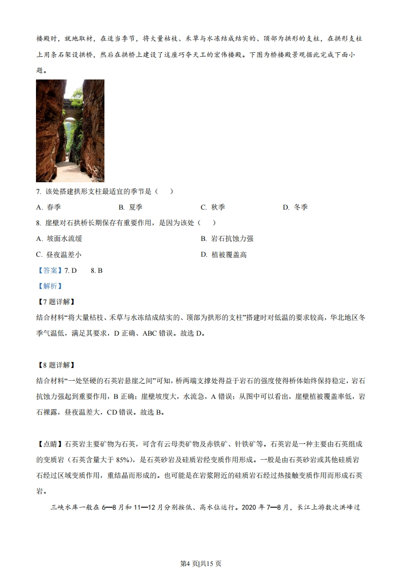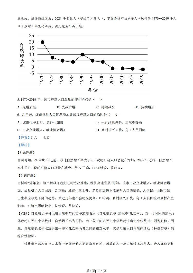 2022年普通高中学业水平选择性考试(重庆卷)地理本试卷分第I卷(选择题)和第Ⅱ卷(非选择题)两部分。满分100分,考试时间75分钟。第I卷(选择题共45分)一、单项选择题:本题共15小题,每小题3分,共45分。在每小题给出的四个选项中,只有一项是符合题目要求的。湖北省淡水养殖业发达。每年冬季鄂东地区民间都排干养殖池塘,挖去淤泥,让塘底接受充分的晾晒,俗称晒塘。通过晒塘可以消毒杀菌,改善水质,提高池塘养殖能力。据此完成下面小题。1.当地采取晒塘措施的目的在于()A.增加饵料B.降低劳动成本C.提高产量D.缩短养殖周期2.当地选择在冬季晒塘的有利气候条件是()A.降水少B.蒸发强C.湿度小D.光照强【答案】1.C2.A【解析】【1题详解】自然环境的地域差异性根据材料可知,晒塘能够消毒杀菌,改善水质,提高池塘养殖能力,即其主要目的在于提高产量,实现增产增收,C正确:晒塘不会增加饵料,A错误:晒塘过程中需要劳动力参与,增加了劳动成本,B错误:晒塘不会缩短水产的养殖周期,D错误。故选C。【2题详解】农业自然区位因素分析根据材料和所学知识可知,晒塘需要排干池塘,湖北省属于亚热带季风气候,夏秋季降水多,冬春季降水少,晴天多,利于晒塘,A正确:冬季气温较低,蒸发较弱,B错误:湖北省水域辽阔,湖沼众多,冬季湿度较大,C错误:该地冬季光照较弱,D错误。故选A。【点睛】湖北省位于亚热带季风气候区,夏季高温多雨,冬季低温少雨。近年来,随着区域一体化和生产分工体系的不断深化,我国某个以特大城市为核心的城市圈内部联系进一步加强。下图示意该城市圈内部的四类联系。据此完成下面小题。第1页共15页城市圈范围地级市范围城市规模等级鱼M级甲☑N级OOL级联系3.M级城市为优化城市空间利用,促进区域协调发展,向N级、L级城市优先转移的产业部门属于()A.园艺业B.制造业C.信息业D.金融业4.对甲类联系加强起主要作用的运输方式是()A.公路运输B.航空运输C.内河航运D.管道运输【答案】3.B4.A【解析】【3题详解】根据题干“M级城市为优化城市空间利用”并结合所学知识可知,城市经济发展过程中,为了促进城市产业结构升级,优先转移出去的应是劳动密集型和资源密集型的产业。制造业多属于劳动密集型产业,B正确:园艺业是农业种植业生产中的一个重要组成部分,对美化、改造人类生存环境有重要意义,城市的发展离不开园艺业,A错误:信息业属于高新技术产业,有利于促进产业结构升级,是M级城市应该大力发展的产业,而不是优先转移出去的产业,C错误:金融业是商业型服务业,属于第三产业,是M级城市提升自身经济水平的重要引擎,不适合转移出去,D错误。故选B。【4题详解】交通运输方式的选择由图可知,甲类联系的城市规模等级较低,城镇化水平较低,交通方式以公路运输为主,A正确:航空运输一般在经济发展水平较高、城市规模较大且距离较远的地区作用更突出,B错误:图上没有反映内河航运的信息,C错误:管道运输主要用于液态及气态能源、资源的运输,不是城市直接加强联系的主要运输方式,D错误。故选A。【点睛】五种交通运输方式的比较:铁路运量大、速度快、连续性好但建设投资大、成本高:公路机动灵活,但运量小:水路运量大、投资少、成本低但速度慢、易受自然条件限制:航空速度最快,但运量小、运价最高:管道线路和运具合二为一,但灵活性差。常住人口指在莱一地区经常居住的人,通常以是否持续居住半年以上为标准。户籍人口指户籍在莱一地区的人。某市位于黄海之滨,南邻长江,常驻人口长期低于户籍人口。近年来,该市积极打造先进制造第2页共15页