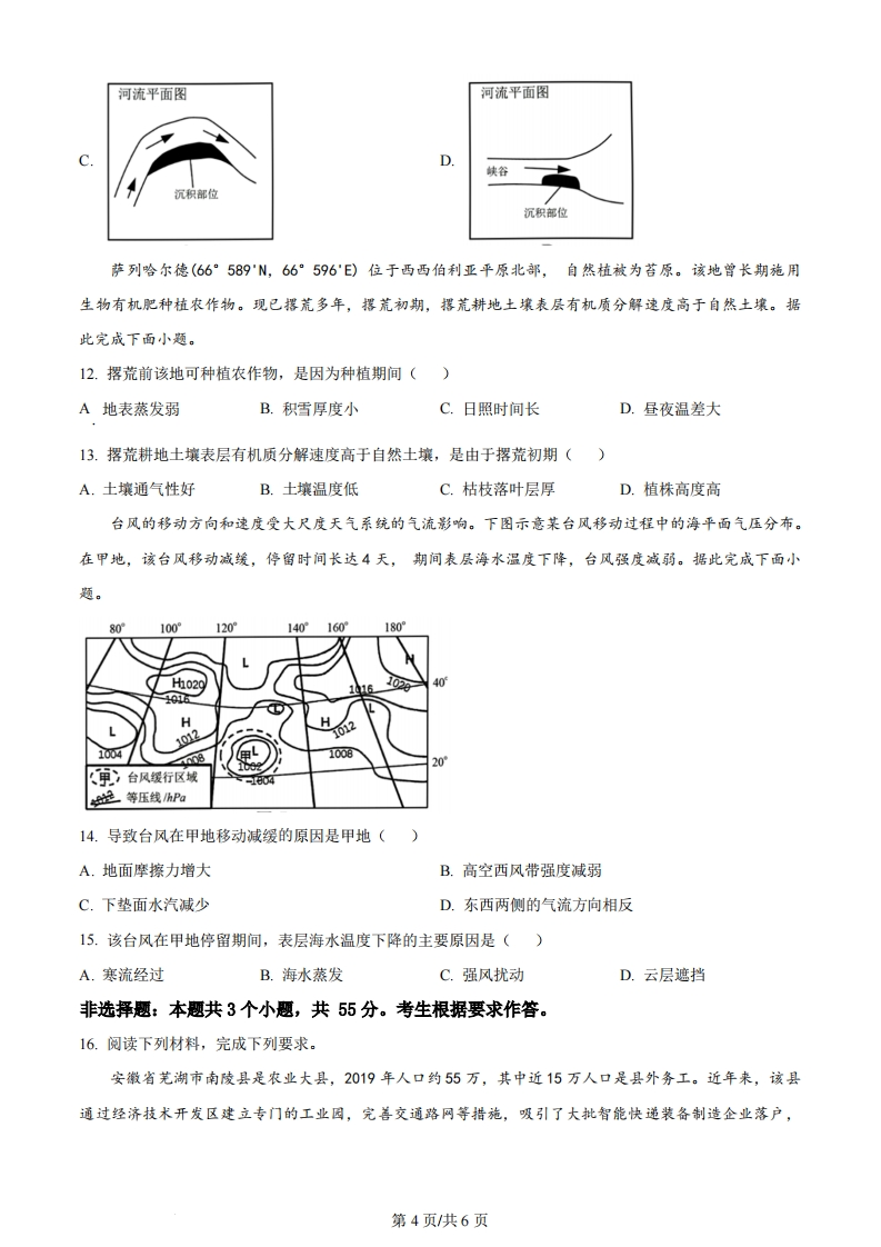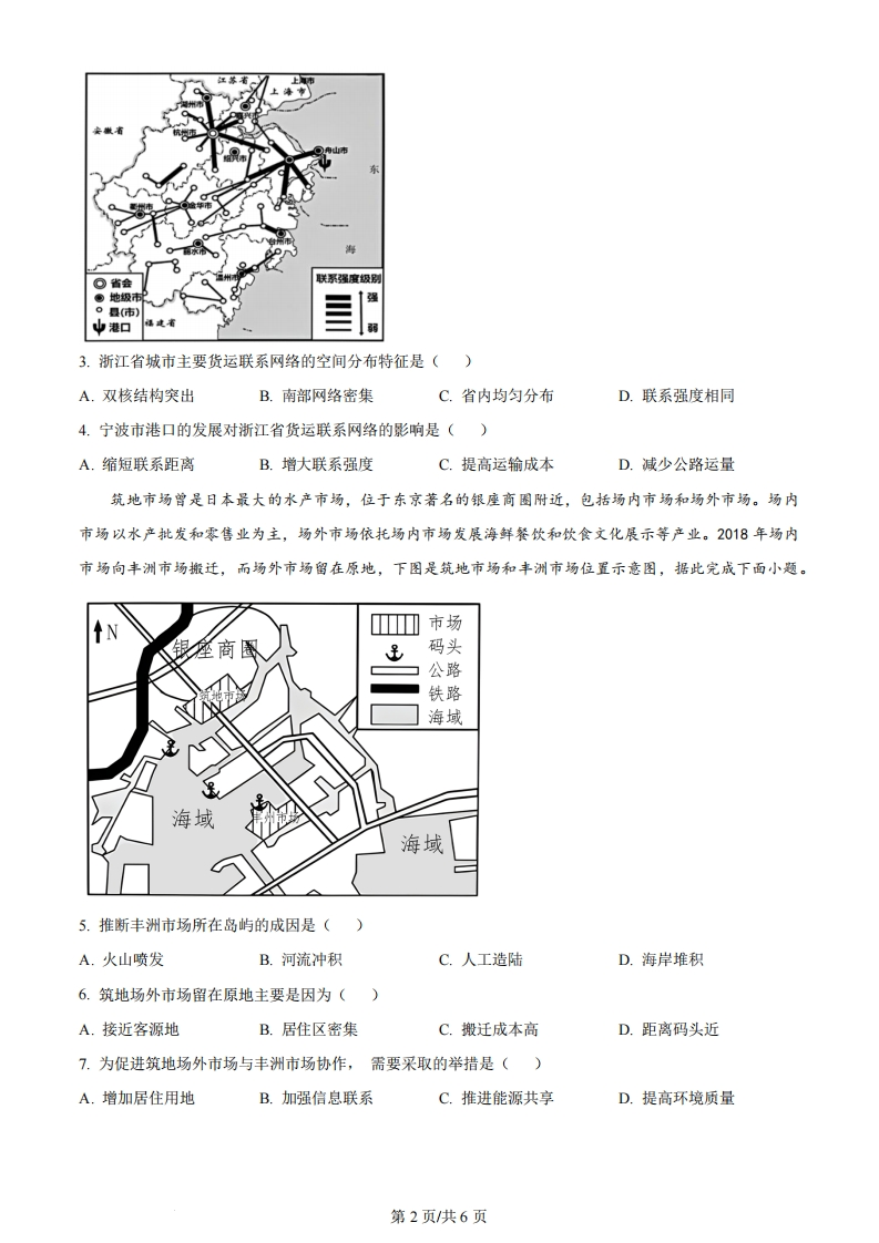重庆市2023年普通高等学校招生统一考试地理本卷满分100分,考试时间75分钟。注意事项:1.答卷前,考生务必将自己的姓名、准考证号等填写在答题卡和试卷指定位置上。2.回答选择题时,选出每小题答案后,用铅笔把答题卡上对应题目的答案标号涂黑。如需改动,用橡皮擦干净后,再选涂其他答案标号。回答非选择题时,将答案写在答题卡上。写在本试卷上无效。3.考试结束后,将本试卷和答题卡一并交回。一、单项选择题:本题共15小题,每小题3分,共45分。在每小题给出的四个选项中,只有一项是符合题目要求的。矿产地的储备是保障国家资源安全的重要举措。我国莱区域将对辖区内铁矿陆续关停,剩余铁矿资源以矿产地形式进行储备。有专家建议,如有必要,将来可在该区域中选择甲地作为可开采区。下图示意该区域铁矿资源分布状况。据此完成下面小题水库矿区范围铁矿储备地○去河流、水库1.该区域将剩余铁矿资源转化为矿产地储备对资源安全的作用是()A.提高资源品位B.增加资源数量C.开发替代资源D.保障稳定供给2.甲地作为建议可开采区的优势条件是()A.矿区面积大B.位于水库下游C.河流汇集多D.水资源承载力大城市间相互作用通过客货流、信息流等联系实现。城市的货运联系网络可表征区域内城市之间的货运联系强度,下图是浙江省城市主要货运联系网络图。据此完成下面小题。第1页共6页⊙省会联系强度级强业港口弱3.浙江省城市主要货运联系网络的空间分布特征是()A.双核结构突出B.南部网络密集C.省内均匀分布D.联系强度相同4.宁波市港口的发展对浙江省货运联系网络的影响是()A.缩短联系距离B.增大联系强度C.提高运输成本D.减少公路运量筑地市场曾是日本最大的水产市场,位于东京著名的银座商圈附近,包括场内市场和场外市场。场内市场以水产批发和零售业为主,场外市场依托场内市场发展海鲜餐饮和饮食文化展示等产业。2018年场内市场向丰洲市场搬迁,而场外市场留在原地,下图是筑地市场和丰洲市场位置示意图,据此完成下面小题。市场座商码头公路铁路海域海域海域5.推断丰洲市场所在岛屿的成因是(A.火山喷发B.河流冲积C.人工造陆D.海岸堆积6.筑地场外市场留在原地主要是因为()A.接近客源地B.居住区密集C.搬迁成本高D.距离码头近7.为促进筑地场外市场与丰洲市场协作,需要采取的举措是()A.增加居住用地B.加强信息联系C.推进能源共享D.提高环境质量第2页/共6页