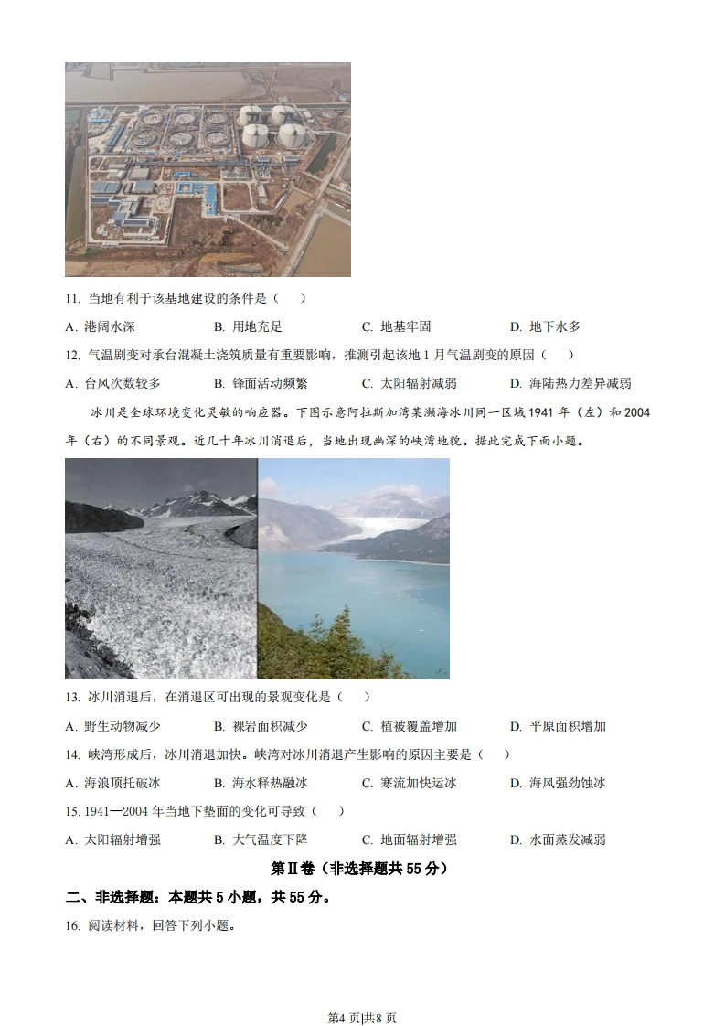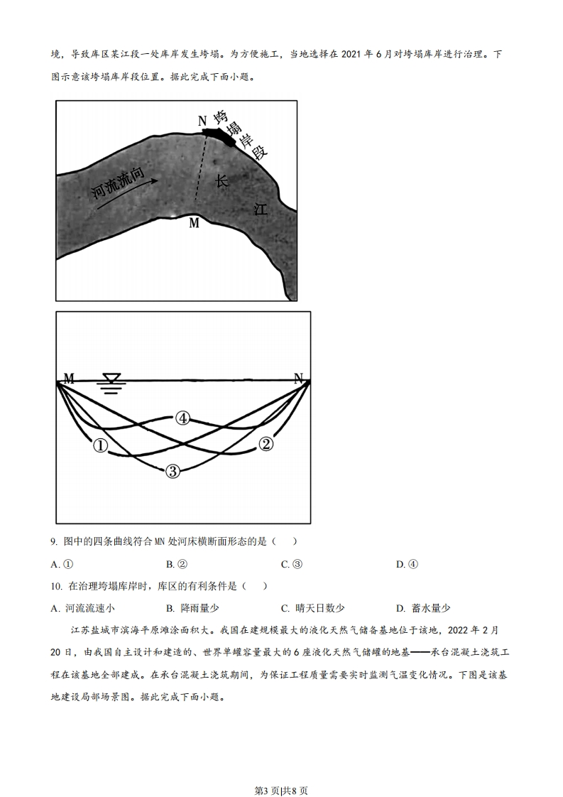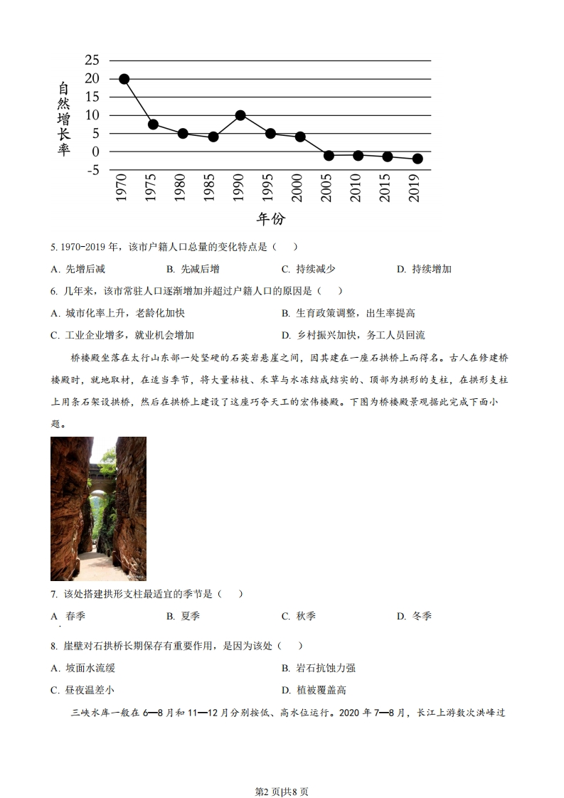 2022年普通高中学业水平选择性考试(重庆卷)地理本试卷分第I卷(选择题)和第Ⅱ卷(非选择题)两部分。满分100分,考试时间75分钟第I卷(选择题共45分)一、单项选择题:本题共15小题,每小题3分,共45分。在每小题给出的四个选项中,只有一项是符合题目要求的。湖北省淡水养殖业发达。每年冬季鄂东地区民间都排干养殖池塘,挖去淤泥,让塘底接受充分的晾晒,俗称晒塘。通过晒塘可以消毒杀菌,改善水质,提高池塘养殖能力。据此完成下面小题。1.当地采取晒塘措施的目的在于()A.增加饵料B.降低劳动成本C.提高产量D.缩短养殖周期2.当地选择在冬季晒塘的有利气候条件是()A.降水少B.蒸发强C.湿度小D.光照强近年来,随着区域一体化和生产分工体系的不断深化,我国某个以特大城市为核心的城市圈内部联系进一步加强。下图示意该城市圈内部的四类联系。据此完成下面小题。城市圈范围地级市范围城市规模等级⊕M级☑N级○OOL级《→联系3.M级城市为优化城市空间利用,促进区域协调发展,向N级、L级城市优先转移的产业部门属于()A.园艺业B.制造业C.信息业D.金融业4.对甲类联系加强起主要作用的运输方式是()A.公路运输B.航空运输C.内河航运D.管道运输常住人口指在某一地区经常居住的人,通常以是否持续居住半年以上为标准。户籍人口指户籍在某一地区的人。某市位于黄海之滨,南邻长江,常驻人口长期低于户籍人口。近年来,该市积极打造先进制造业基地,经济高速发展。2021年常驻人口超过了户籍人口。下图为该市按户籍人口统计的1970-2019年人口自然增长率变化曲线。据此完成下面小题。第1页供8页25然增01510长率505年份5.1970-2019年,该市户籍人口总量的变化特点是()A.先增后减B.先减后增C.持续减少D.持续增加6.几年来,该市常驻人口逐渐增加并超过户籍人口的原因是()A.城市化率上升,老龄化加快B.生育政策调整,出生率提高C.工业企业增多,就业机会增加D.乡村振兴加快,务工人员回流桥楼殿坐落在太行山东部一处坚硬的石英岩悬崖之间,因其建在一座石拱桥上而得名。古人在修建桥楼殿时,就地取材,在适当季节,将大量枯枝、禾草与水冻结成结实的、顶部为拱形的支柱,在拱形支柱上用条石架设拱桥,然后在拱桥上建设了这座巧夺天工的宏伟楼殿。下图为桥楼殿景观据此完成下面小题。7.该处搭建拱形支柱最适宜的季节是()A春季B.夏季C.秋季D.冬季8.崖壁对石拱桥长期保存有重要作用,是因为该处()A.坡面水流缓B.岩石抗蚀力强C.昼夜温差小D.植被覆盖高三峡水库一般在6—8月和11一12月分别按低、高水位运行。2020年7—8月,长江上游数次洪峰过第2页供8页