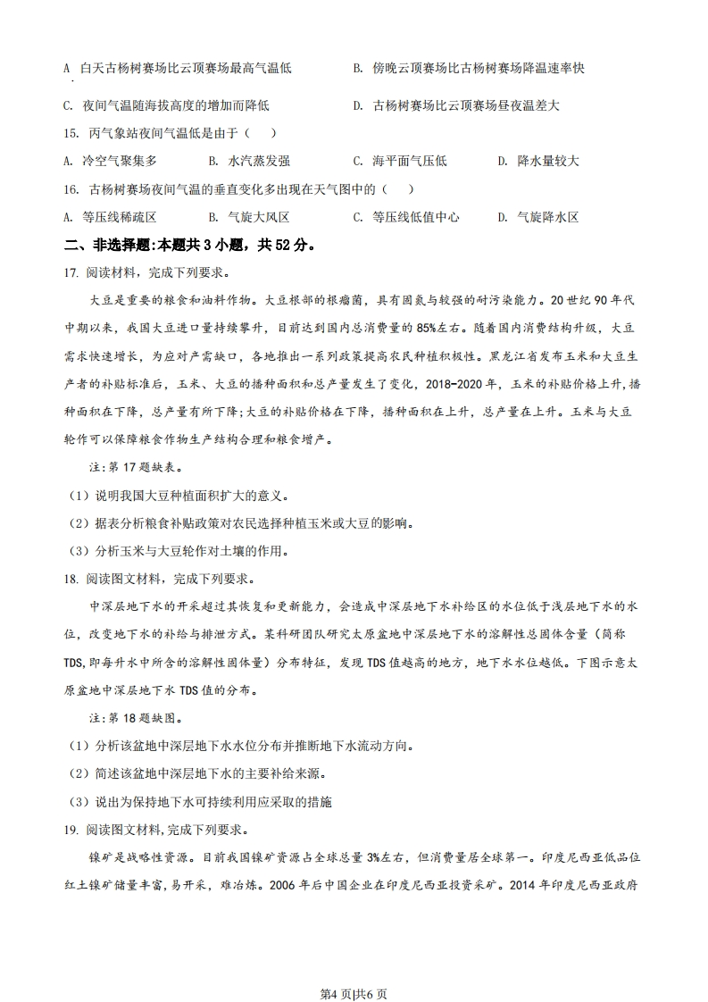 2022年辽宁省普通高等学校招生选择性考试地理本试卷满分100分,考试时间75分钟。一、选择题:本题共16小题,每小题3分,共48分。在每小题给出的四个选项中,只有一项是符合题目要求的。云南哀牢山东麓盛产的柑橘汁水饱满,但常温下不易保存,且柑橘的种植户分散,面临从田间地头到冷链系统的“最先一公里”困境。2020年某企业在该地建立产地仓(数字农业集运加工中心)解决这一问题。下图为农产品冷链物流流程示意图。据此完成下面小题。“最先一公里”移动制冷设备冷链系统田间地头+产地仓销地仓+消费者厂种植「清洗预冷L采摘」L分级包装1.产地仓能够解决“最先一公里”问题是因为()A.使农产品更接近消费市场B.延长柑橘生产的产业链C.充分利用劳动力资源优势D.提供快捷仓储保鲜物流2.产地仓建立对当地柑橘产业的积极影响是()A.快速提高农产品产量B.促进农产品标准化C.降低农产品生产成本D.推广制冷技术应用一般情况下,气侯寒冷期冰川范围扩大,海平面下降。在风力搬运作用下,我国北方某海岸在末次冰期中的相对寒冷期沉积了砂质沉积物,相对温暖期沉积了黄土状沉积物。下图为沉积剖面及其所在位置示意图。据此完成下面小题。·剖面位置西砂质沉积物四黄土状沉积物☐海洋回陆地040km第1页供6页3.推断剖面A→B→C层形成过程中海平面大致经历了()A.持续上升B.持续下降C.先降后升D.先升后降4.砂质沉积物的来源主要是末次冰期的()A.海岸沙B.河流沙C.洪积物D.冰碛物下梅村位于武夷山东、梅溪下游,四周群山环抱。村落始建于隋朝,清朝时成为闽北地区茶叶的集散地与通往欧洞的“万里茶道”的起点。当溪横穿村落汇入梅溪,历史上经过数次改造。下表为宋、明时期当溪的改造内容。下图示意目前该村落布局。据此完成下面小题。朝代改造内容宋朝疏河床、垒岸坡明朝加深拓宽河床修建提水、蓄水工程注:暂缺图。5.宋朝、明朝当溪改造的目的分别为()A.供水:防洪和水运B.供水:水运和养殖C.防洪:防洪和灌溉D.防洪:养殖和供水6.图中茶店在村落中分布的主要影响因素是()A.交通B.茶园C.客流D.地价我国某段峡谷谷底自然生长大量仙人掌,山坡上是稀疏的灌丛,山顶有森林分布。小华同学暑期沿该段峡谷进行地理研学,途经“大流砂”。“大流砂”宽约300米、高约900米,坡面有大量碎石,由上至下呈发散状分布直至坡底。此处时常发生地质灾害。下图示意“大流砂”位置。据此完成下面小题。注:暂缺图。7.该段峡谷夏季气候特征为()A.湿热B.冷湿C.干冷D.千热8.“大流砂”的碎石主要来源于()A.河流堆积B.冰川侵蚀C.基岩风化D.风力搬运9.为减轻该处地质灾害影响,最适宜的措施是在“大流砂”所在地()A.坡面植树造林B.两侧设排水渠C.坡底修建挡墙D.坡顶平整土地张家口地区的东南部为山间盆地,地势相对平坦,水资源丰富。该地区利用充沛的风能、太阳能资源,建设了绿氢生产基地。下图为氢能产业链示意图。据此完成下面小题。第2页供6页