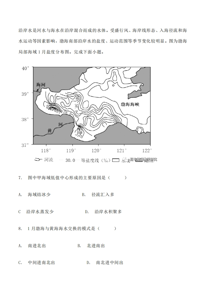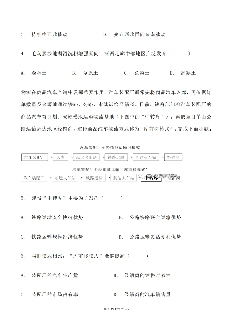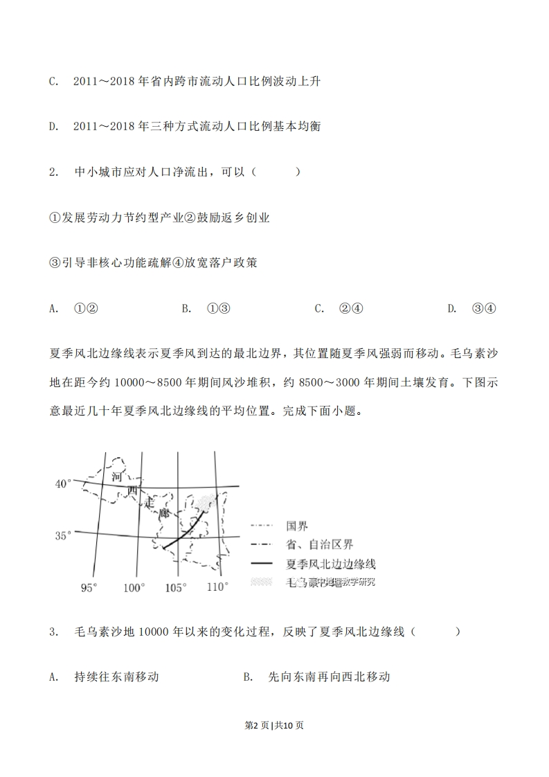 2023年辽宁省普通高中学业水平选择性考试地理一、选释题I(本大题共16小题,每小题3分,共48分。每小题列出的四个备选项中只有一个是符合题目要求的,不选、多选、错选均不得分)人口流动包括人口流入和人口流出。依据人口流动空间范围,将其划分为跨省、省内跨市和市内跨县三种方式。中小城市是新型城镇化的重要空间载体,对推动城乡融合和乡村振兴起重要作用,但持续的人口流动造成一些中小城市人口净流出。下表为2011~2018年我国中小城市三种方式流动人口比例。完成下面小题。年份20112012201320142015201620172018方式跨省0.390.420.380.360.360.360.36037省内跨市0.29b.270.300.310.300.300.290.28市内跨县0.32b.310.320.330.340.345.350.351.表中数据反映中小城市(A.2011~2014年跨省和省内跨市流动人口比例变化趋势相同B.2015年和2016年三种方式流动人口数量相同第1页|共10页C.2011~2018年省内跨市流动人口比例波动上升D.2011~2018年三种方式流动人口比例基本均衡2.中小城市应对人口净流出,可以(①发展劳动力节约型产业②鼓励返乡创业③引导非核心功能疏解④放宽落户政策A.①②B.①③C.②④D.③④夏季风北边缘线表示夏季风到达的最北边界,其位置随夏季风强弱而移动。毛乌素沙地在距今约10000~8500年期间风沙堆积,约8500~3000年期间土壤发育。下图示意最近几十年夏季风北边缘线的平均位置。完成下面小题。0国界359省、自治区界夏季风北边边缘线95100°105°110毛乌厨种道堪教字研究3.毛乌素沙地10000年以来的变化过程,反映了夏季风北边缘线(A.持续往东南移动B.先向东南再向西北移动第2页1共10页