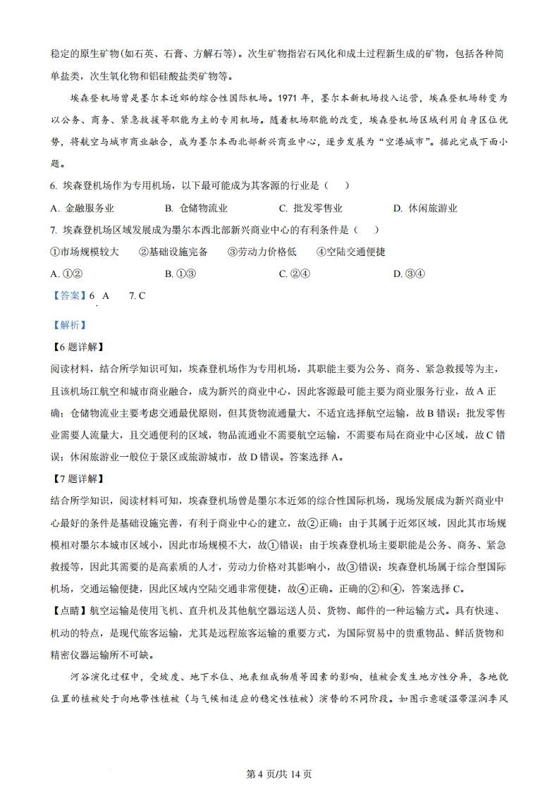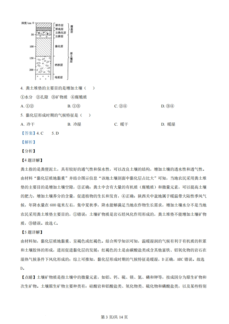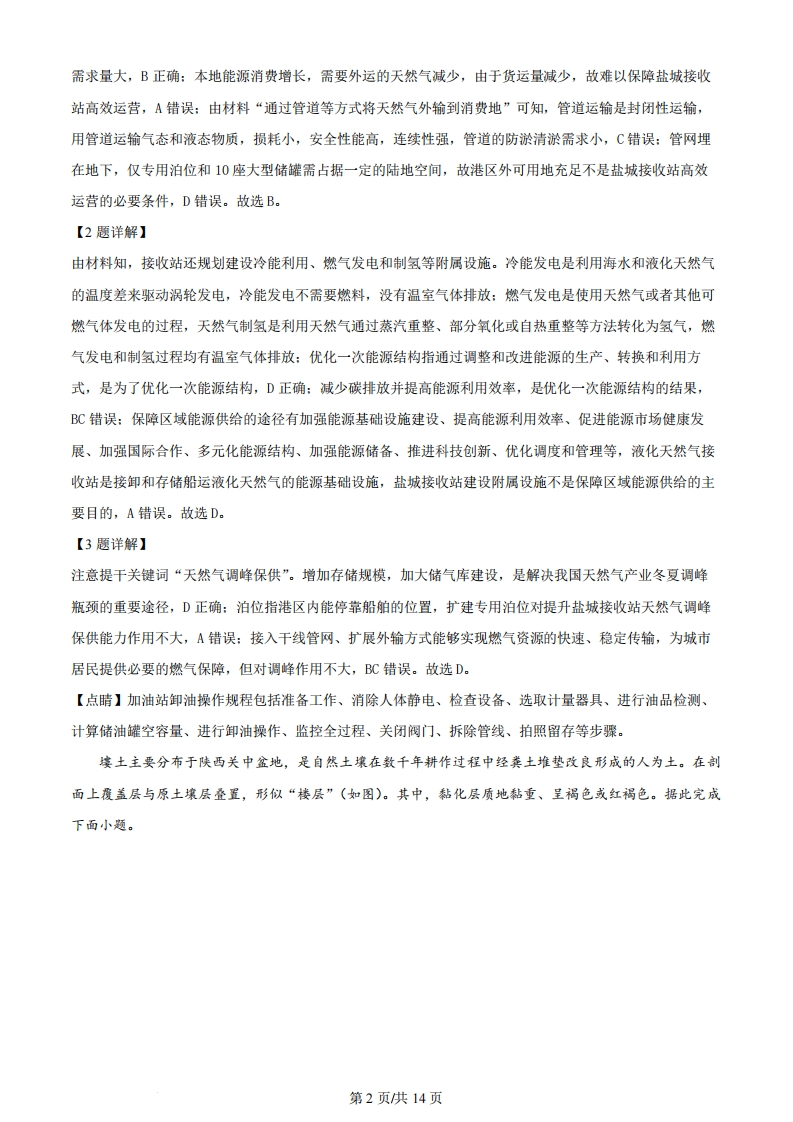 机密★启用前2024年普通高等学校招生选择性考试(辽宁卷)地理本试卷共8页。考试结束后,将本试卷和答题卡一并交回。注意事项:1,答题前,考生先将自己的姓名、准考证号码填写清楚,将条形码准确粘贴在考生信息条形码粘贴区。2.选择题必须使用2B铅笔填涂:非选择题必须使用0.5毫米黑色字迹的签字笔书写,字体工整、笔迹清楚。3。请按照题号顺序在答题卡各题目的答题区域内作答,超出答题区域书写的答案无效:在草稿纸、试卷上答题无效。4.作图可先使用铅笔画出,确定后必须用黑色字迹的签字笔描黑。5。保持卡面清洁,不要折叠,不要弄破、弄皱,不准使用涂改液、修正带、刮纸刀。一、选择题:本题共16小题,每小题3分,共48分。在每小题给出的四个选项中,只有一项是符合题目要求的。液化天然气接收站是接卸和存储船运液化天然气的能源基础设施,通过管道等方式将天然气外输到消费地,具有调峰保供的功能。江苏盐城接收站建在滨海港区内的滩涂上,是全球一次性建成的规模最大接收站,2022年9月开始运营。该站包括专用泊位、管网和10座大型储罐等,占地面积较大。接收站还规划建设冷能利用、燃气发电和制氢等附属设施。据此完成下面小题。1.盐城接收站高效运营的必要条件是()A.本地能源消费增长B.能源消费峰谷差大C.航道防淤清淤保障D.港区外可用地充足2.盐城接收站将建设附属设施是为了()A.保障区域能源供给B.提高能源利用效率C.减少温室气体排放D.优化一次能源结构3.能够提升盐城接收站天然气调峰保供能力的是()A.扩建专用泊位B.接入干线管网C.扩展外输方式D.增加存储规模【答案】1B2.D3.D【解析】【1题详解】由材料“液化天然气接收站是接卸和存储船运液化天然气的能源基础设施,通过管道等方式将天然气外输到消费地,具有调峰保供的功能”可知,盐城接收站高效运营的必要条件是能源消费峰谷差大,调峰保供第1页供14页需求量大,B正确:本地能源消费增长,需要外运的天然气减少,由于货运量减少,故难以保障盐城接收站高效运营,A错误:由材料“通过管道等方式将天然气外输到消费地”可知,管道运输是封闭性运输,用管道运输气态和液态物质,损耗小,安全性能高,连续性强,管道的防淤清淤需求小,C错误:管网埋在地下,仅专用泊位和10座大型储罐需占据一定的陆地空间,故港区外可用地充足不是盐城接收站高效运营的必要条件,D错误。故选B。【2题详解】由材料知,接收站还规划建设冷能利用、燃气发电和制氢等附属设施。冷能发电是利用海水和液化天然气的温度差来驱动涡轮发电,冷能发电不需要燃料,没有温室气体排放:燃气发电是使用天然气或者其他可燃气体发电的过程,天然气制氢是利用天然气通过蒸汽重整、部分氧化或自热重整等方法转化为氢气,燃气发电和制氢过程均有温室气体排放:优化一次能源结构指通过调整和改进能源的生产、转换和利用方式,是为了优化一次能源结构,D正确:减少碳排放并提高能源利用效率,是优化一次能源结构的结果,BC错误:保障区域能源供给的途径有加强能源基础设施建设、提高能源利用效率、促进能源市场健康发展、加强国际合作、多元化能源结构、加强能源储备、推进科技创新、优化调度和管理等,液化天然气接收站是接卸和存储船运液化天然气的能源基础设施,盐城接收站建设附属设施不是保障区域能源供给的主要目的,A错误。故选D。【3题详解】注意提干关键词“天然气调峰保供”。增加存储规模,加大储气库建设,是解决我国天然气产业冬夏调峰瓶颈的重要途径,D正确:泊位指港区内能停靠船帕的位置,扩建专用泊位对提升盐城接收站天然气调峰保供能力作用不大,A错误:接入干线管网、扩展外输方式能够实现燃气资源的快速、稳定传输,为城市居民提供必要的燃气保障,但对调峰作用不大,C错误。故选D。【点睛】加油站卸油操作规程包括准备工作、消除人体静电、检查设备、选取计量器具、进行油品检测、计算储油罐空容量、进行卸油操作、监控全过程、关闭阀门、拆除管线、拍照留存等步骤。接土主要分布于陕西关中盆地,是自然土壤在数千年耕作过程中经粪土堆垫改良形成的人为土。在剖面上覆盖层与原土壤层叠置,形似“楼层”(如图)。其中,黏化层质地黏重、呈褐色或红褐色。据此完成下面小题。第2页供14页