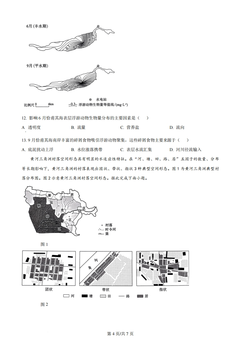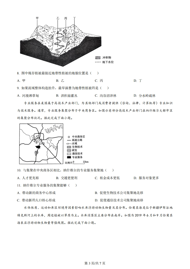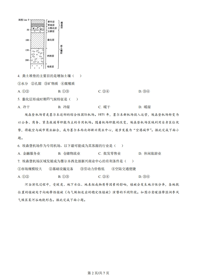 机密★启用前2024年通高等学校招生选择性考试(辽宁卷)地理本试卷共8页。考试结束后,将本试卷和答题卡一并交回。注意事项:1,答题前,考生先将自己的姓名、准考证号码填写清楚,将条形码准确粘贴在考生信息条形码粘贴区。2.选择题必须使用2B铅笔填涂:非选择题必须使用0.5毫米黑色字迹的签字笔书写,字体工整、笔迹清楚。3。请按照题号顺序在答题卡各题目的答题区域内作答,超出答题区域书写的答案无效:在草稿纸、试卷上答题无效。4.作图可先使用铅笔画出,确定后必须用黑色字迹的签字笔描黑。5。保持卡面清洁,不要折叠,不要弄破、弄皱,不准使用涂改液、修正带、刮纸刀。一、选择题:本题共16小题,每小题3分,共48分。在每小题给出的四个选项中,只有一项是符合题目要求的。液化天然气接收站是接卸和存储船运液化天然气的能源基础设施,通过管道等方式将天然气外输到消费地,具有调峰保供的功能。江苏盐城接收站建在滨海港区内的滩涂上,是全球一次性建成的规模最大接收站,2022年9月开始运营。该站包括专用泊位、管网和10座大型储罐等,占地面积较大。接收站还规划建设冷能利用、燃气发电和制氢等附属设施。据此完成下面小题。1.盐城接收站高效运营的必要条件是()A.本地能源消费增长B.能源消费峰谷差大C.航道防淤清淤保障D.港区外可用地充足2.盐城接收站将建设附属设施是为了()A.保障区域能源供给B.提高能源利用效率C.减少温室气体排放D.优化一次能源结构3.能够提升盐城接收站天然气调峰保供能力的是()A.扩建专用泊位B.接入干线管网C.扩展外输方式D.增加存储规模接土主要分布于陕西关中盆地,是自然土壤在数千年耕作过程中经粪土推垫改良形成的人为土。在剖面上覆盖层与原土壤层叠置,形似“楼层”(如图)。其中,黏化层质地黏重、呈褐色或红褐色。据此完成下面小题。第1页/共7页深度/cm0耕作层型底层古熟化层0100黏化层150钙积层200母质层4.粪土堆垫的主要目的是增加土壤()①水分②孔隙③矿物质④腐殖质A.①②B.①③C.②④D.③④5.黏化层形成时期的气候特征是()A.冷干B.冷湿C.暖干D.暖湿埃森登机场曾是墨尔本近郊的综合性国际机场。1971年,墨尔本新机场投入运营,埃森登机场转变为以公务、商务、紧急救援等职能为主的专用机场。随着机场职能的改变,埃森登机场区域利用自身区位优势,将航空与城市商业融合,成为墨尔本西北部新兴商业中心,逐步发展为“空港城市”。据此完成下面小题。6.埃森登机场作为专用机场,以下最可能成为其客源的行业是()A.金融服务业B.仓储物流业C.批发零售业D.休闲旅游业7.埃森登机场区域发展成为墨尔本西北部新兴商业中心的有利条件是()①市场规模较大②基础设施完备③劳动力价格低④空陆交通便捷A.①②B.①③C.②④D.③④河谷演化过程中,受坡度、地下水位、地表组成物质等因素的影响,植被会发生地方性分异,各地貌位置的植被处于向地带性植被(与气候相适应的稳定性植被)演替的不同阶段。如图示意暖温带湿润季风气候区某河谷地貌形态。据此完成下面小题。第2页/共7页