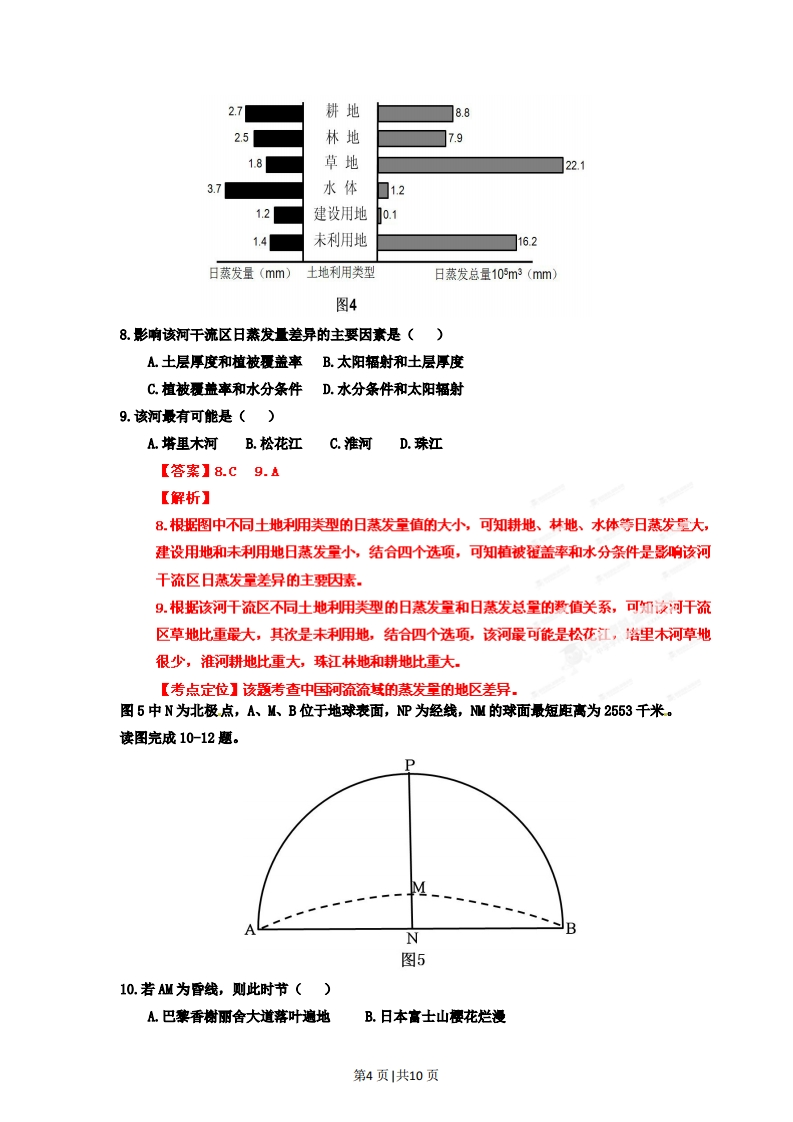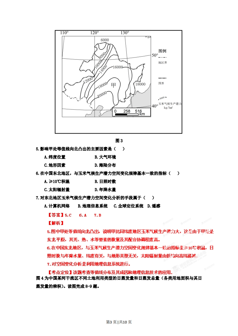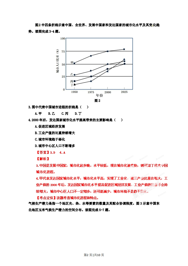 2012年高考福建文综地理试卷解析(教师版)【试卷总评】该套试题考查知识全面,难度适宜,符合新课标地理高考特点和要求,是一套命愿质量很高的试题。选择题,考查学生对地理基本原理的理解和判断能力,通过图表考查学生正确获取地理信息和理解运用的能力,12道选择题中,1-4考查人文地理,后面8道选择题考查自然地理;综合题以热点材料国家“十二五”规划为背景材料来命题,综合考查区域经济发展,重点考查学生对材料阅读理解和综合分析的能力;选做恩部分,难度相对较低,重点考查获取材料中有用地理信息的能力,结合材料和所学知识进行简单知识迁移的能力。共12小题,每小题4分,共48分。在每题给出的四个选项中,只有一项是符合题目要求的。图1示意近8年来中国对美国投资总额分布。读图完成1-2愿。图例设资总额(亿美元)4>152~15圆0~1☐o翻水该图11.中国对美国投资主要分布在()A太平洋及北冰洋沿岸地区B.太平洋沿岸地区C.五大湖及大西洋沿岸地区D.墨西哥湾沿岸地区2.彩响中国企业到美国投资家电制造业的主要因素是()A矿产与技术B.政策与市场C.能源与交通D.土地与劳动力【答案】1.C2.B【解析】1,根据图中中国对美国投资总额分布特点,可知中国对美国投资主要分布在五大湖及大西洋沿岸地区。2.结合四个选项,中国企业到美国投资家电制造业的主要因素是政策与市场,而与矿产、能源、土地没有关系。【考点定位】该题考查中国对美国投资分布规律和工业布局的区位因素。第1页1共10页图2中四条折线示意中国、全世界、发展中国家和发达国家的城市化水平及其变化趋势。读图完成3-4题。10075HAIY60甲。蒙乙◆25丙●01950197520002025年份图23.图中代表中国城市进程的折线是()A甲B.乙C.丙D.丁4.2000年后,发达国家城市化水平提高带来的主要响是()A促进区域经济发展B.工业产值的比重持续增大C.城市环境趋于恶化D.城市中心区人口不断增多【答案】3.D4.A【解析】3.中国是发展中国家,城市化起步晚,水平按低,现在城市化速唐快,则可知丁代表中国城市化进程。4甲代表发达国家城市化水平,城市化水平高,实现了工业化,第三产此重在焰大,工业产值的2000年后,发达国家城市化水平提高促进区域经济发展,工业产值的此重不会持续增大,城市中心区人口不一定增多,还可能减少,城市环境不是趋于恶化:【考点定位】该题考查城市化进程和特点.气候生产潜力是指一个地区光、热、水等要素的数量及其配合协调程度。图3示意中国东北地区玉米气候生产潜力的空间分布。读图完成5-7题。第2页|共10页