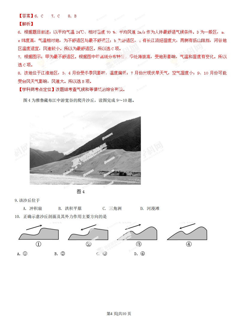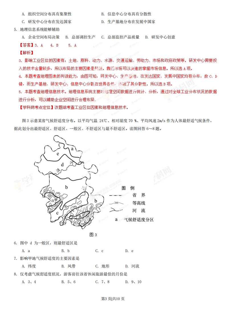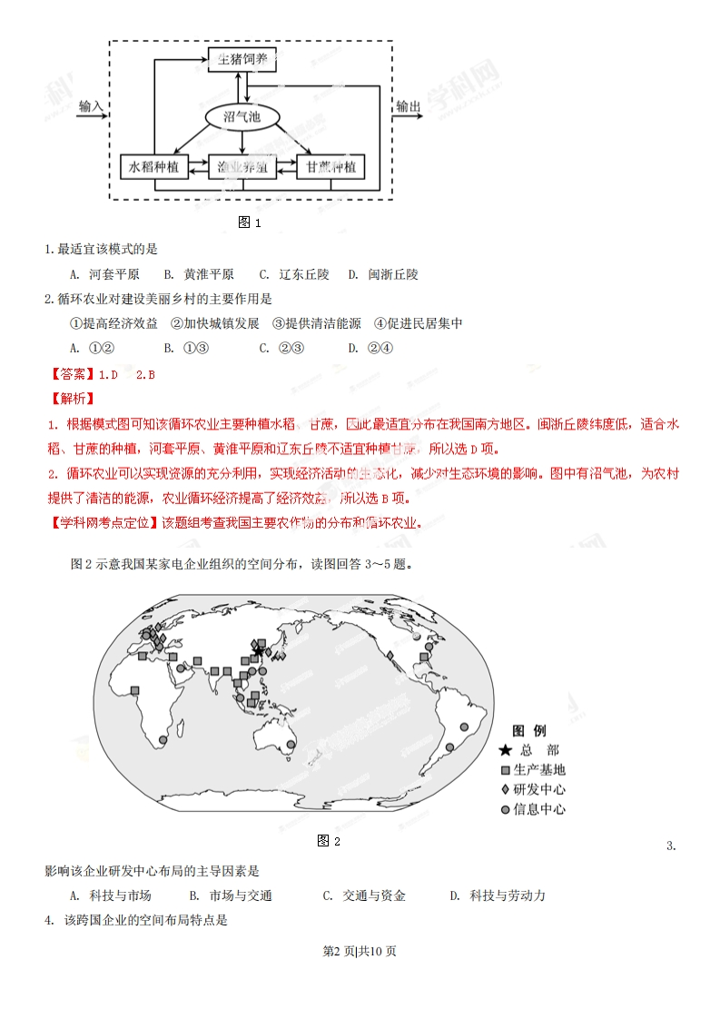 2013年普通高等学校招生全国统一考试(福建卷)文科综合地理【学科网试卷总评】1.突出主干知识,重难点悉数涉及本组高考地理试卷涉及农业、工业、3S技术、等值线、外力作用和地貌、地球运动、气候特征、农业生产自然条件、交通、区位等必修的知识。2.突出地理学科的特点每一组题都是图,涉及关联图、区域图、等值线图、地貌景观图等,新东方的孩子对此并不陌生,因为我们的图形解析的课堂上都讲过,所以此次高考相对是顺溜应对:大题也是意料之中,考到我们七组综合题之特征分析题、区位题、原因分析题等,考生都容易如题,而且气候特征、农业自然条件、经济特区位类原因题都有相应的模板可以作为参照,但再三告知学生一定要结合材料才能尽量地拿满分:选修自然灾害与防治部分我们重点强调低温冷害,分析影响、成因、对策都是高频题,所以灾害基本送分。3.体现地理学科的应用性,贴近生活37题,根据某中学“重走古丝绸之路”夏令营活动搜集的资料,用学生身边的地理来贴近学生的生活,使得地理学科更具生活性,摒弃理论脱离实际。4.体现新课标的自主学习精神地理试题体现了新课程倡导的“自主学习、主动探究、重视学习的过程与方法”的核心理念。引导学生重视开展问题探究等实践活动,让积极开展课改的学校及学生在考试中受益,这也是新课标一直探讨的问题,所以2013年很好地切合活动探究的主题设置了11-12题,福建某中学研究性学习小组设计可调节窗户遮阳板,在落实新课标“开展地理观察、地理考查和地理专题研究等实践活动”方面做了大胆尝试,真的让考生在新课标下学习,真的让新课改的老师和学生在高考中获益。5.体现乡土特点福建地理越来越体现乡士气息,告知考生地理就是米源于生活,生活处处是地理:如1-2题,我们农村地区就有沼气,而且政府还给安装沼气池的农户一定的经济补贴,如3-5题,经济全球化背景下的我国某家电企业组织空间变化,40题(B),我国部分地区冷冻灾害对农业生产的影响等,引导考生关注热点,热爱家乡,学以致。综上所述,综上,我们今年的地理选择题较往年容易,2013福建高考地理依据考试大纲地理高考考核四项基本能力(获取和解读地理信息的能力、调动和运用知识的能力、描述和阐释事物的能力和论证和探究问题的能力),结合2013福建省地理考试说明体现生活性、时代性、自主性,更具有现实的指导意义。第1卷(选择题共48分)本卷共12小题,每小题4分,共48分。在每小题给出的四个选项中,只有一项是最符合题目要求的。循环农业是美丽乡村建设的途径之一。图1示意采循环农业模式,读图回答1一2题。第1共10页生猪饲养耐网输输出沼气池水稻种植渔业养组甘蕊种植图11.最适宜该模式的是A.河套平原B.黄淮平原C.辽东丘陵D.闽浙丘陵2.循环农业对建设美丽乡村的主要作用是①提高经济效益②加快城镇发展③提供清洁能源④促进民居集中A.①②B.①③C.②③D.②④【答案】1.D2.B【解析】1.根据模式图可知该循环农业主要种植水稻、甘蔗,因此最适宜分布在我国南方地区。闽浙丘陵纬度低,适合水稻、甘蔗的种植,河套平原、黄淮平原和辽东丘陵不适宜种檀甘萨,所以选D项。2.循环农业可以实现资源的充分利用,实现经济活动的生化,减少对生态环境的影响。图中有沼气池,为农村提供了清洁的能源,农业循环经济提高了经济效益,以选B项。【学科网考点定位】该题组考查我国主要农作物的分布和循环农业。图2示意我国某家电企业组织的空间分布,读图回答3~5题。图例★总部口生产基地◇研发中心。信息中心图23影响该企业研发中心布局的主导因素是A.科技与市场B.市场与交通C.交通与资金D.科技与劳动力4.该跨国企业的空间布局特点是第2页共10页