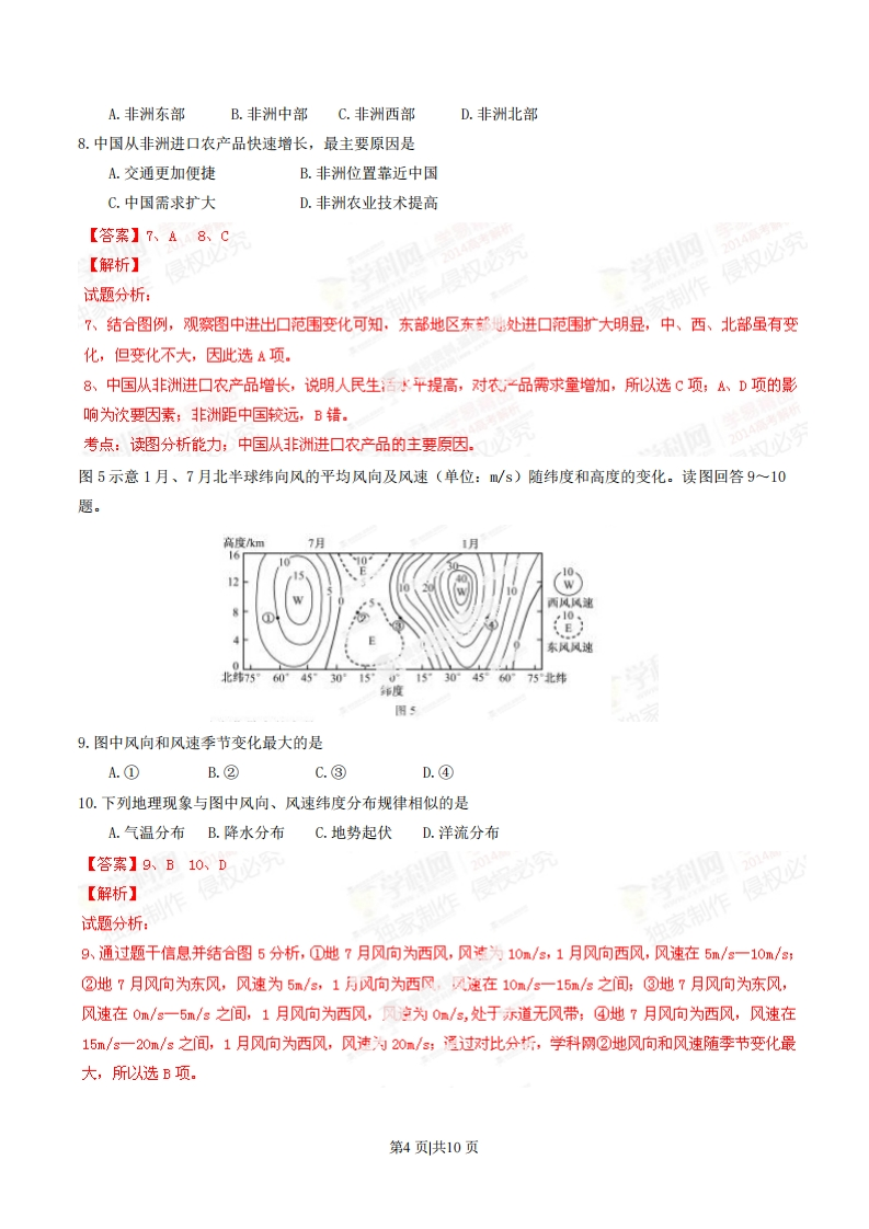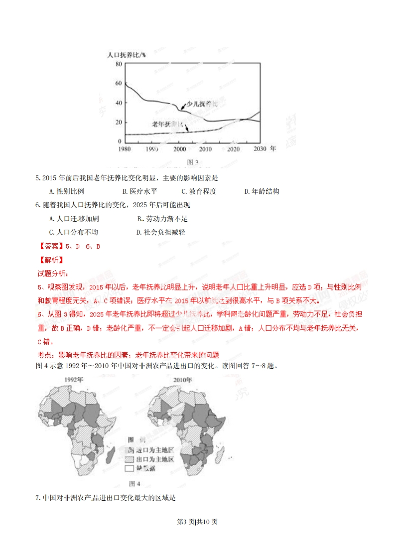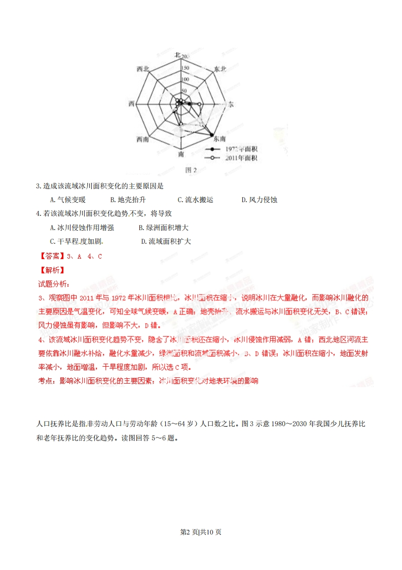 2014年普通高等学校招生全国统一考试(福建卷)文科综合地理本卷共36小题,每小题4分,共144分。在每小题给出的四个选项中,只有一项最符合题目要求的。图I示意新一代信息技术支撑下的智慧城市。读图回答1~2题。3S技术智背织方物联网智慧社区智慧城市了慧交通云计算图1.地理信息系统为智慧城市建设提供A.分析、管理空间信息B.跟踪动态定位信息C.整合集成网络信息D.获取实时通讯信息2.智慧城市建设对城市发展最重要的作用是A.调整地域结构B.加速人口集散C.扩大空间规模D.提升服务功能【答案】1、A2、D【解析】试题分析:1.地理信息系统是指在计算机上完成对信总的分析、处理和管理,依题意,应选A项;能完成跟踪定位和获取实时通讯信息的是全球定位系统(GPS),B和D错:慕成网络信息,属于信息集成技术,与地理信息技术无关,C错。2.通过图1分析,智慧城市包括智慧交通、务、学科网社区等,城市的管理依靠技术的支撑,其重要作用在于提升服务功能,故选D项。考点:地理信息系统的应用:信息技术对城产发展的重要作用图2示意1972~2011年我国西北地区某流域不同朝向冰川的变化(单位:km2)。读图回答3一4题。第1页共10页50东西南东南一◆一1972¥面积a=O-n2011年面积图23.造成该流域冰川面积变化的主要原因是A.气候变暖B.地壳抬升C.流水搬运D.风力侵蚀4.若该流域冰川面积变化趋势不变,将导致A.冰川侵蚀作用增强B.绿洲面积增大C.干旱程度加剧D.流域面积扩大【答案】3、A4、C【解析】试题分析:3、观察图中2011年与19?2年冰川面积相比,冰"五积在缩,说明冰川在大量融化,而影响冰川融化的主要原因是气温变化,可知全球气候变暖,A正确:地壳抬升,流水搬运与冰川面积变化无关,B、℃错误;风力侵蚀虽有影响,但影响不大,D错.4、该流域冰川川面积变化趋势不变,隐含了冰积还在缩小,冰川侵蚀作用减弱,A错;西北地区河流主要依靠冰川融水补给,融化水量减少,绿洲面积和流城面积减小,3、D错误;冰小川川面积在缩小,地面发射率减小,地面增温,干旱程度加剧,所以选C项。考点:影响冰川川面积变化的主要因素;冰面积变化对地表环境的影响人口抚养比是指非劳动人口与劳动年龄(15~64岁)人口数之比。图3示意1980~2030年我国少儿抚养比和老年抚养比的变化趋势。读图回答5一6题。第2页共10页