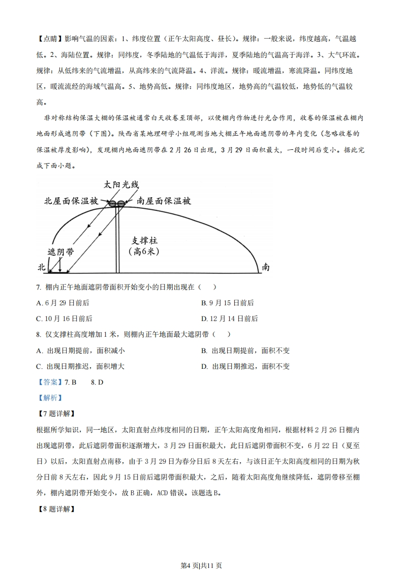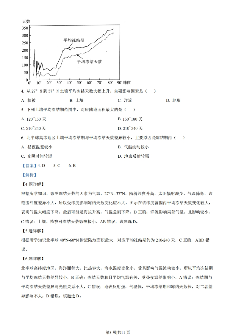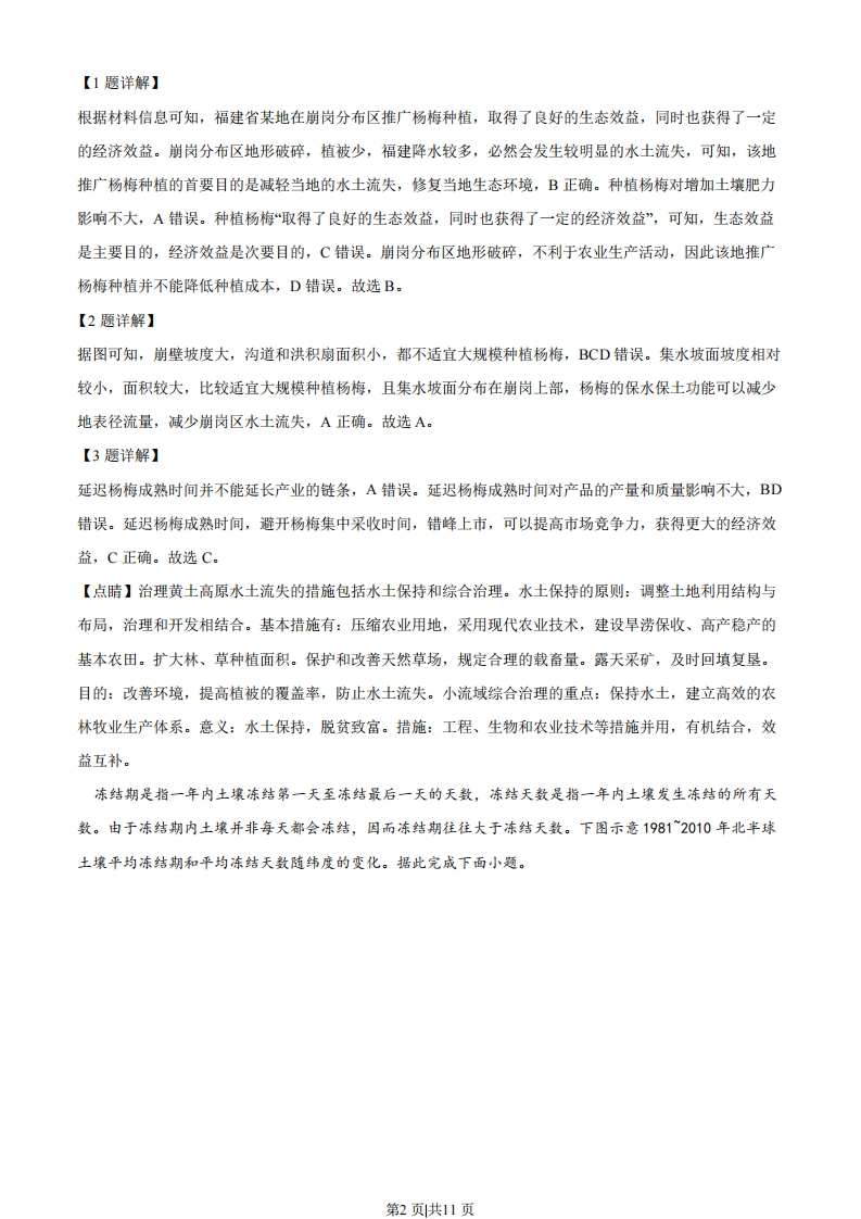 2022年福建省普通高中学业水平选择性考试地理一、选释题:本大题共16小题,每小题3分,共48分。在每小题列出的四个选项中,只有一项是符合题目要求的。崩岗是我国南方山坡岩土体在流水和重力作用下,遭受侵蚀、产生崩搦而形成的地貌,高度从几米到几十米不等。福建省某地在崩岗分布区推广杨梅种植,取得了良好的生态效益,同时也获得了一定的经济效益。杨梅采收时间多集中在6月中下旬,某企业拟在该地采用新栽培技术以延迟杨梅成熟时间。据此完成下面小题。集水坡面不崩壁崩积堆沟道冲积兴的1.该地推广杨梅种植的首要目的是()A.提高土壤肥力B.减轻水土流失C.增加农民收入D.降低种植成本2.以下最适宜大规模种植杨梅的是()A.集水坡面B.崩壁C.沟道D.洪积扇3.该企业延迟杨梅成熟时间主要是为了()A.延长产业的链条B.增加产品的产量C.提高市场竞争力D.提升产品的质量【答案】1B2.A3.C【解析】第1页共11页【1题详解】根据材料信息可知,福建省某地在崩岗分布区推广杨梅种植,取得了良好的生态效益,同时也获得了一定的经济效益。崩岗分布区地形破碎,植被少,福建降水较多,必然会发生较明显的水土流失,可知,该地推广杨梅种植的首要目的是减轻当地的水土流失,修复当地生态环境,B正确。种植杨梅对增加土壤肥力影响不大,A错误。种植杨梅“取得了良好的生态效益,同时也获得了一定的经济效益”,可知,生态效益是主要目的,经济效益是次要目的,C错误。崩岗分布区地形破碎,不利于农业生产活动,因此该地推广杨梅种植并不能降低种植成本,D错误。故选B。【2题详解】据图可知,崩壁坡度大,沟道和洪积扇面积小,都不适宜大规模种植杨梅,BCD错误。集水坡面坡度相对较小,面积较大,比较适宜大规模种植杨梅,且集水坡面分布在崩岗上部,杨梅的保水保土功能可以减少地表径流量,减少崩岗区水土流失,A正确。故选A。【3题详解】延迟杨梅成熟时间并不能延长产业的链条,A错误。延迟杨梅成熟时间对产品的产量和质量影响不大,BD错误。延迟杨梅成熟时间,避开杨梅集中采收时间,错峰上市,可以提高市场竞争力,获得更大的经济效益,C正确。故选C。【点睛】治理黄土高原水土流失的措施包括水土保持和综合治理。水土保持的原则:调整土地利用结构与布局,治理和开发相结合。基本措施有:压缩农业用地,采用现代农业技术,建设旱涝保收、高产稳产的基本农田。扩大林、草种植面积。保护和改善天然草场,规定合理的载畜量。露天采矿,及时回填复垦。目的:改善环境,提高植被的覆盖率,防止水土流失。小流域综合治理的重点:保持水土,建立高效的农林牧业生产体系。意义:水土保持,脱贫致富。措施:工程、生物和农业技术等措施并用,有机结合,效益互补。冻结期是指一年内土壤冻结第一天至冻结最后一天的天数,冻结天数是指一年内土壤发生冻结的所有天数。由于冻结期内土壤并非每天都会冻结,因而冻结期往往大于冻结天数。下图示意1981~2010年北半球土壤平均冻结期和平均冻结天数随纬度的变化。据此完成下面小题。第2页共11页