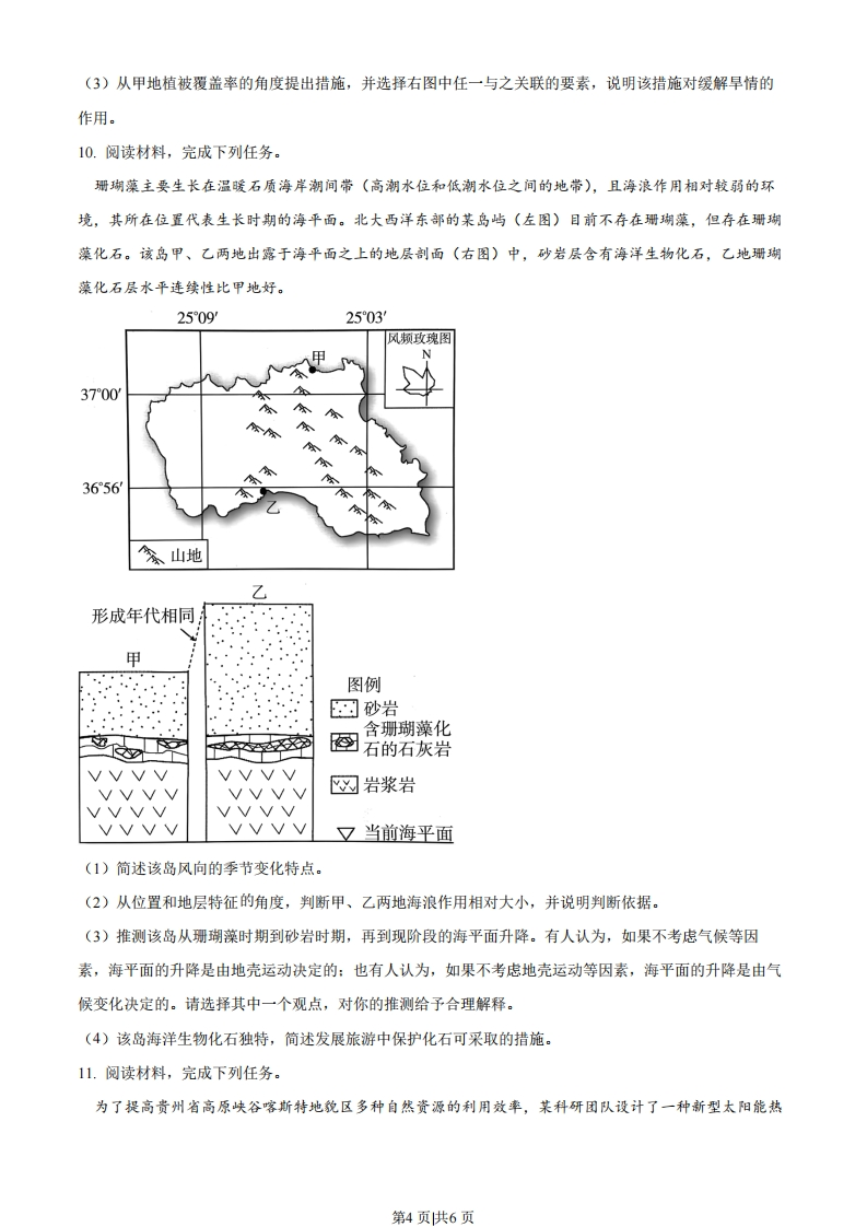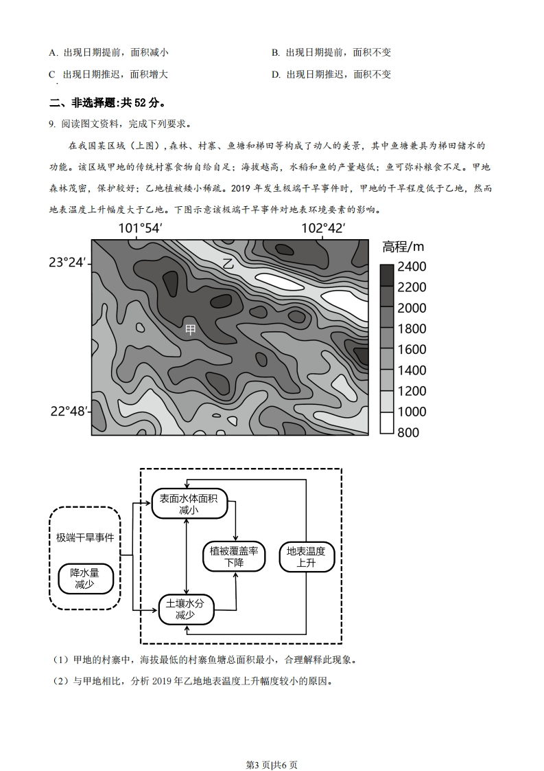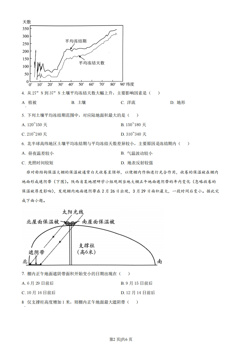 2022年福建省普通高中学业水平选择性考试地理一、选释题:本大题共16小题,每小题3分,共48分。在每小题列出的四个选项中,只有一项是符合题目要求的。崩岗是我国南方山坡岩土体在流水和重力作用下,遭受侵蚀、产生崩搦而形成的地貌,高度从几米到几十米不等。福建省某地在崩岗分布区推广杨梅种植,取得了良好的生态效益,同时也获得了一定的经济效益。杨梅采收时间多集中在6月中下旬,某企业拟在该地采用新栽培技术以延迟杨梅成熟时间。据此完成下面小题。集水坡面不崩壁崩积堆沟道冲积兴的1.该地推广杨梅种植的首要目的是()A.提高土壤肥力B.减轻水土流失C.增加农民收入D.降低种植成本2.以下最适宜大规模种植杨梅的是()A.集水坡面B.崩壁C.沟道D.洪积扇3.该企业延迟杨梅成熟时间主要是为了()A.延长产业的链条B.增加产品的产量C.提高市场竞争力D.提升产品的质量冻结期是指一年内土壤冻结第一天至冻结最后一天的天数,冻结天数是指一年内土壤发生冻结的所有天数。由于冻结期内土壤并非每天都会冻结,因而冻结期往往大于冻结天数。下图示意1981~2010年北半球土壤平均冻结期和平均冻结天数随纬度的变化。据此完成下面小题。第1页供6页天数350300250平均冻结期200150平均冻结天数100500°10°20°3040°50°60°70°80°90纬度4.从27°N到37°N土壤平均冻结天数大幅上升,主要影响因素是()A植被B.土壤C.洋流D.地形5.下列土壤平均冻结期范围中,对应陆地面积最大的是()A.120150天B.150180天C.210240天D.310340天6.北半球高纬地区土壤平均冻结期与平均冻结天数差异较小,主要原因是冻结期内()A.昼夜温差较小B.气温波动较小C.光照时间较短D.地表反射较强非对称结枸保温大棚的保温被通常白天收卷至顶部,以便棚内作物进行光合作用,收卷的保温被在棚内地面形成遮阴带(下图)。陕西省某地理研学小组观测当地大棚正午地面遮阴带的年内变化(忽略收卷的保温被厚度影响),发现棚内地面遮阴带在2月26日出现,3月29日面积最大,一段时间后变小。据此完成下面小题。太阳光线北屋面保温被冷兰南屋面保温被支撑柱遮阴带(高6米)北南7.棚内正午地面遮阴带面积开始变小的日期出现在()A.6月29日前后B.9月15日前后C.10月16日前后D.12月14日前后8仅支撑柱高度增加1米,则棚内正午地面最大遮阴带()第2页供6页