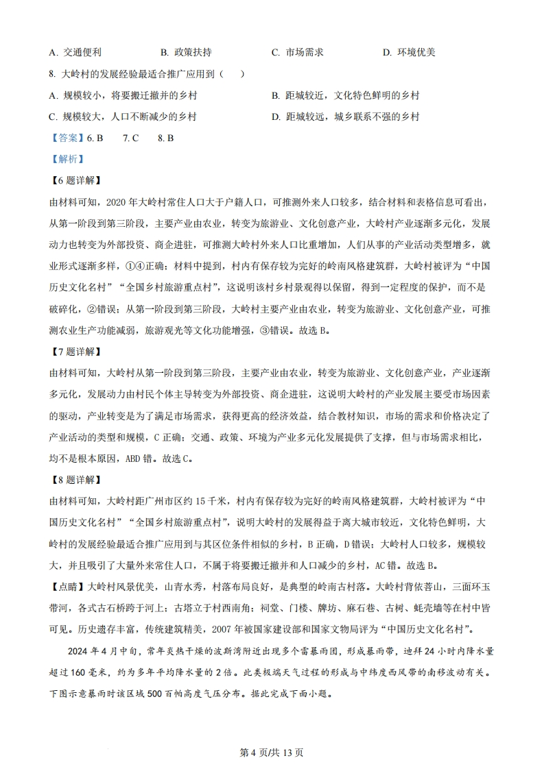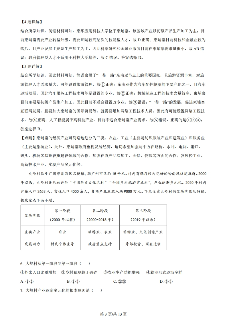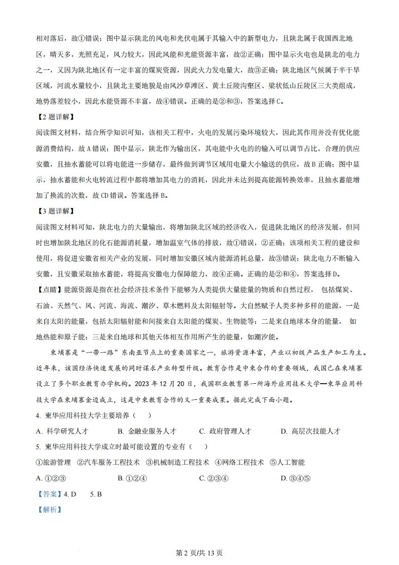 甘肃省2024年普通高中学业水平等级性考试地理注意事项:1.答卷前,考生务必将自己的姓名、准考证号填写在答题卡上。2。回答选择题时,选出每小题答案后,用2B铅笔把答题卡上对应题目的答案标号框涂黑。如需改动,用橡皮擦干净后,再选涂其它答案标号框。回答非选择题时,将答案写在答题卡上。写在本试卷上无效。3。考试结束后,将本试卷和答题卡一并交回。一、选择题:本题共16小题,每小题3分,共48分。在每小题给出的四个选项中,只有一项是符合题目要求的。2024年,陕北一安徽±800千伏特高压直流输电工程(陕电入皖工程)和安徽岳西抽水蓄能电站开工建设。陕电入皖工程是国家构建新型电力系统、建设新型能源体系的重点工程之一,要求电力资源输送中可再生能源电量占比不低于50%。岳西抽水蓄能电站为日调节纯抽水蓄能电站。下图示意陕皖相关工程概况。据此完成下面小题。陕北安敏风电延安市±800千伏消纳光伏电合肥市宝塔山换流站特高压直流合州换流站火电抽水蓄能1.陕北地区在陕电入皖工程中的主要优势有()①电能储存技术发达②风能光能资源充足③煤炭资源储量丰富④水能资源分布集中A.①②B.①③C.②③D.②④2.陕皖相关工程中火电和抽水蓄能的相同作用是()A.优化能源消费结构B.调节电力供应C提高能源转换效率D.减少换流次数3.陕电入皖工程和岳西抽水蓄能电站可(①减少陕北温室气体排放②助力陕北经济社会发展③降低安徽能源消耗总量④提高安徽电力保障能力A.①③B.②③C.①④D.②④【答案】1.C2.B3.D【解析】【1题详解】结合所学知识,阅读图文材料可知,陕北地区位于我国中西部地区,较安徽地区落后,因此电能储存技术第1页供13页相对落后,故①错误:图中显示陕北的风电和光伏电属于其输入中的新型电力,且陕北属于我国西北地区,睛天多,光照充足,风力较大,因此风能和光能资源丰富,故②正确:图中显示火电也是陕北的电力之一,又因为陕北地区有一定丰富的煤炭资源,因此火力发电量大,故③正确:陕北地区气候属于半干旱区域,河流水量较小,且陕北主要地貌是由风沙草滩区、黄土丘陵沟壑区、梁状低山丘陵区三大类组成,地势落差较小,因此水能资源不丰富,故④错误。正确的是②和③,答案选择C。【2题详解】阅读图文材料,结合所学知识可知,该相关工程中,火电的发展污染环境较大,因此其作用并没有优化能源消费结构,故A错误:图中显示,陕北作为输出区,其电能中火电的的输入可以调节占比,合理的供应安徽,且抽水蓄能可以将电能进一步储存,最终做到调节区域用电量大小输送的供应,故B正确:图中显示,抽水蓄能和火电转流过程中都将增加其电力的消耗,因此并未达到提高能源转换效率,且抽水蓄能增加了换流的次数,故CD错误。答案选择B。【3题详解】阅读图文材料可知,陕北电力的大量输出,将增加陕北区域的经济收入,促进陕北地区的经济发展,但同时也增加陕北地区的化石能源消耗量,增加温室气体的排放,故①错误,②正确:该项相关工程的建设和使用,将促进安徽省相关产业的发展,同时增加安徽区域内能源消耗总量,故③错误:陕北电力不断输入安徽,且安徽采取抽水蓄能,将提高安徽电力保障能力,故④正确。正确的是②和④,答案选择D。【点睛】能源资源是指在社会经济技术条件下能够为人类提供大量能量的物质和自然过程,包括煤炭、石油、天然气、风、河流、海流、潮汐、草木燃料及太阳辐射等。大自然赋子人类多种多样的能源,一是来自太阳的能量,包括太阳辐射能和间接来自太阳能的煤炭、生物能等:二是来自地球本身的能量,如地热能和原子能:三是来自地球和其他天体相互作用所产生的能量,如潮汐能。束捕寨是“一带一路”东南亚节点上的重要国家之一,旅游资源丰富,产业以初级产品生产加工为主。近年来,该国经济快速发展的同时谍求产业转型升级。教育合作是中束合作的重要领域,我国已在束埔塞设立了多个职业教育办学机构。2023年12月20日,我国职业教育第一所海外应用技术大学一束华应用科技大学在束埔寨金边成立,这是中束教育合作的又一重要成果。据此完成下面小题。4.柬华应用科技大学主要培养()A.科学研究人才B.金融业服务人才C.政府管理人才D.高层次技能人才5.柬华应用科技大学成立时最可能设置的专业有()①旅游管理②汽车服务工程技术③机械制造工程技术④网络工程技术⑤人工智能A.①②③B.①②④C.②③4④D.③④⑤【答案】4.D5.B【解析】第2页供13页