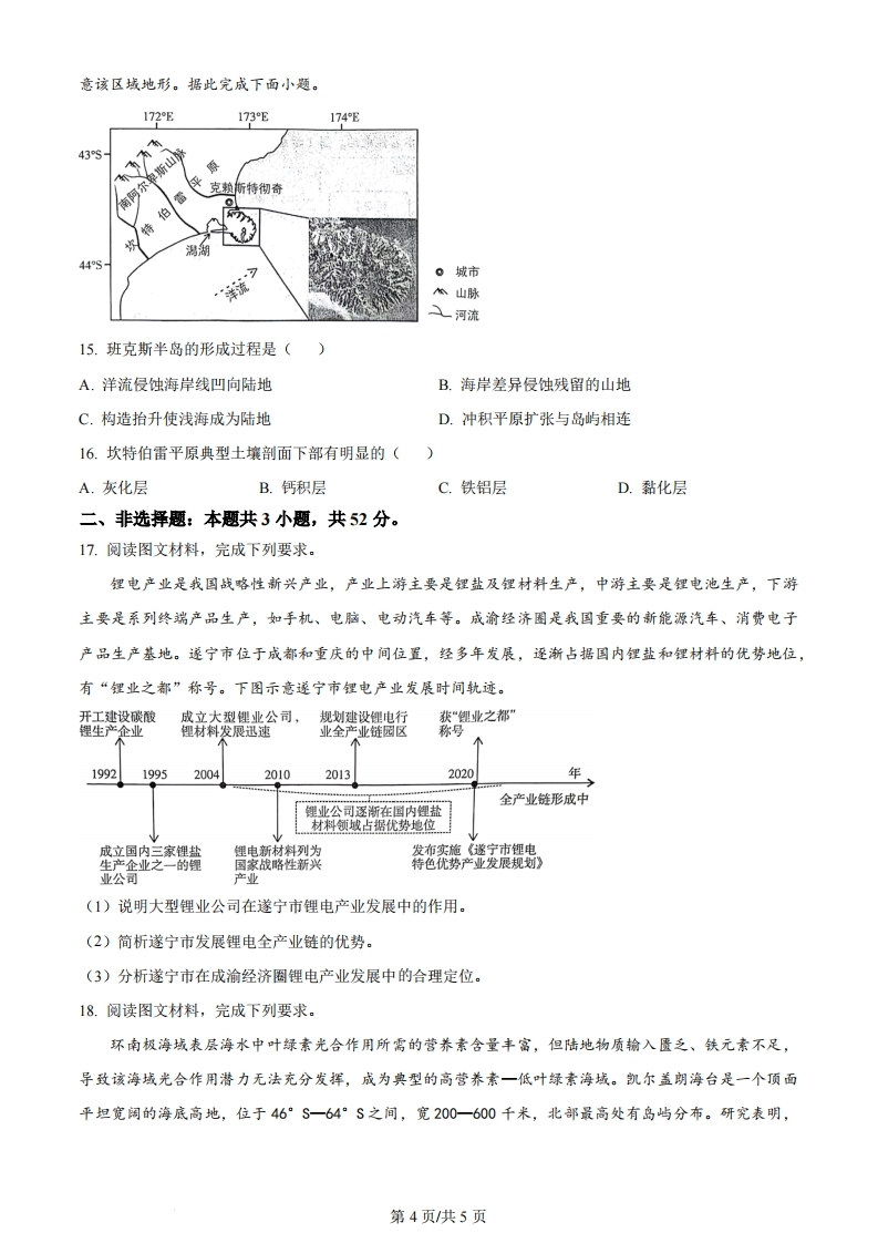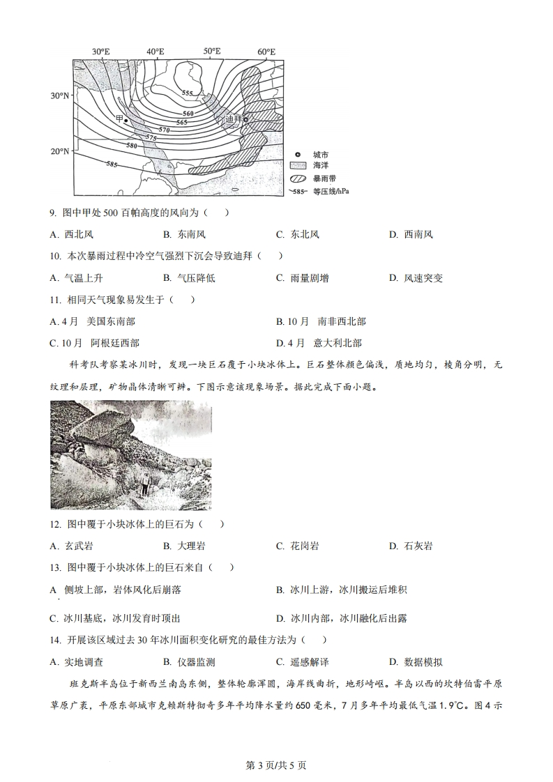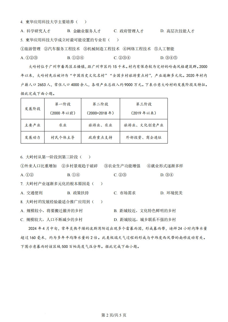 甘肃省2024年普通高中学业水平等级性考试地理注意事项:1.答卷前,考生务必将自己的姓名、准考证号填写在答题卡上。2。回答选择题时,选出每小题答案后,用2B铅笔把答题卡上对应题目的答案标号框涂黑。如需改动,用橡皮擦干净后,再选涂其它答案标号框。回答非选择题时,将答案写在答题卡上。写在本试卷上无效。3。考试结束后,将本试卷和答题卡一并交回。一、选择题:本题共16小题,每小题3分,共48分。在每小题给出的四个选项中,只有一项是符合题目要求的。2024年,陕北一安徽±800千伏特高压直流输电工程(陕电入皖工程)和安徽岳西抽水蓄能电站开工建设。陕电入皖工程是国家构建新型电力系统、建设新型能源体系的重点工程之一,要求电力资源输送中可再生能源电量占比不低于50%。岳西抽水蓄能电站为日调节纯抽水蓄能电站。下图示意陕皖相关工程概况。据此完成下面小题。陕北安敏风电消纳光伏电延安市±800千伏合肥市宝塔山换流站特高压直流合州换流站火电抽水蓄能1.陕北地区在陕电入皖工程中的主要优势有()①电能储存技术发达②风能光能资源充足③煤炭资源储量丰富④水能资源分布集中A.①②B.①③C.②③D.②④2.陕皖相关工程中火电和抽水蓄能的相同作用是()A.优化能源消费结构B.调节电力供应C提高能源转换效率D.减少换流次数3.陕电入皖工程和岳西抽水蓄能电站可(①减少陕北温室气体排放②助力陕北经济社会发展③降低安徽能源消耗总量④提高安徽电力保障能力A.①③B.②③C.①④D.②④束捕寨是“一带一路”东南亚节点上的重要国家之一,旅游资源丰富,产业以初级产品生产加工为主。近年来,该国经济快速发展的同时谍求产业转型升级。教育合作是中束合作的重要领域,我国已在束捕塞设立了多个职业教育办学机构。2023年12月20日,我国职业教育第一所海外应用技术大学一束华应用科技大学在束捕寨金边成立,这是中束教育合作的又一重要成果。据此完成下面小题。第1页/共5页4.柬华应用科技大学主要培养()A.科学研究人才B.金融业服务人才C.政府管理人才D.高层次技能人才5.柬华应用科技大学成立时最可能设置的专业有()①旅游管理②汽车服务工程技术③机械制造工程技术④网络工程技术⑤人工智能A.①②③B.①②④C.②③④D.③④⑤大岭村位于广州市番禺区石楼镇,距广州市区约15千米。村内有保存较为完好的岭南风格建筑群。2000年以来,大岭村先后被评为“中国历史文化名村”“全国乡村旅游重点村”,产业逐渐多元化。2020年村内户籍人口2653人,常住人口4000余人,各项产业总收入约9000万元。下表示意大岭村的发展阶段及特征。据此完成下面小题。第一阶段第二阶段第三阶段发展阶段(2000年以前)(2000-2018年)(2019年以来)主要产业农业旅游业、农业旅游业、文化创意产业发展动力村民个体主导政府重点支持外部投资、商企进驻6.大岭村从第一阶段到第三阶段()①外来人口比重增加②乡村景观趋于破碎③农业生产功能增强④就业形式逐渐多样A.①②B.①④C.②③D.③④7.大岭村产业逐渐多元化的根本原因是()A.交通便利B.政策扶持C.市场需求D.环境优美8.大岭村的发展经验最适合推广应用到(A.规模较小,将要搬迁撤并的乡村B.距城较近,文化特色鲜明的乡村C.规模较大,人口不断减少的乡村D.距城较远,城乡联系不强的乡村2024年4月中旬,常年炎热干燥的波斯湾附近出现多个雷暴雨团,形成暴雨带,迪拜24小时内降水量超过160毫米,约为多年平均降水量的2倍。此类极端天气过程的形成与中纬度西风带的南移波动有关。下图示意暴雨时该区域500百帕高度气压分布。据此完成下面小题。第2页共5页