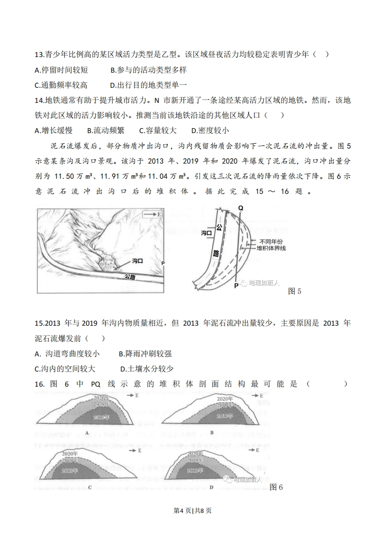 2023福建省普通高中学业水平选择性考试地理试题一、单项选择题:本大题共16小题,每小题3分,共48分。在每小题列出的四个选项中,只有一项是符合题目要求的。江苏省在改革开放以来在山上废弃矿坑养殖青虾,近年来,通过发展电商扩展销售,2018年以来陆续关闭一些污染严重的青虾养殖场,并由下游愿意付费的企业买单。根据材料回答1~3题。1.江苏选择山上矿坑养殖而非平原养殖的目的是()A.降低生产成本B.增加汇水面积C.避免占用耕地D.减少水土流失2.分析发展电商销售对于青虾养殖的促进作用()A.扩大养殖规模B.提高产量C.保证产品质量D.扩展销售渠道3.关闭污染养虾场后,下游付费意愿最高的企业是()A.高端康养产业B.传统种植业C.仓储运输业D.信息技术自然资源丰富的国家(或地区)若投入到自然资源开发及贸易的资金和劳动力过多,影响其他行业发展,可能导致经济发展缓慢,引发“资源诅咒”。当前俄罗斯油气技术装备的进口比例偏高。俄罗斯北极地区某自治区近年来大力开发油气资源和发展储运,其第三产业以劳动密集型为主。图1示意该区从业人口构成变化。据此完成4~5题。比例/%60①50②40302010③02010201220142016208年第1页共8页4.有人认为该区存在“资源诅咒”风险,若该结论成立,则图中序号代表()A.①第一产业,②第三产业B.①第三产业,②第二产业C①第二产业,③第三产业D.①第一产业,③第二产业5.中俄已就共建“冰上丝绸之路”达成共识,该区希望通过合作优先解决油气行业()A.技术支撑不足B环境污染严重C产量趋于下降D.从业人口短缺唐朝时期,吴淞江未形成较稳定的河道。北宋时期,吴江长提建成后,吴淞江河道日趋稳定,成为太湖的主要泄洪通道。近代以来,吴淞江成为上海港体系的一部分。图2示意唐代以来太湖东部水系的演变过程。据此完成6~8题。…府期时期河湖岸线-一=北宋时期河湖岸线现代太湖岸线北宋以后淤积区nnnn吴江长堤(5km山运河地理加班)6.晚唐诗人许浑泛舟吴淞江,留下了“杨柳北归路,兼葭(芦苇)南渡舟"的诗句。诗中所述河段南北两侧植被差异的主要影响因素是()A.坡向B.热量B.C.堆积状况D.盛行风向7.北宋时期吴江长堤建成导政()A.长堤以西河湖淤积加强B.吴淞江输沙量减少C.长堤以东湖水冲刷加强D.吴淞江径流量减少8.近代以来吴淞江逐渐成为上海的“米粮要道”,主要原因是()A.吴淞江航道条件改善B.上海工商业发展C.吴淞江防洪能力提高D.上海港泊位不足局部强降雨后,太阳光线以一定的角度投射在雨幕上可能形成彩虹。图3示意彩虹最高视点与太阳高度角()的关系。据此完成9~11题。第2页共8页